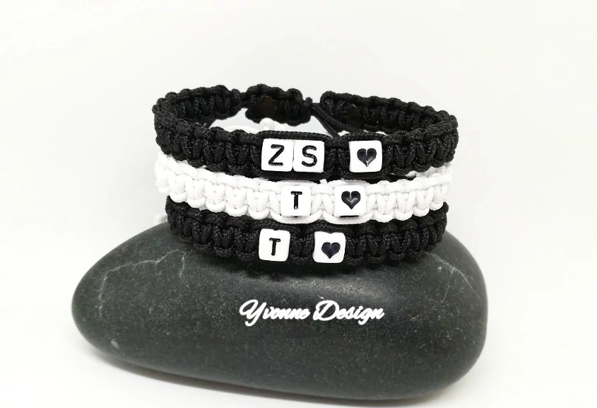 Gyönyörű egyedi, vékony parakord zsinórból font 3 külön álló karkötőt tartalmazó  karkötőszett. A 3 karkötőn lévő monogrammot a vásárlás végén Te adod meg, kérlek mellékeld, hogy melyik karkötőt fogja férfi és melyiket nő viselni.