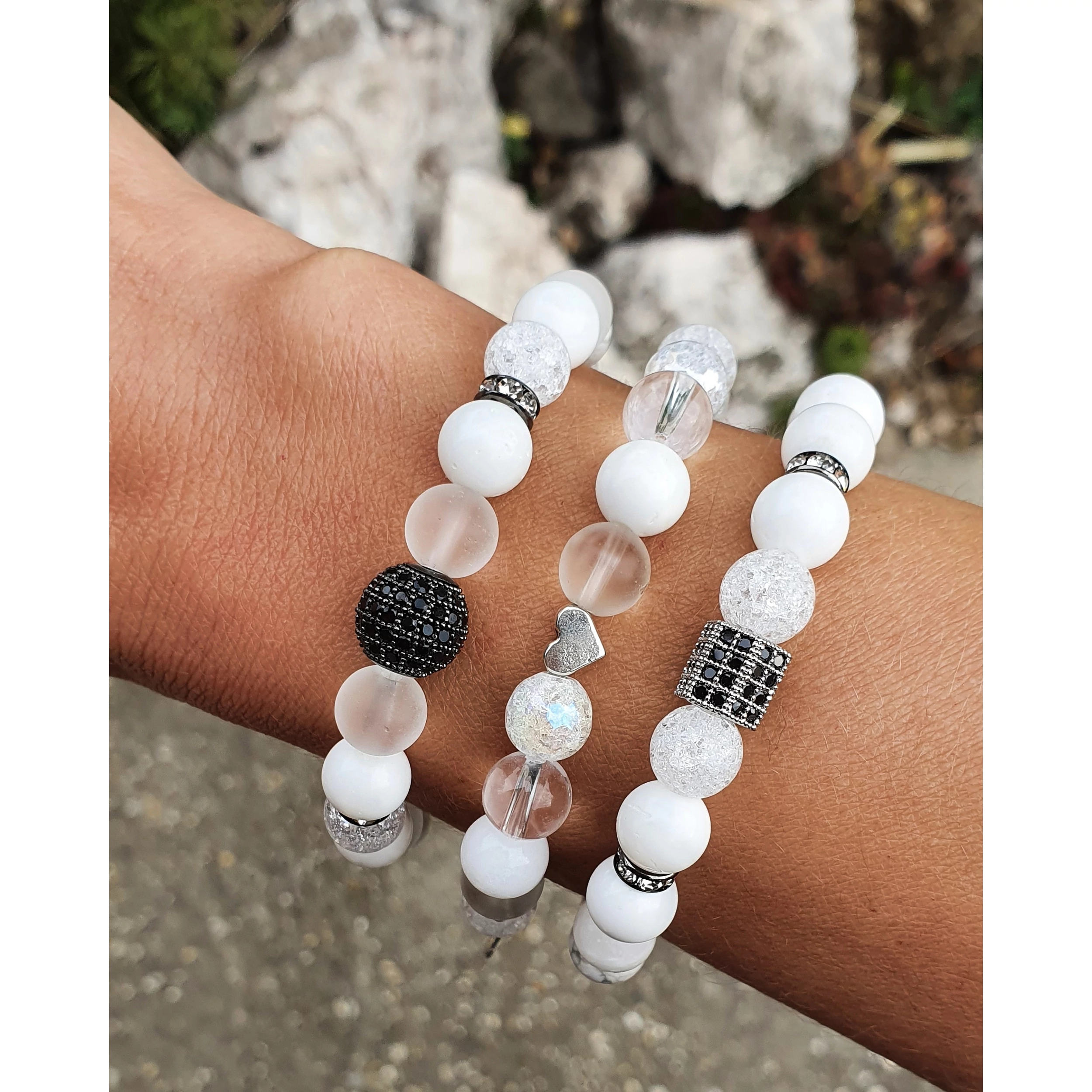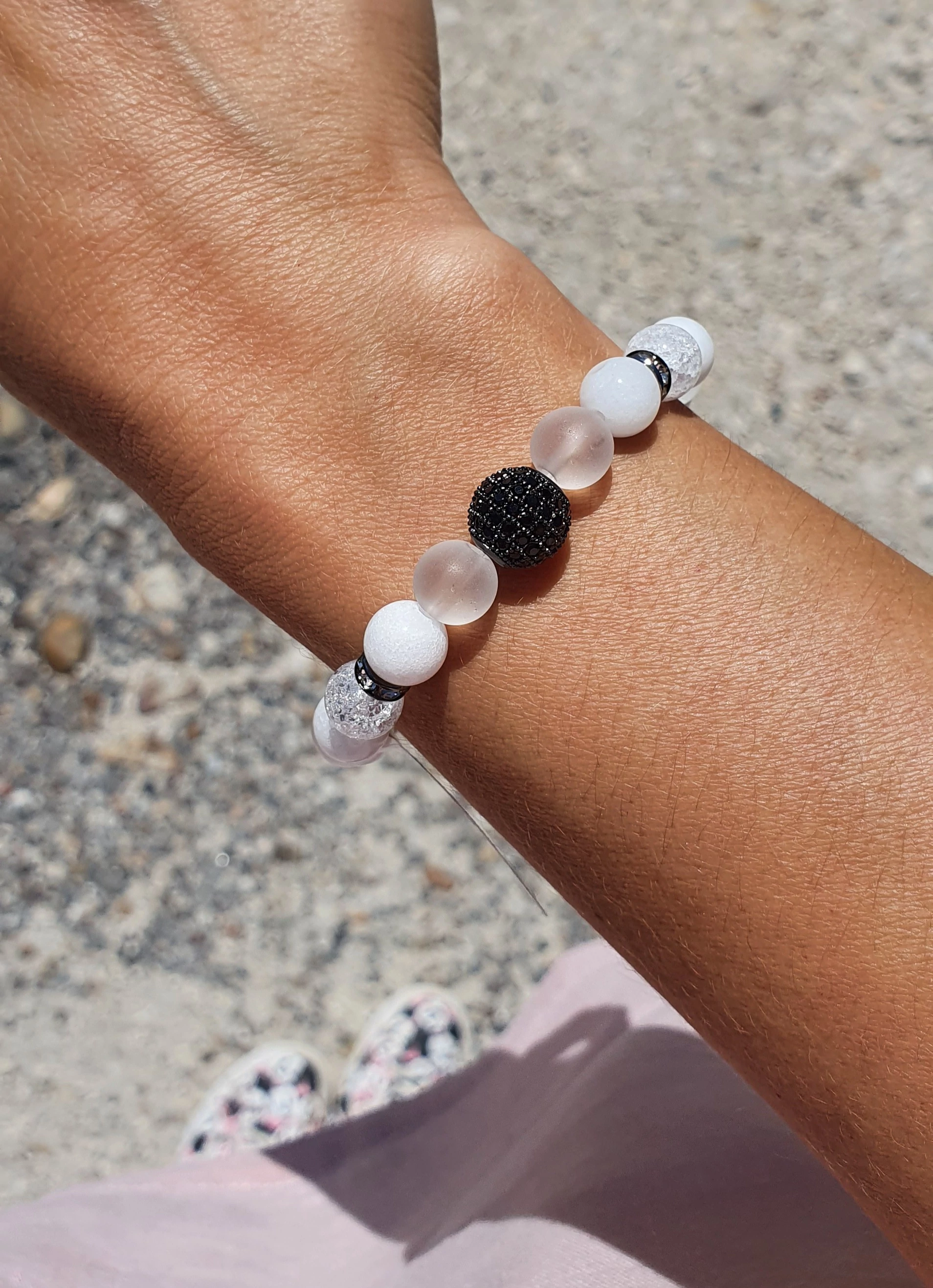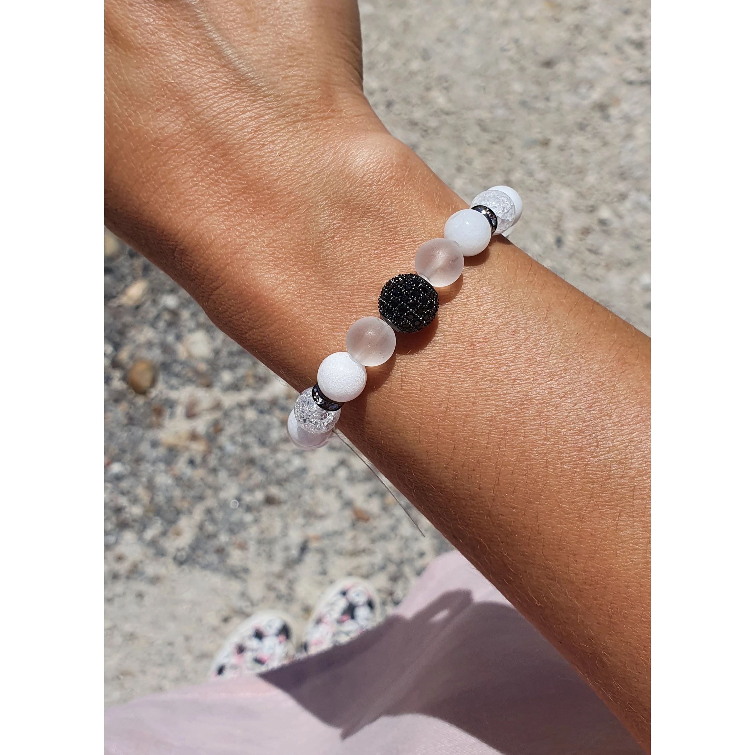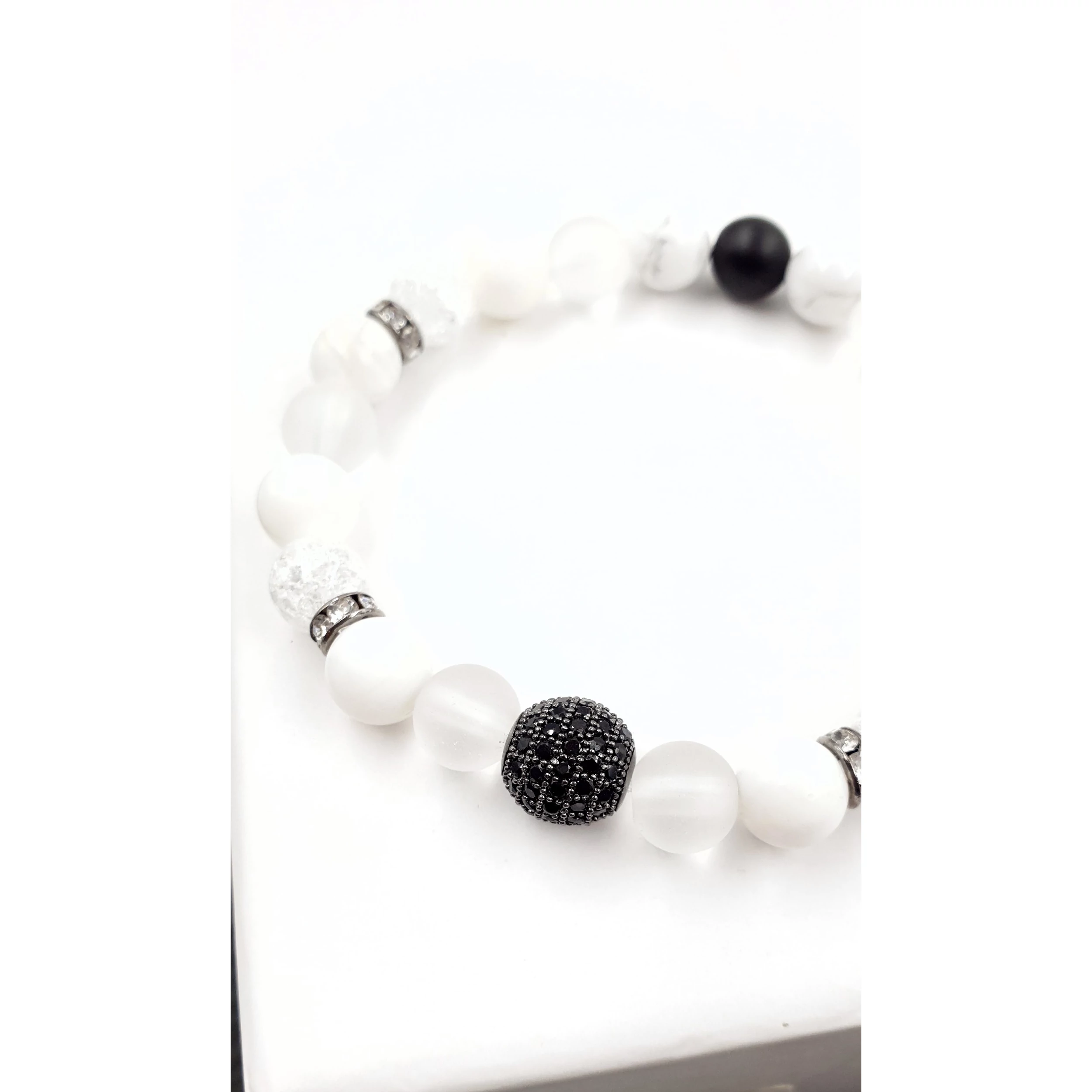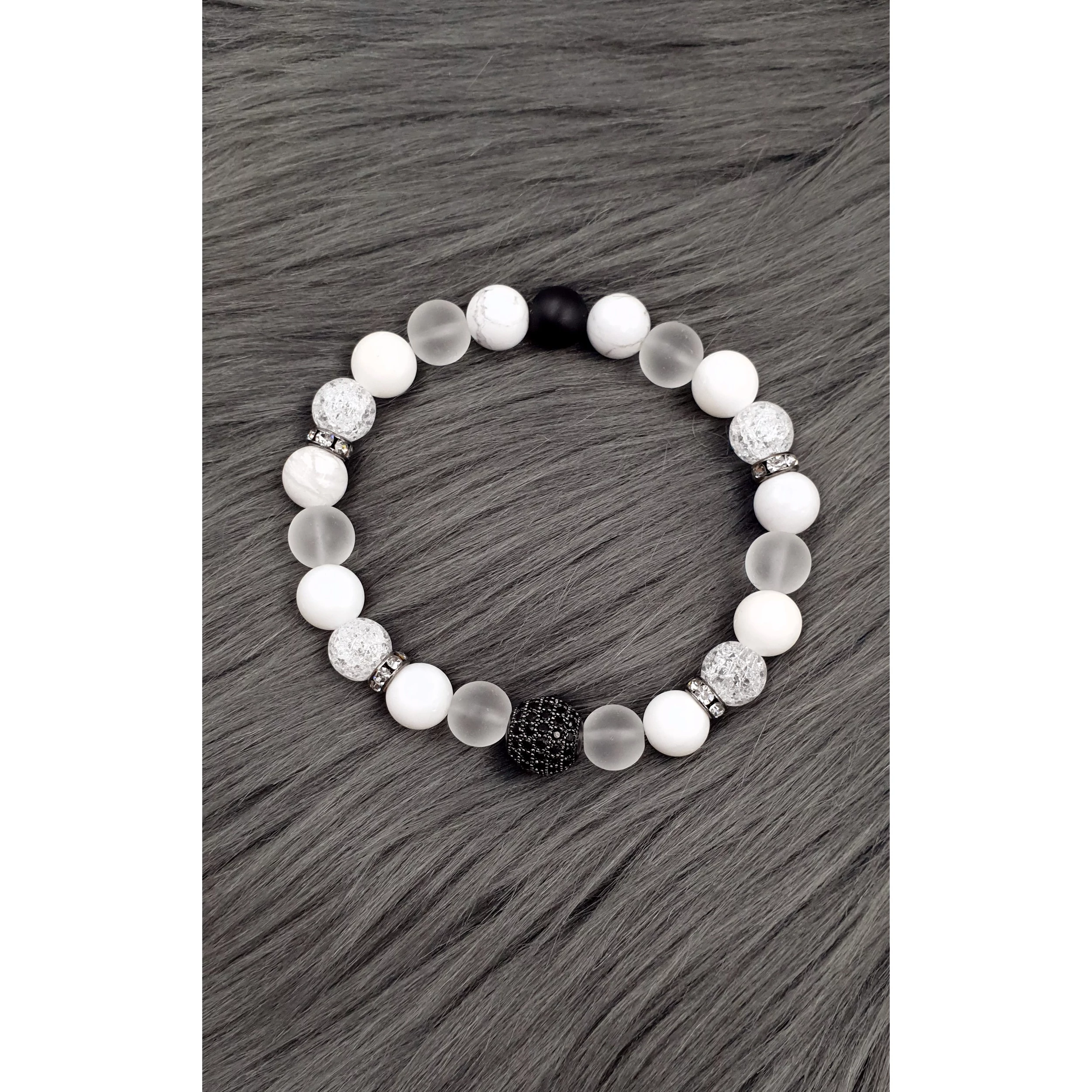 Gyönyörű egyedi LUXURY ásványkarkötő howlit és hegyikristály ásványokból, fekete cirkon gömb medál díszítéssel.
