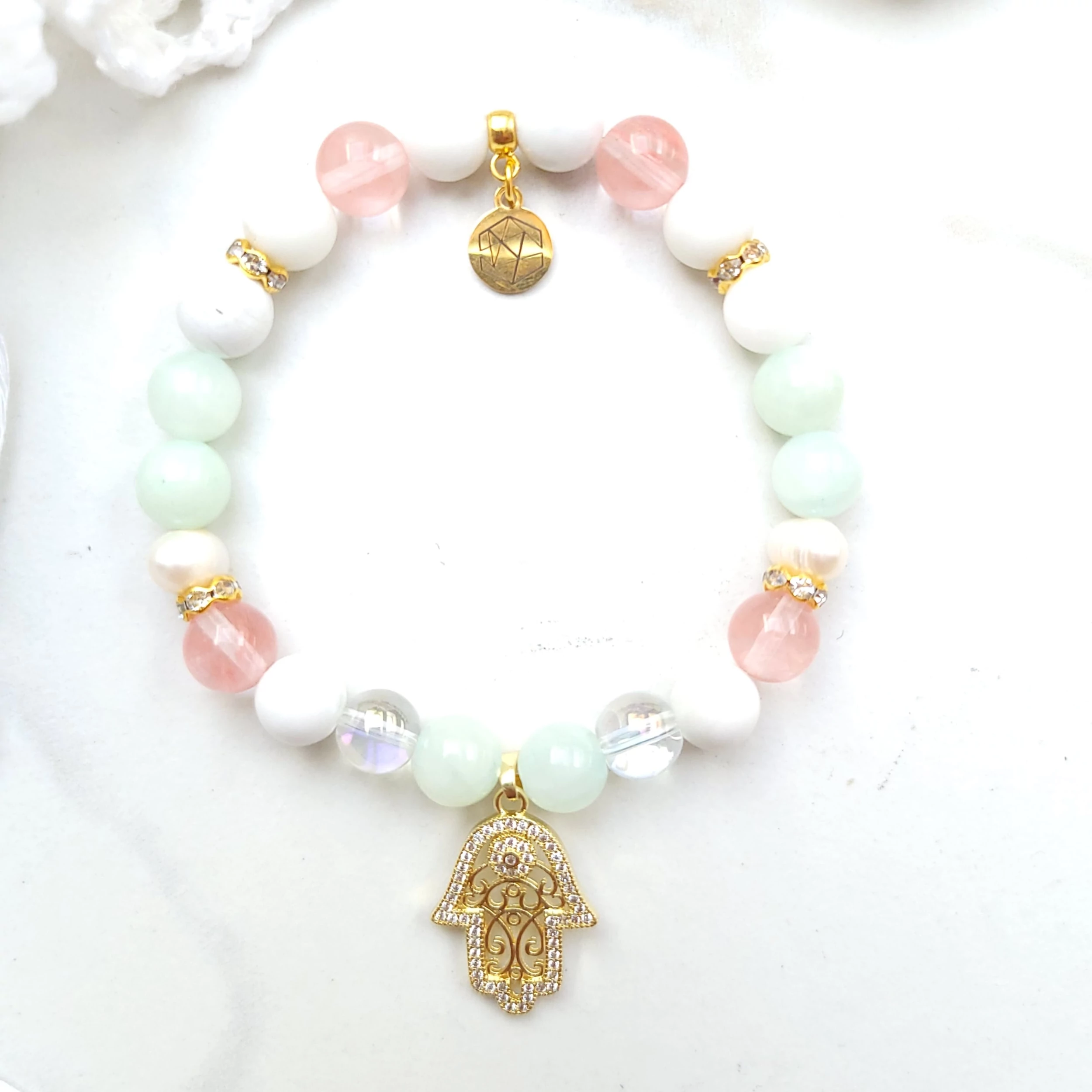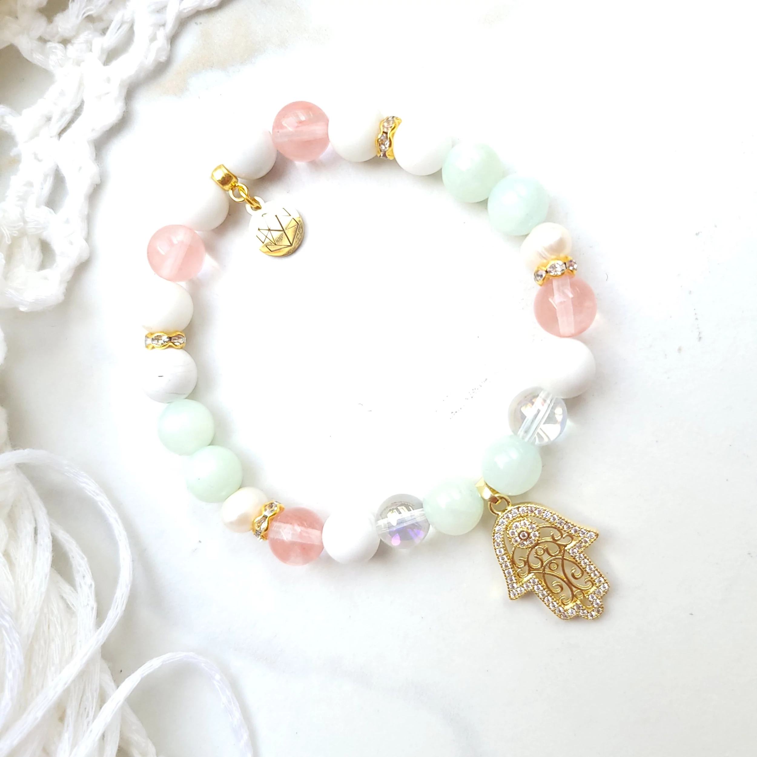 Gyönyörű egyedi tervezésű LUXURY ásványkarkötő, mely hegyikristály, tejkvarc, jáde ásványokból készült, arany díszítéssel és hamzsakéz medállal.