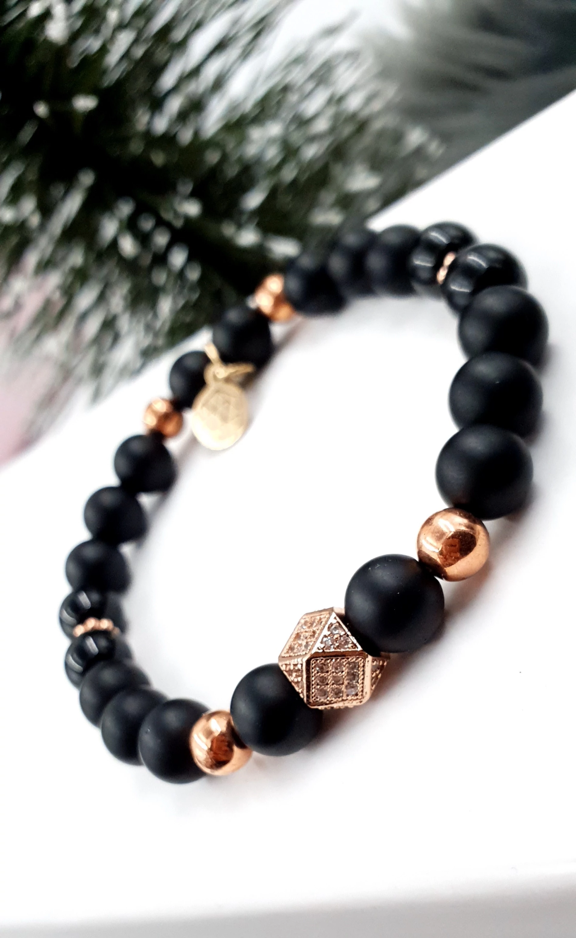 Gyönyörű egyedi LUXURY ásványkarkötő ónixból készült ásványkarkötő rosegold szín díszítéssel és cirkon medállal.