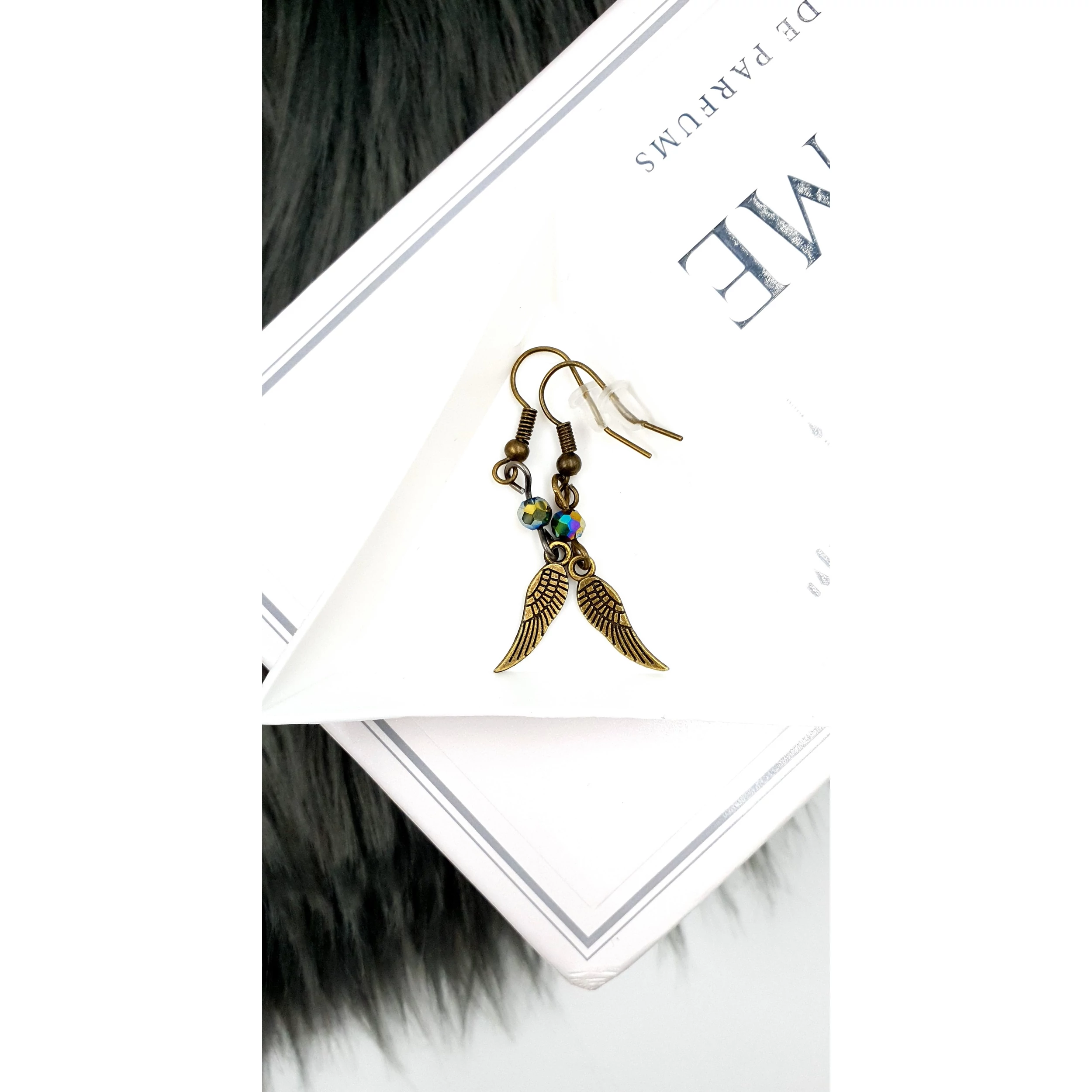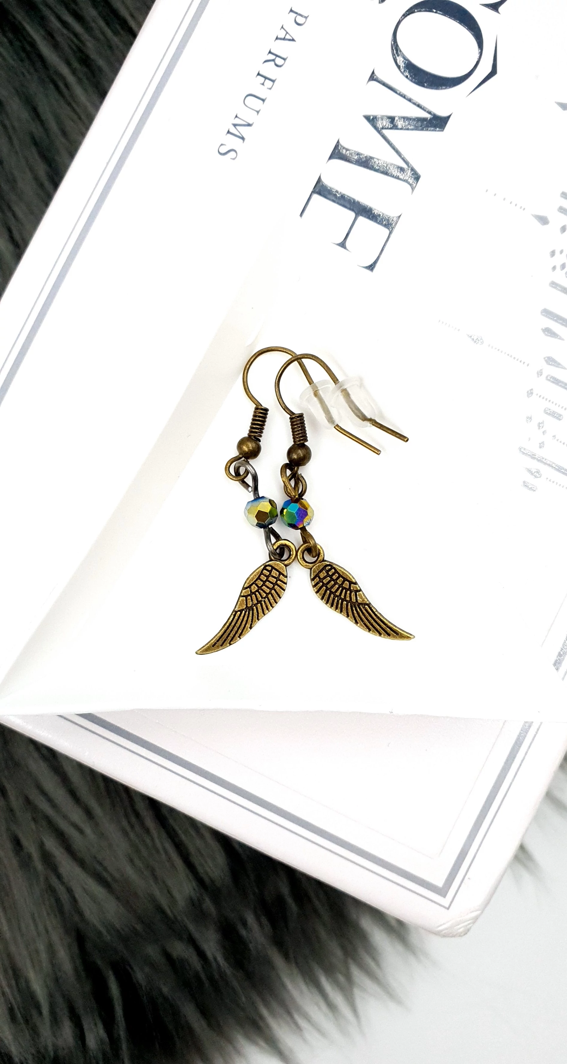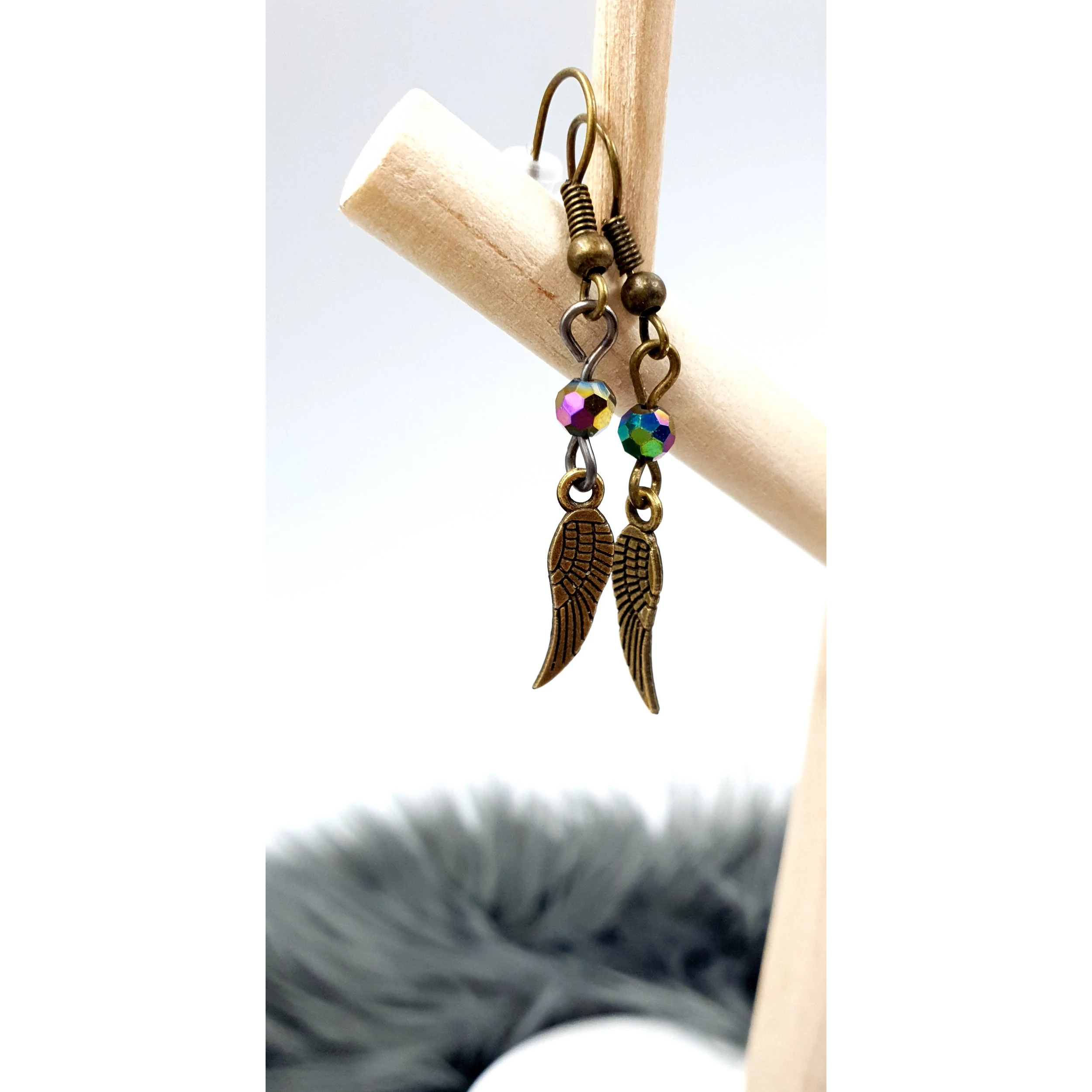 Kézzel készített Angyalszárny "bronz" gyöngyös fülbevaló, apró szivárványhematit kristállyal díszítve.