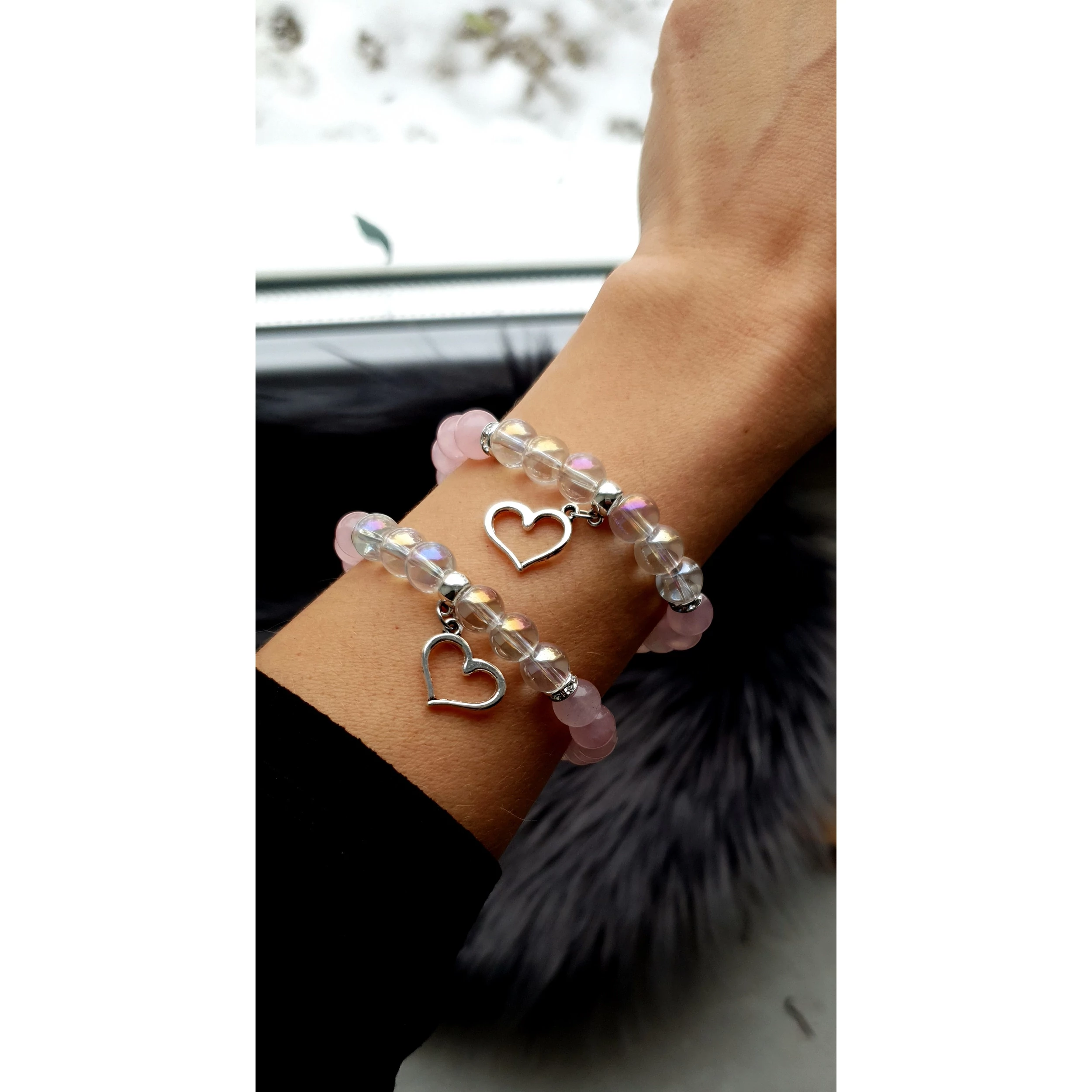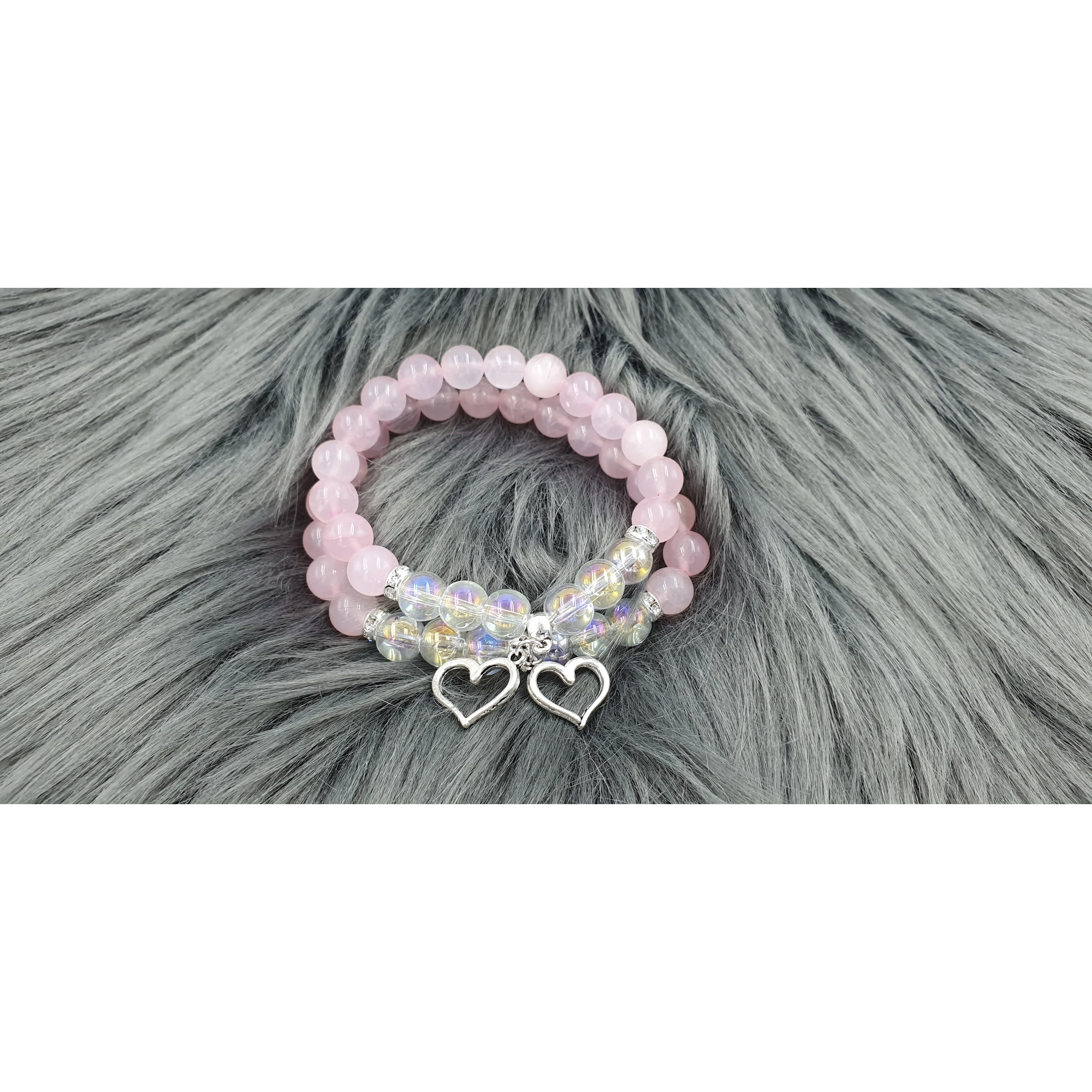 Gyönyörű szívecske medálos rózsakvarc és tündöklő szivárványos átlátszó hegyikristály ásványokból készített karkötőpár Anya és Lánya részére, mely a szeretetet és az össze tartozást jelképezi az Édesanya és lánya között. A termék ára egy pár (2 db) karkötőre vonatkozik. Ehhez a termékhez ajándék díszdoboz jár.