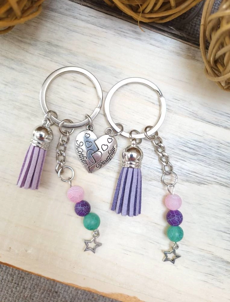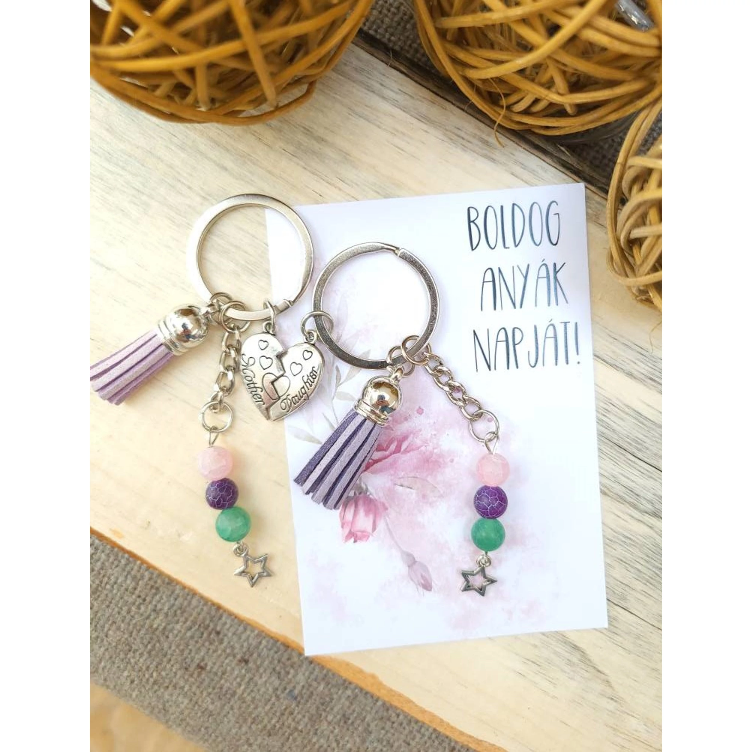 Anya-Lánya kulcstartópár feliratos kártyával. Mother & Daughter feliratos félbetört szíves kulcstartópár anya és lánya részére, gyöngyös díszítéssel.