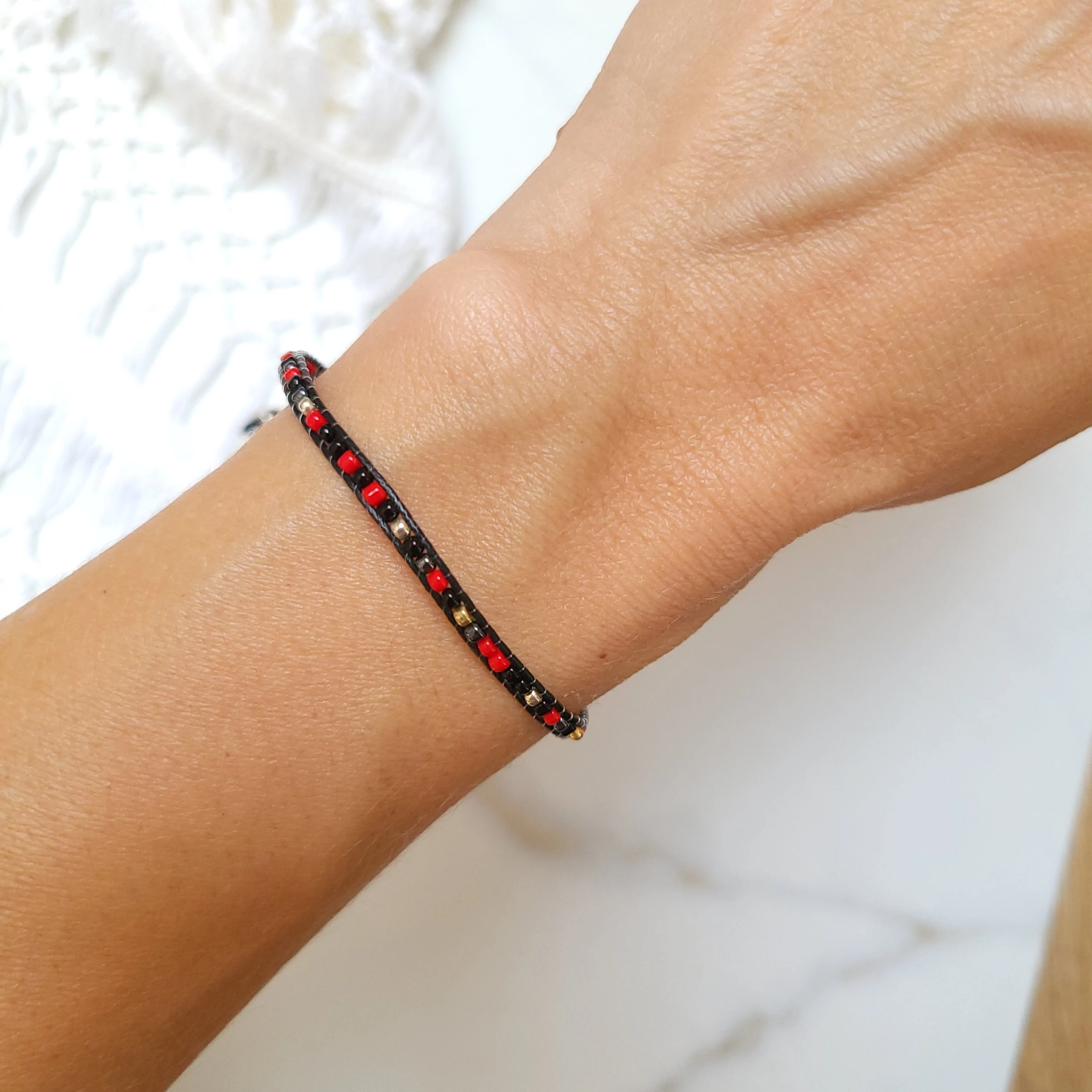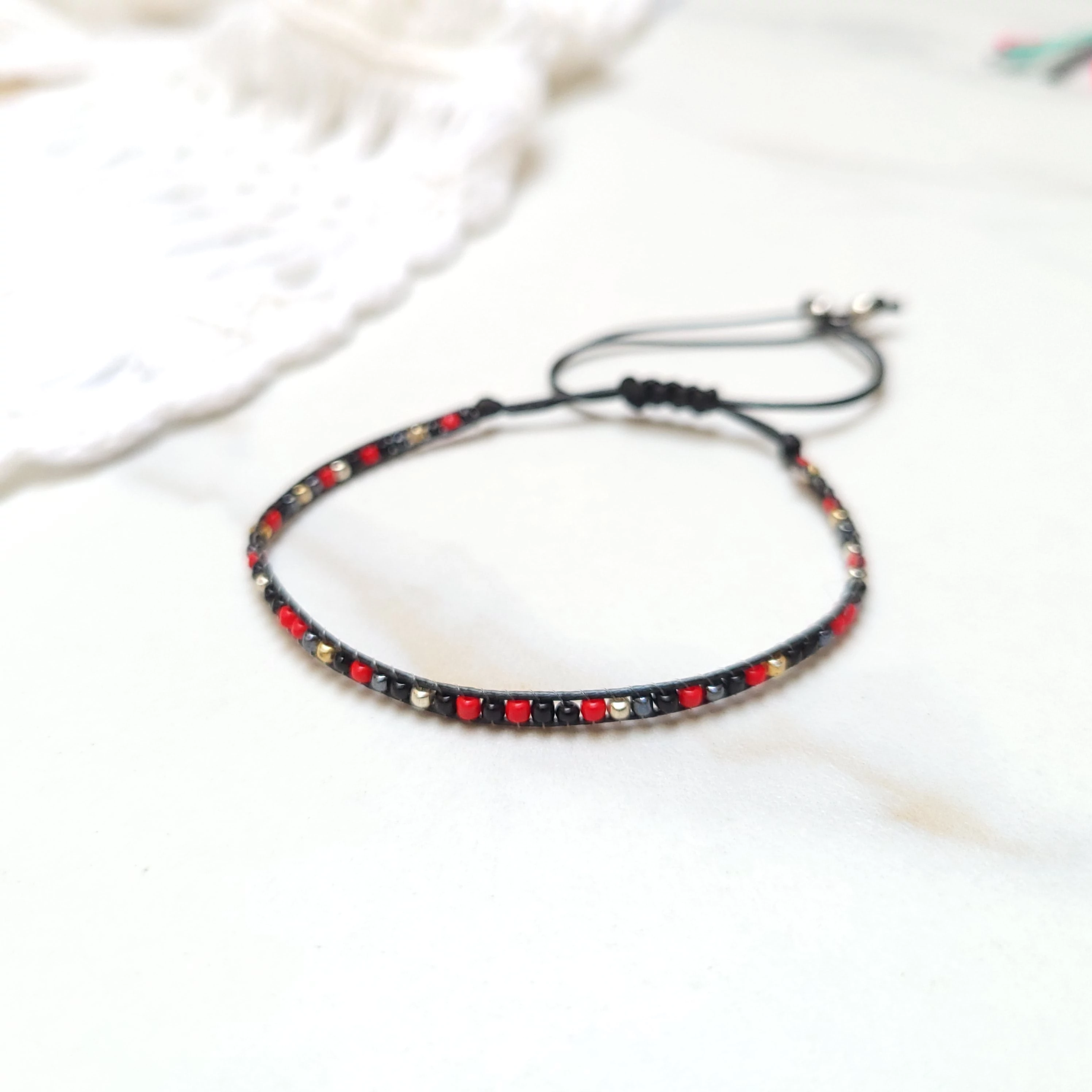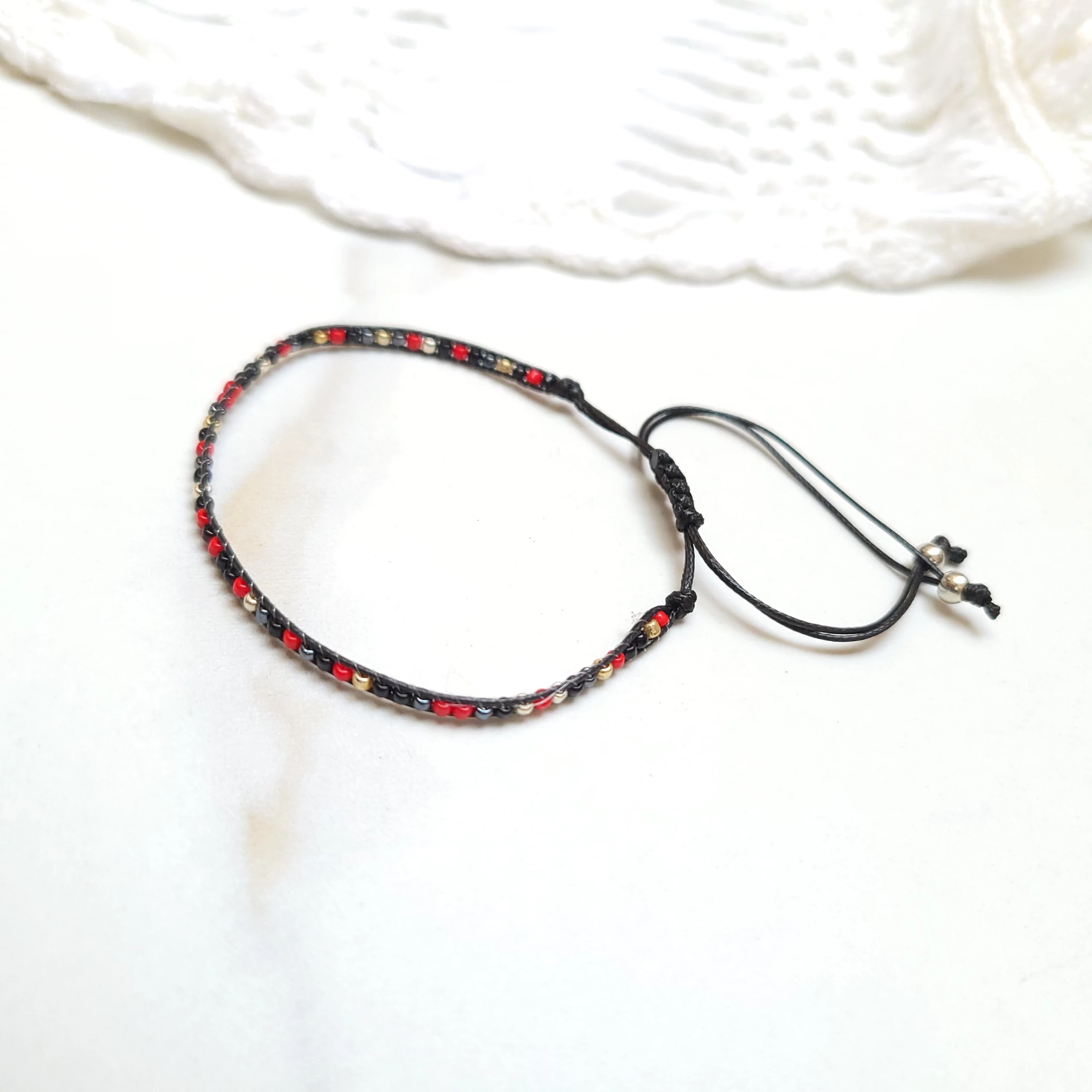 Piros, fekete, ezüst apró gyöngyös barna zsineg karkötő. A méretük állítható a behúzó szárakkal 15 cm-24 cm között.