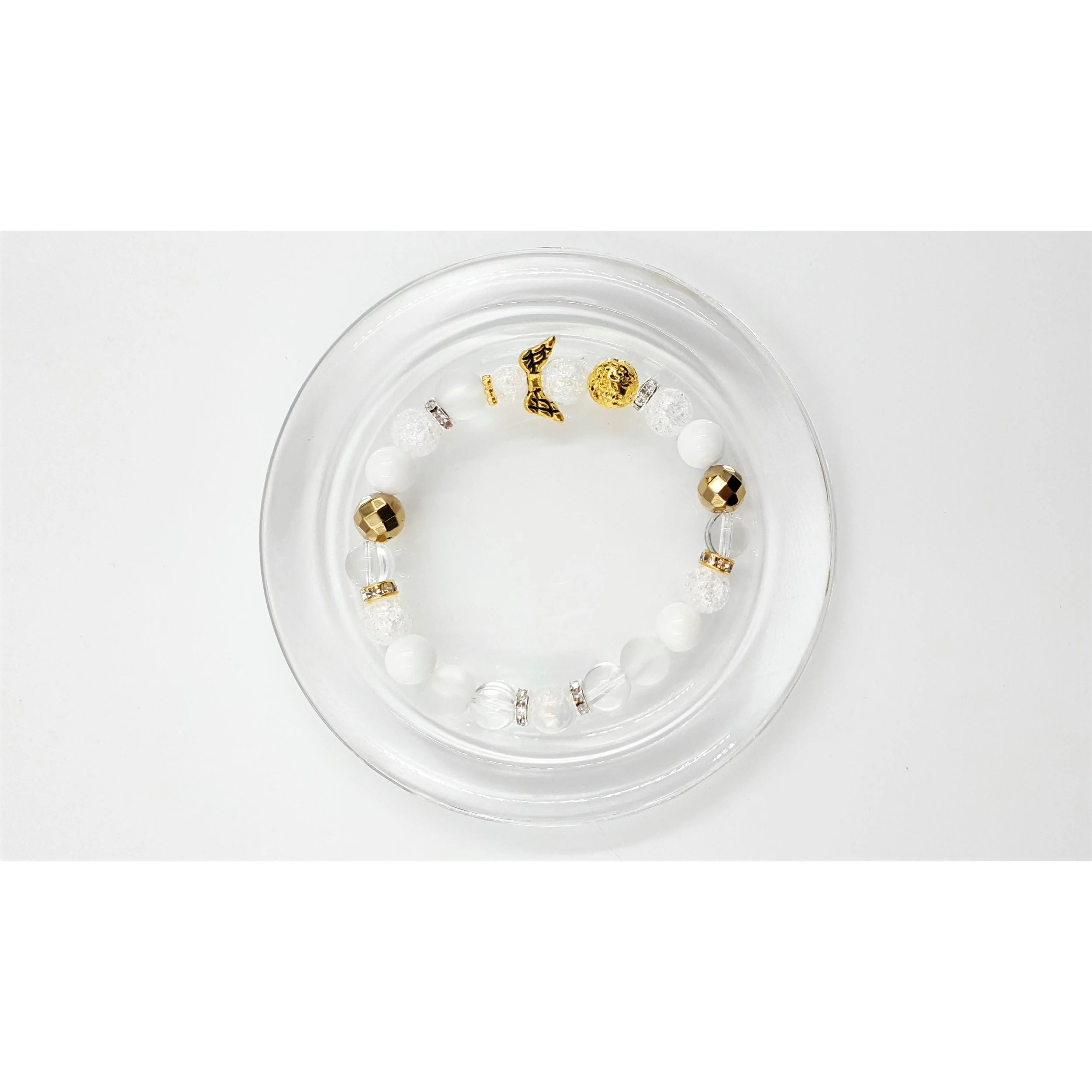 Aura hegyikristály, hegyikristály, arany hematit, és arany lávakő ásványokból készült karkötő, arany szín díszítéssel és egy angyal medállal.