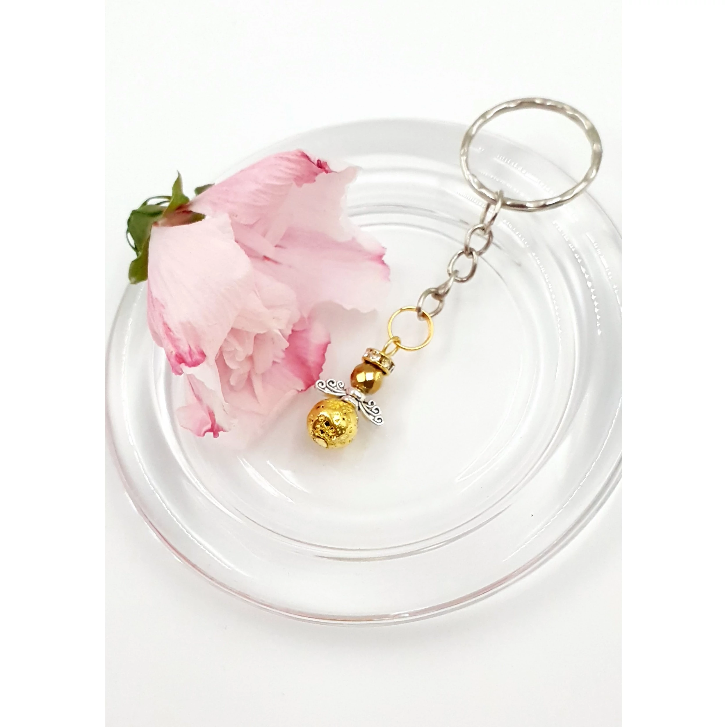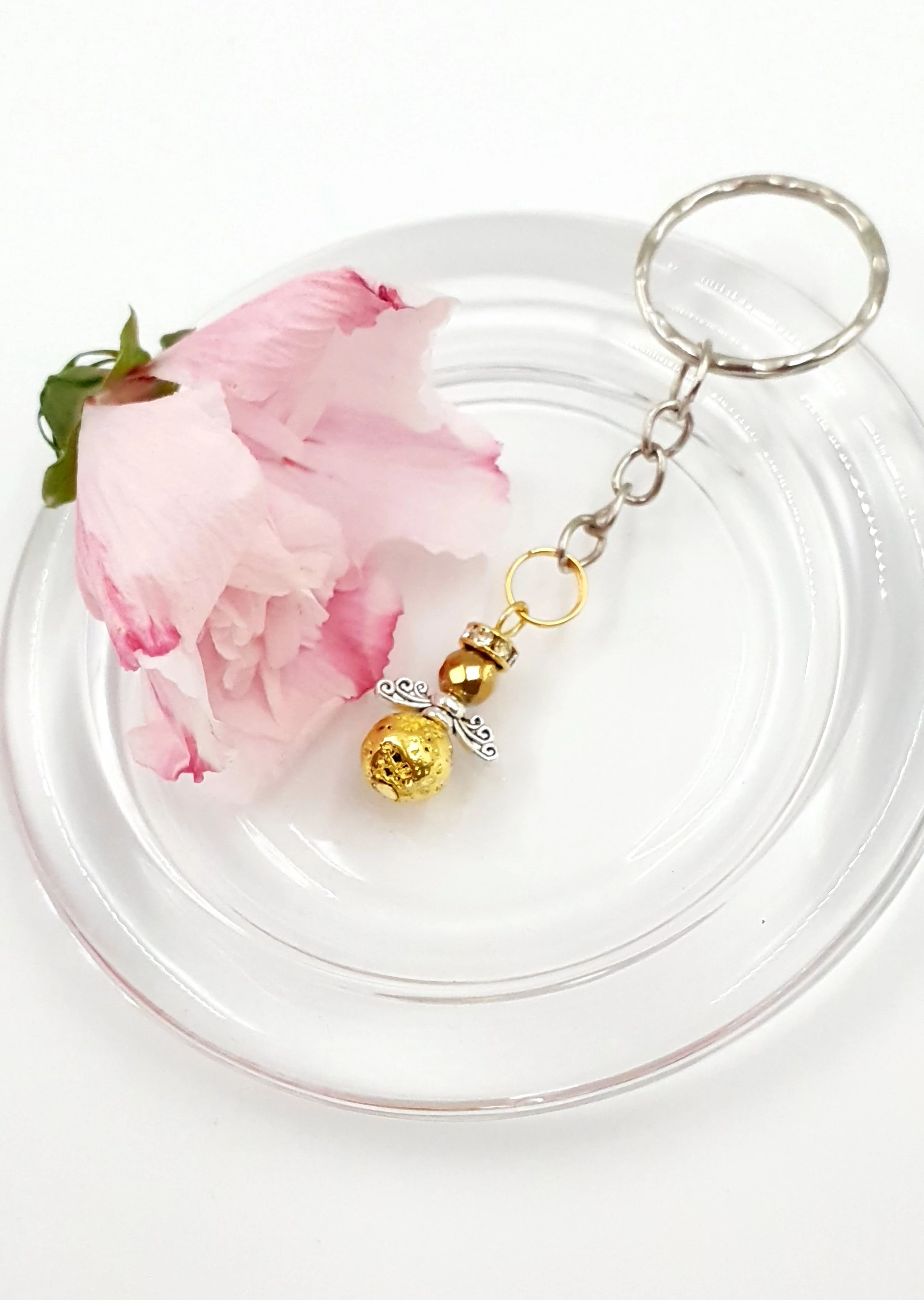 Arany lávakő angyal kulcstartó ásványgyöngyökből.