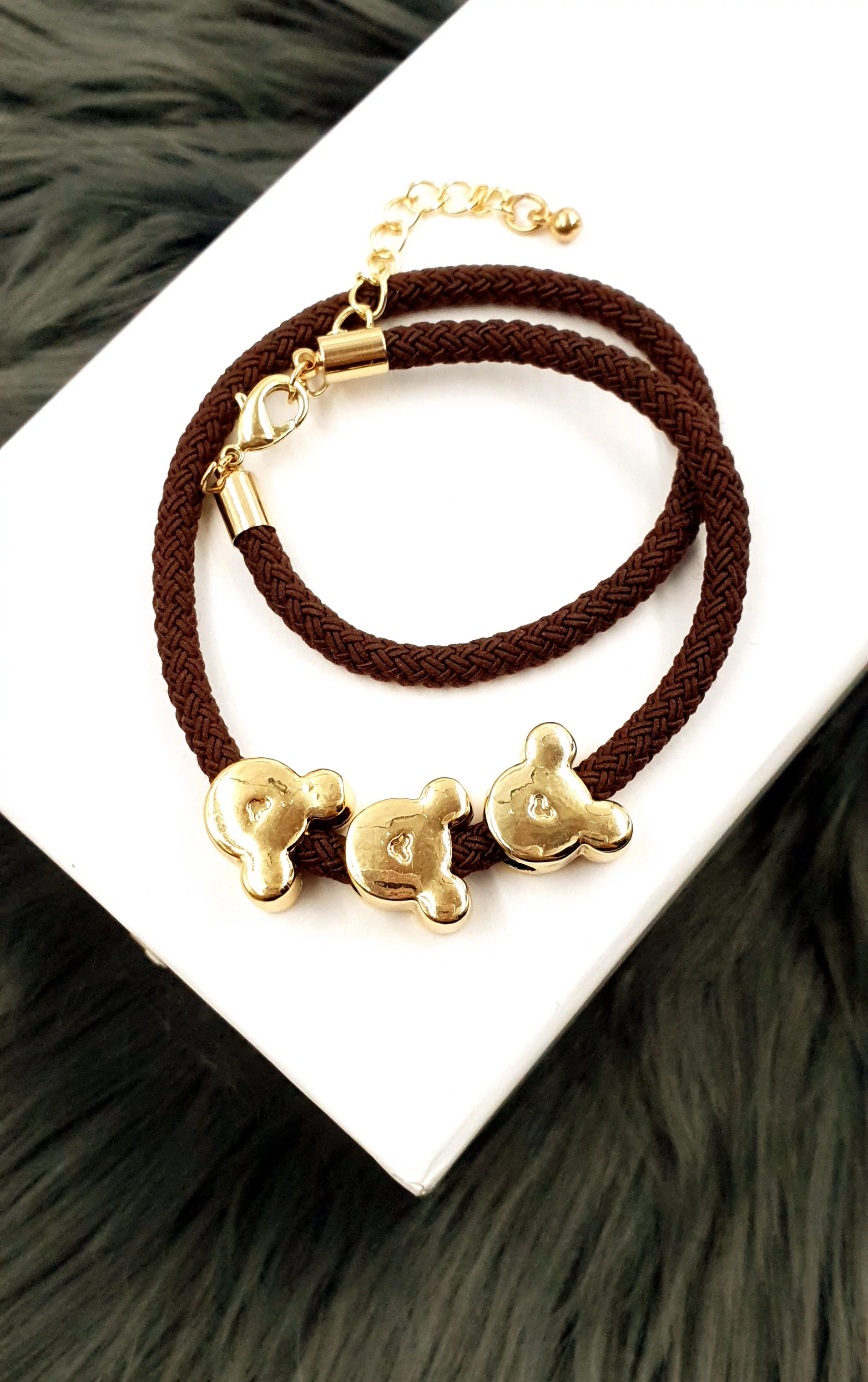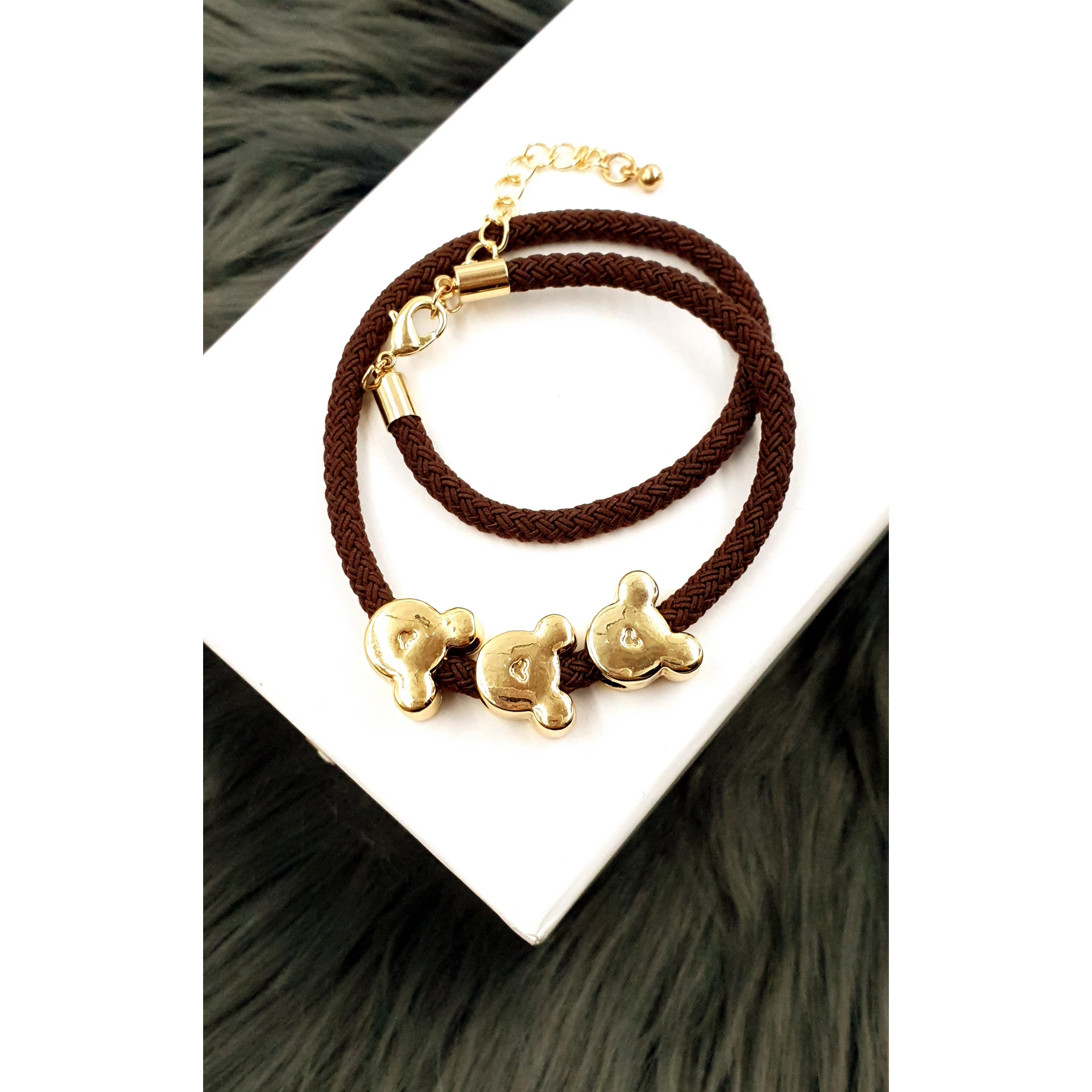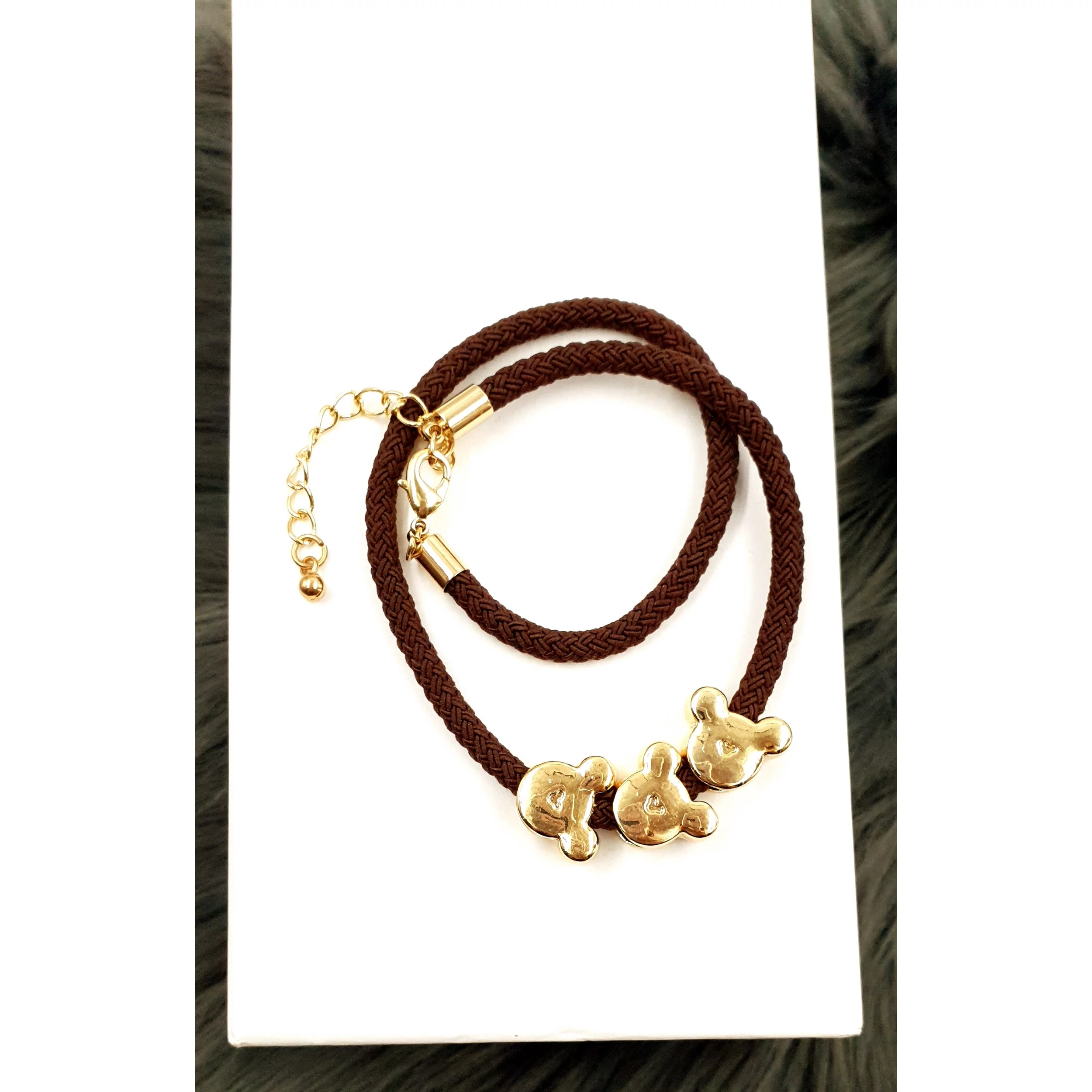 Dupla soros aranyszín, 3 db Minnie fejet tartalmazó karkötő, barna zsinórral  A méretük állítható 18 cm-28 cm között.
