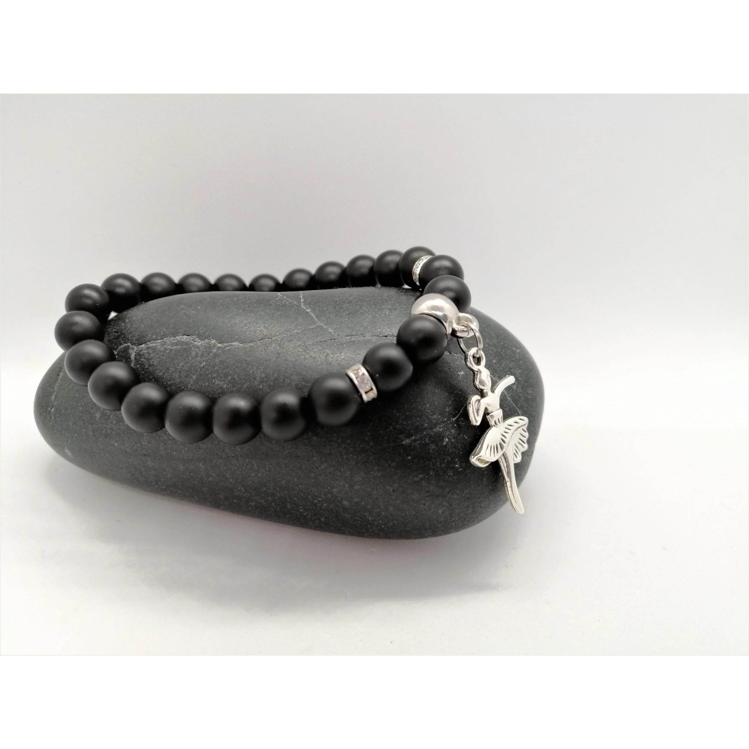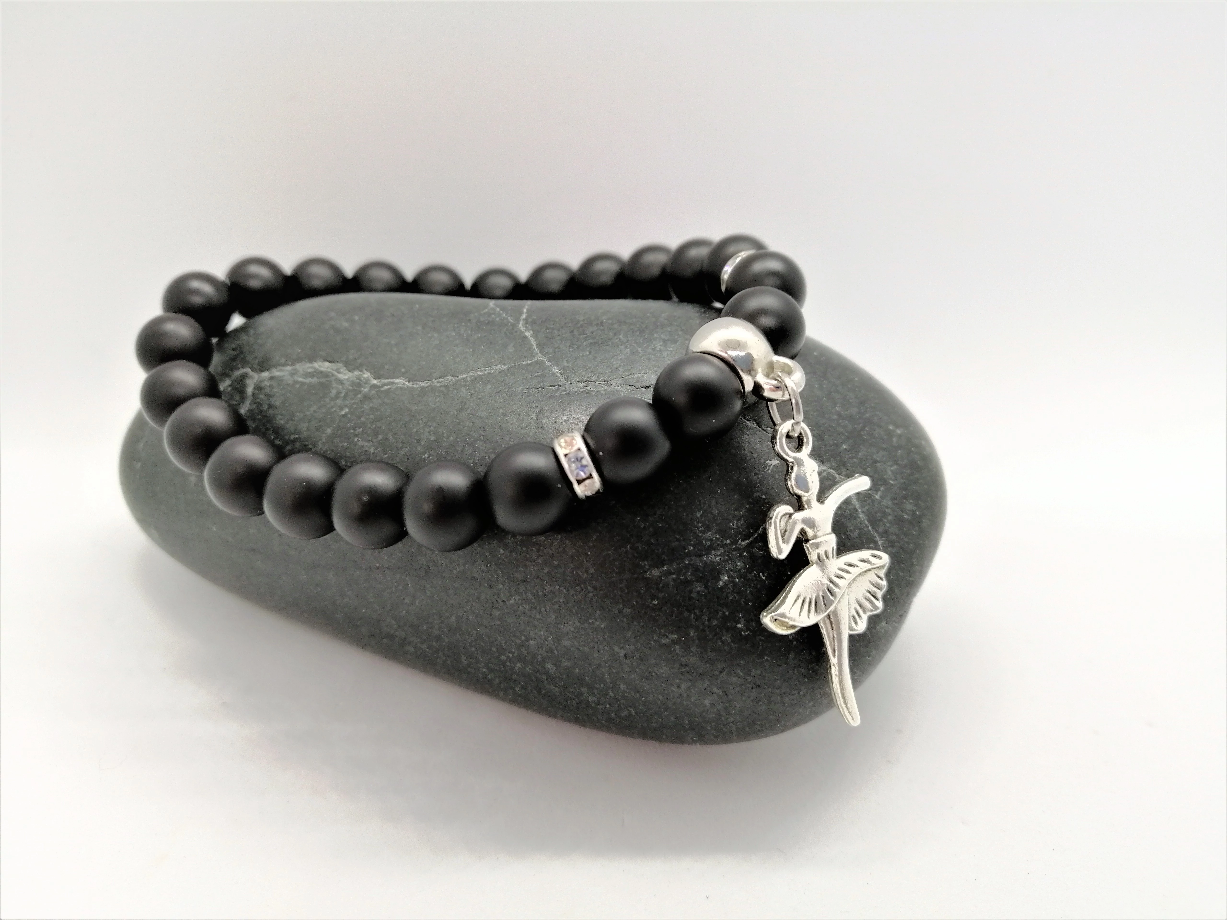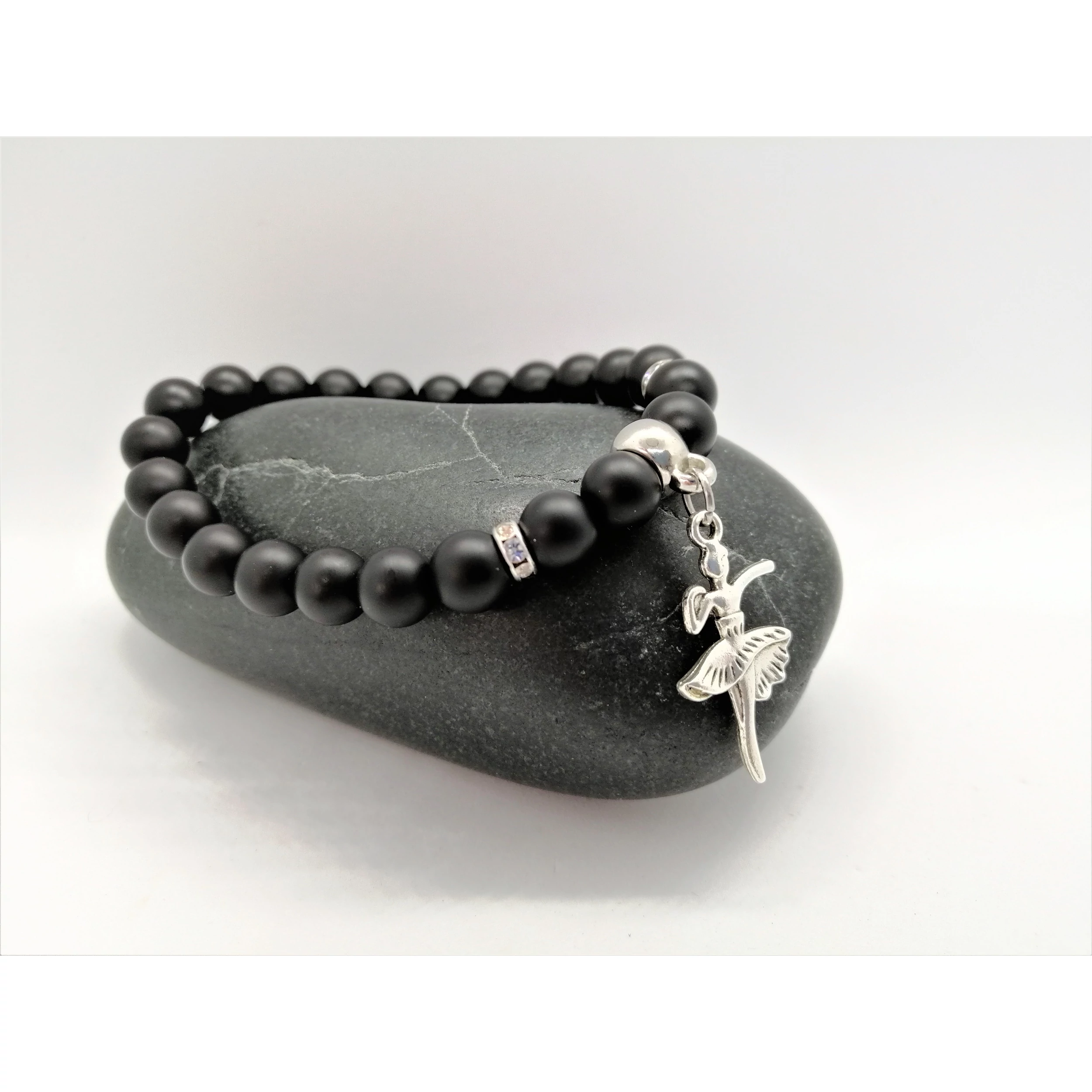 Ez egy egyedi tervezésű matt ónix ásványgyöngyökből készült karkötő, balerina medállal.