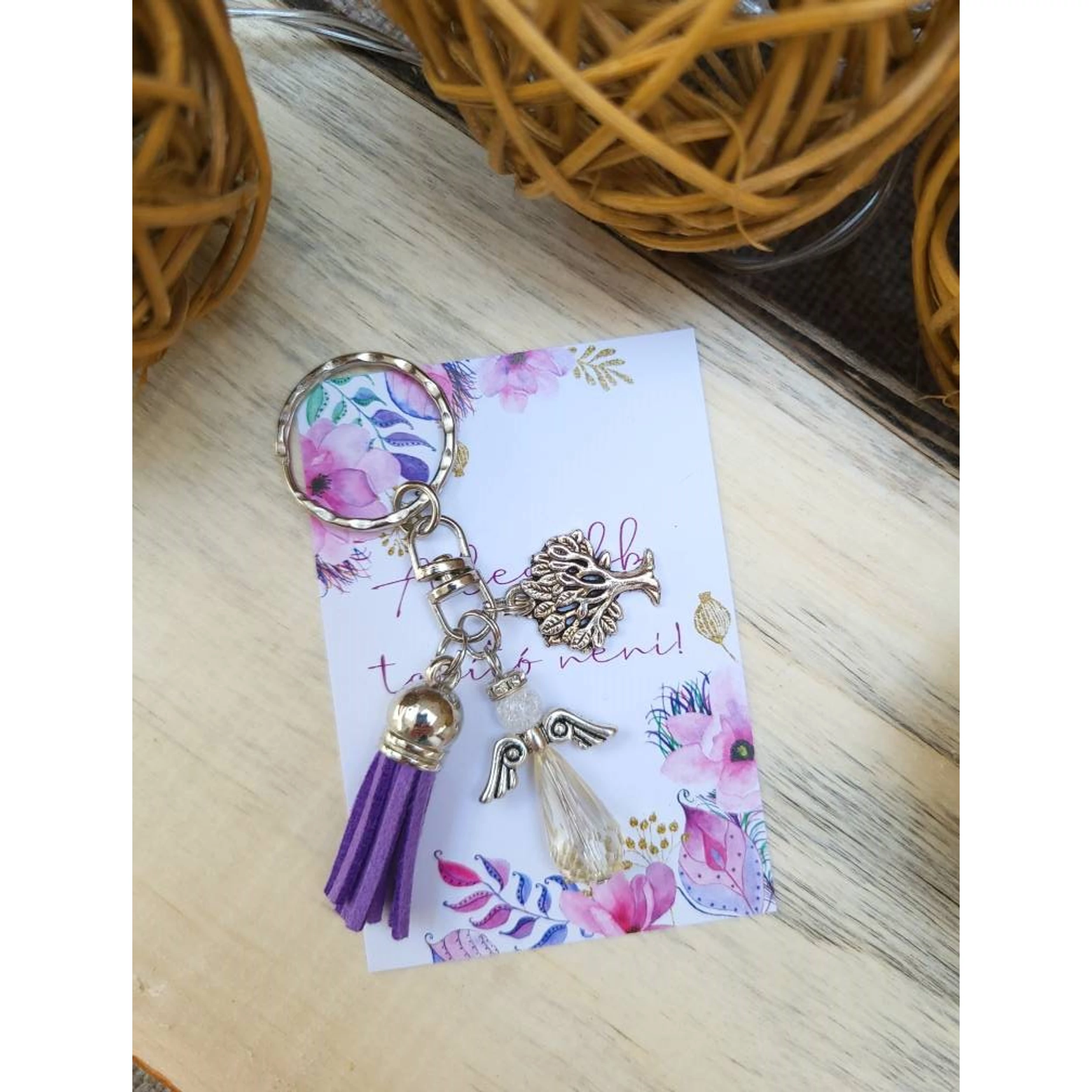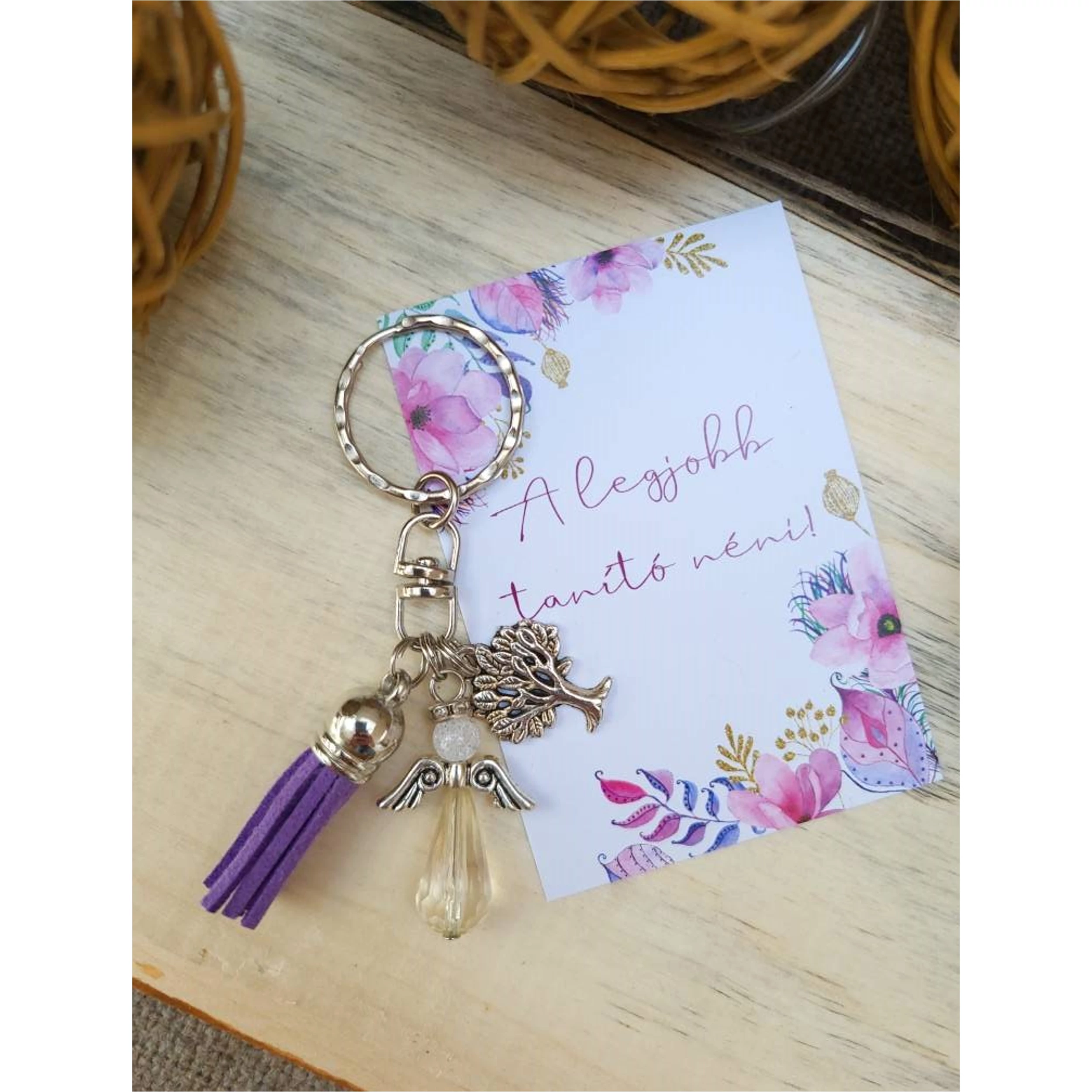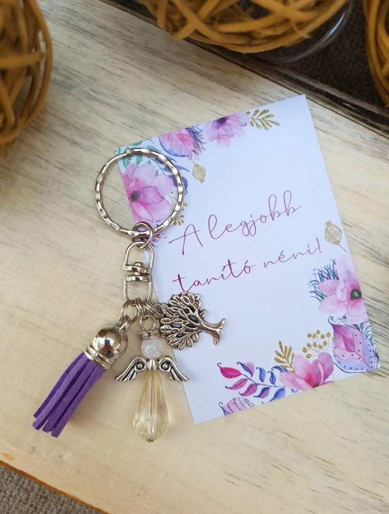 Ballagási ajándék tanító néninek - lila színvilággal. Angyalkás kulcstartó, életfa medállal és lila színű bojttal.