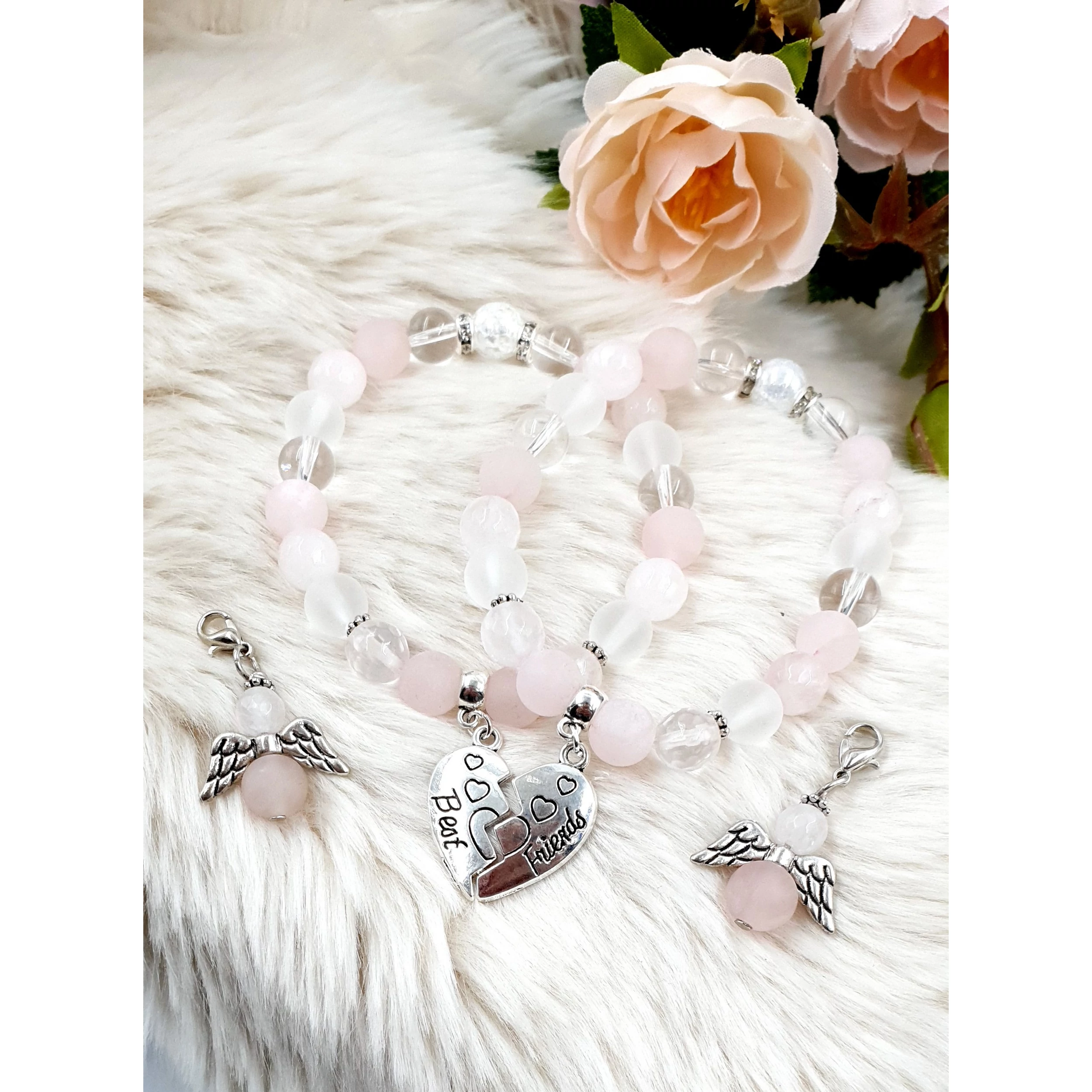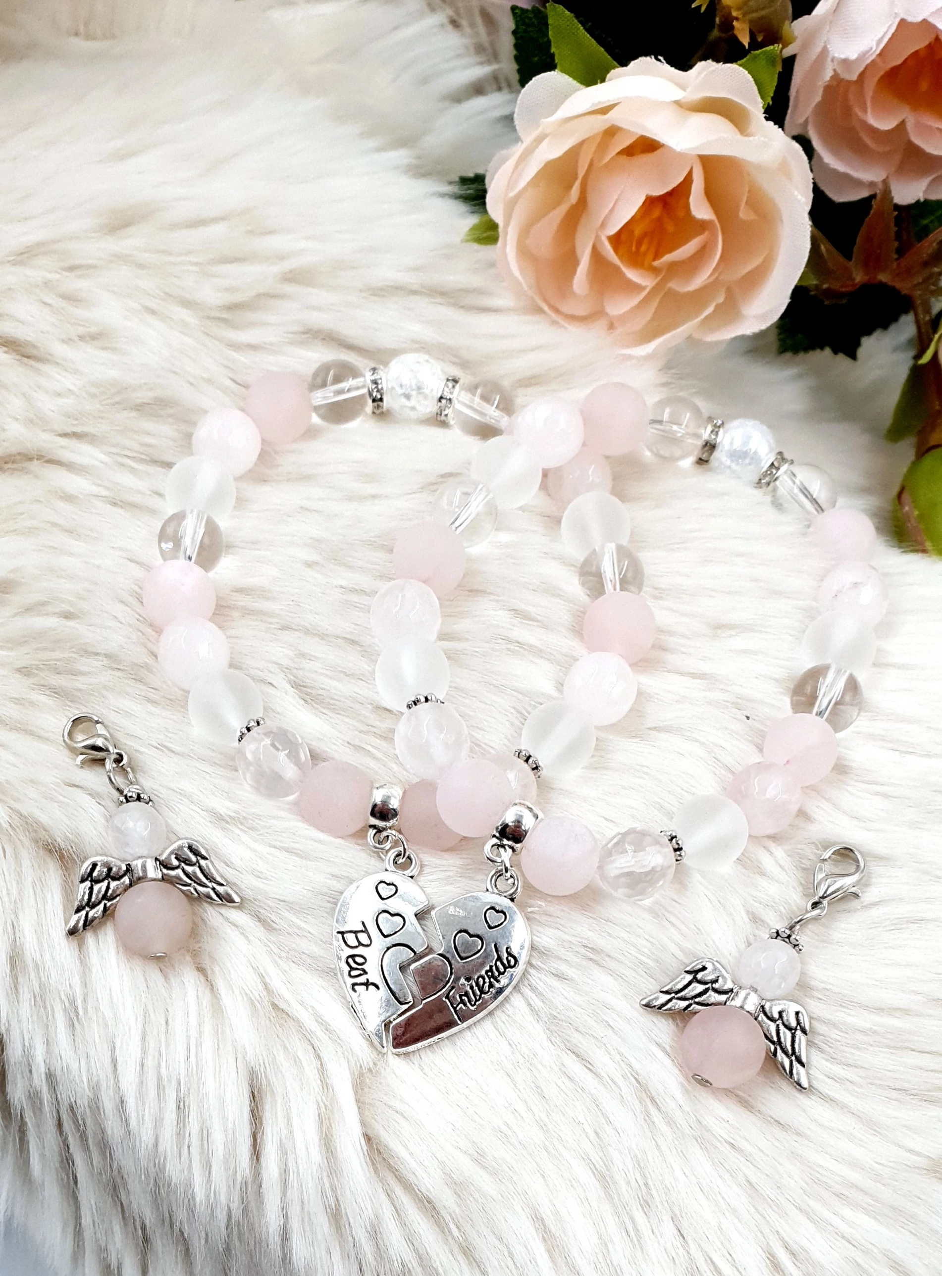 Teljesen egyedi, "Best Friends" páros ásványkarkötőszett angyalka táskadísszel.
