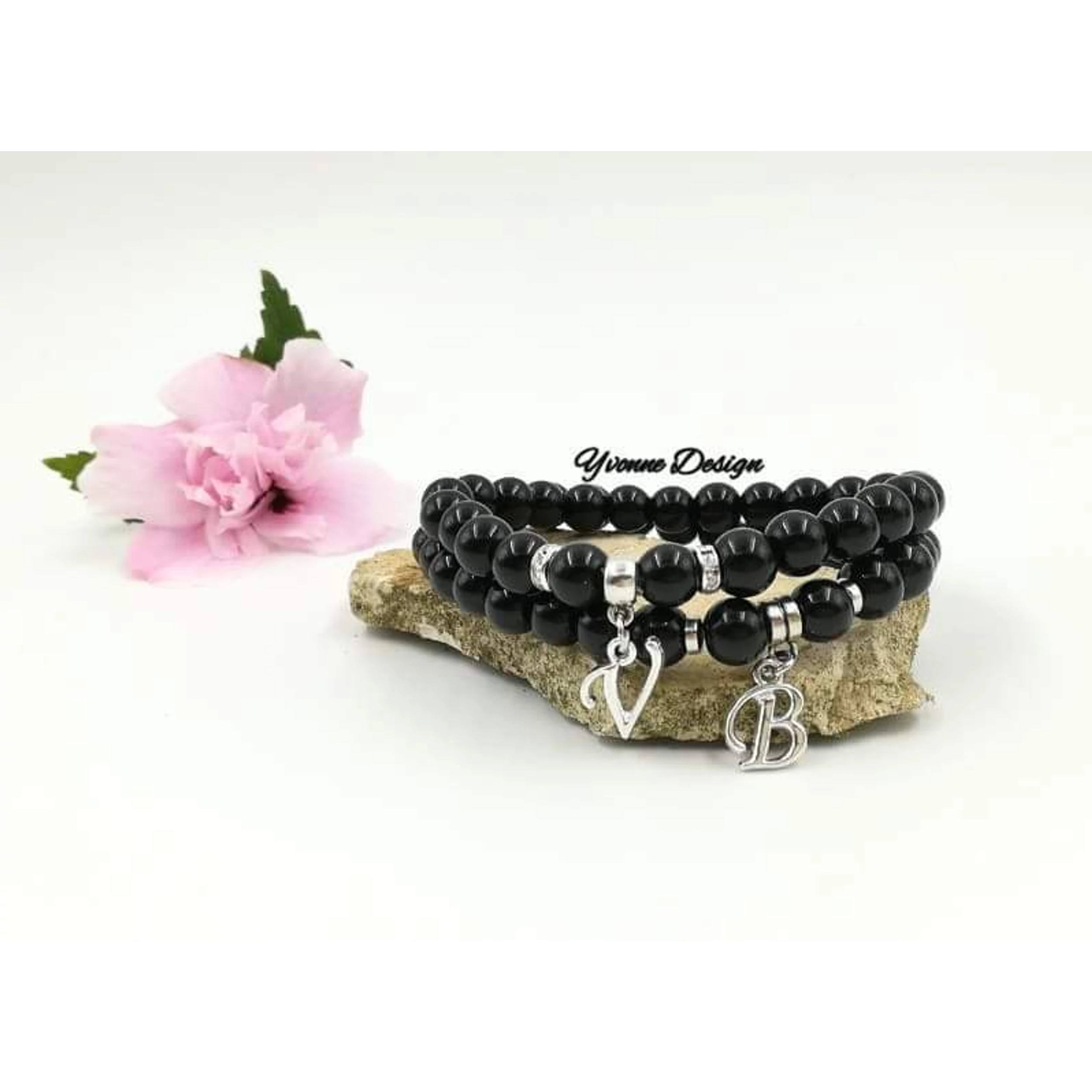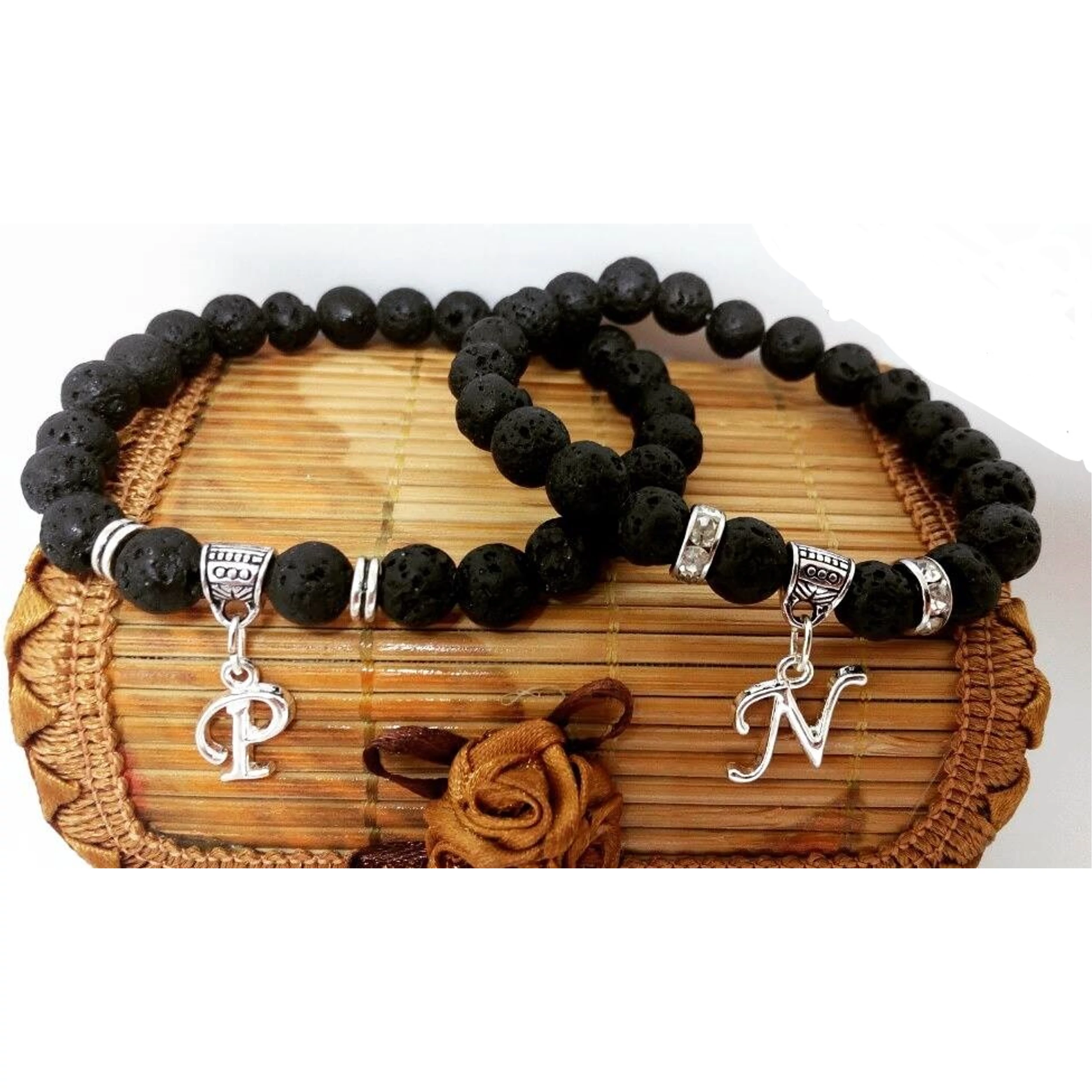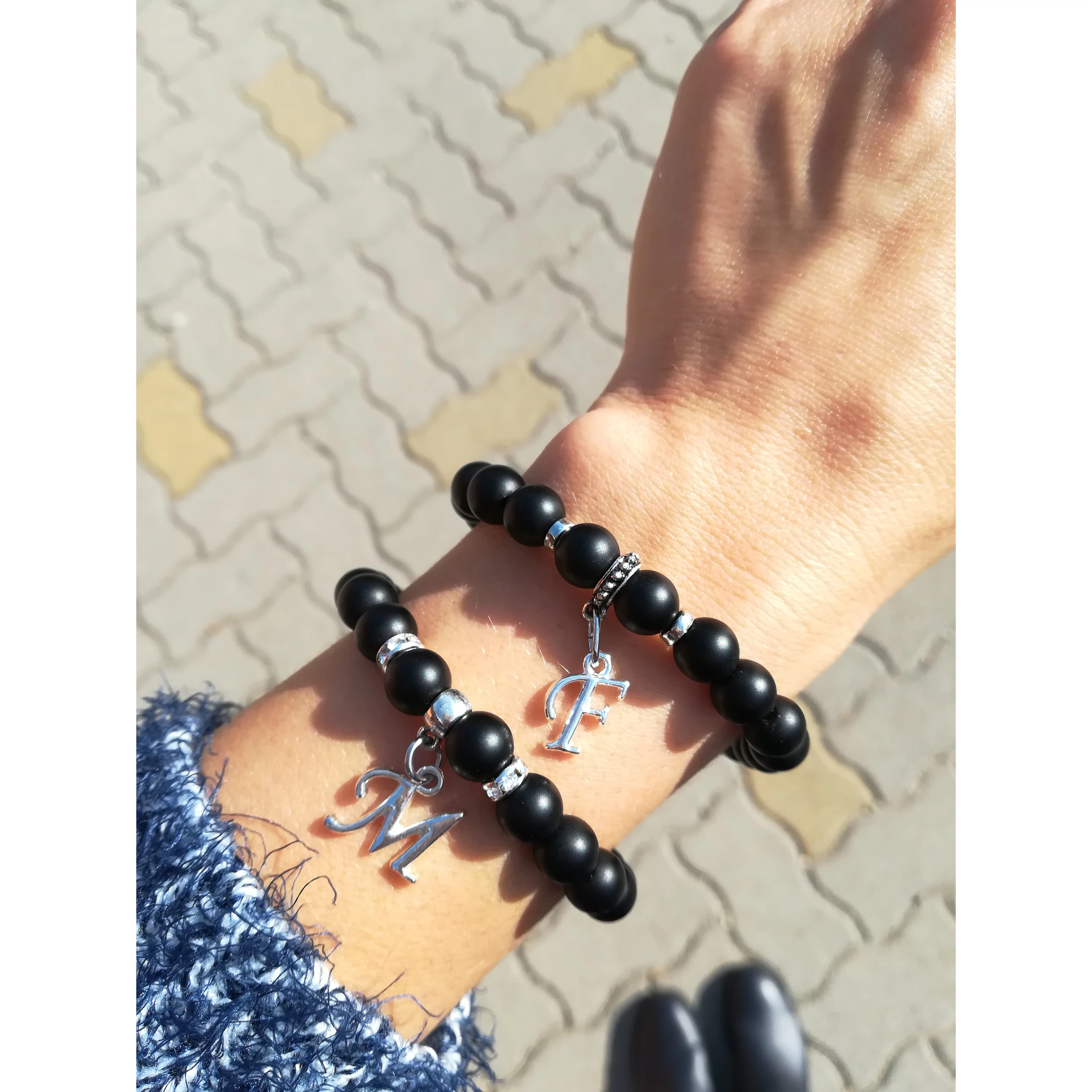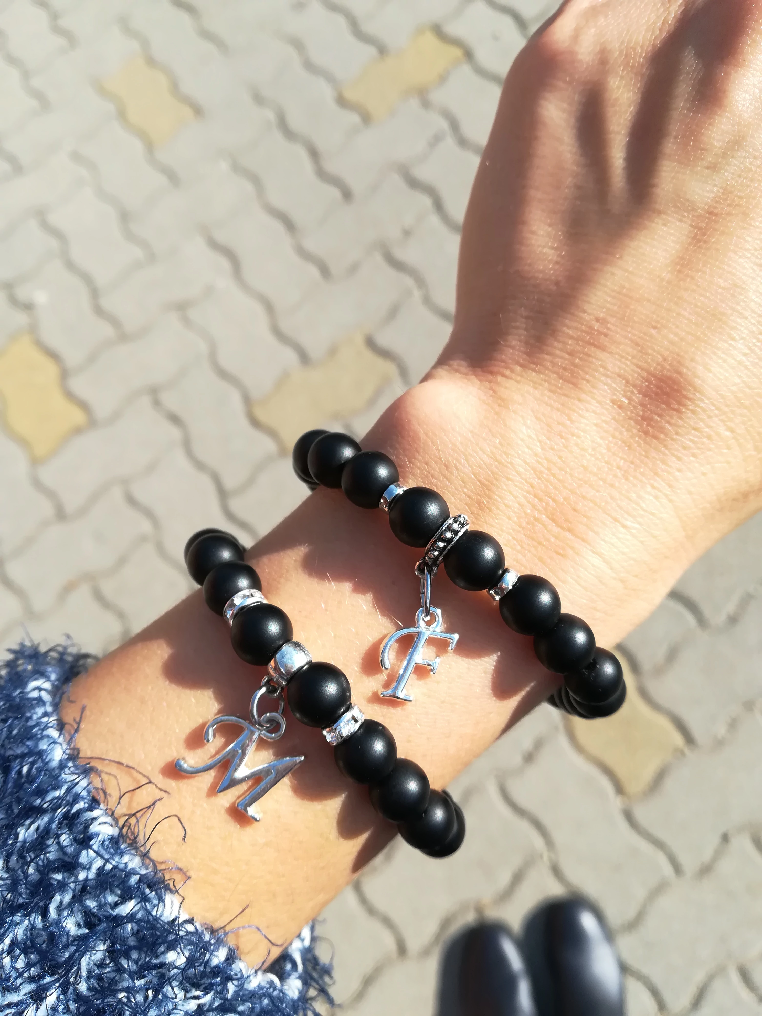 Gyönyörű egyedi szerelmi karkötőpár betűmedálokkal. A karkötők fekete ónixból készültek és szabadon választható betű charmok díszítik . Az ár egy pár (2db) karkötőre vonatkozik.