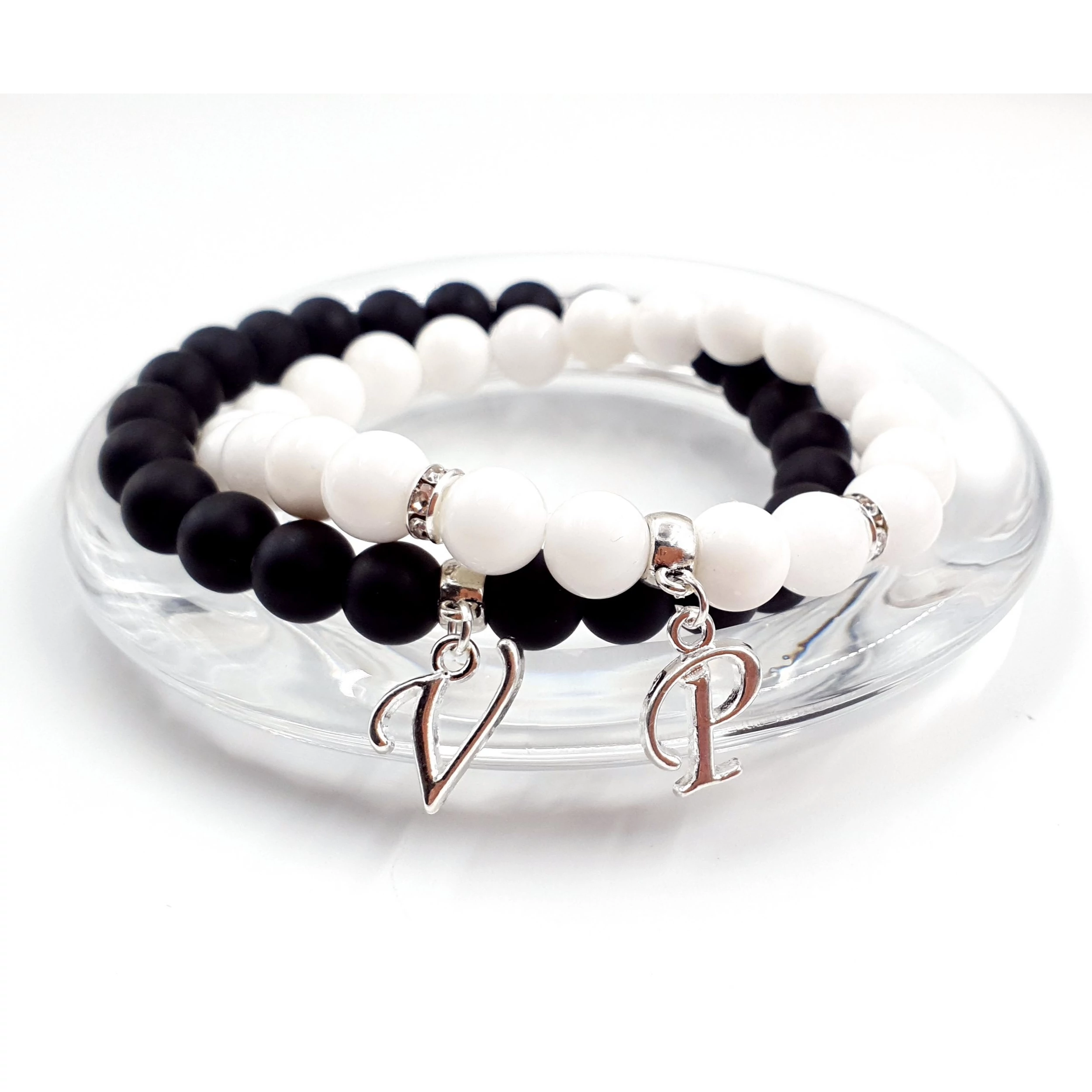 Gyönyörű egyedi szerelmi karkötőpár betűmedálokkal. A karkötők fekete ónixból készültek és szabadon választható betű charmok díszítik . Az ár egy pár (2db) karkötőre vonatkozik.