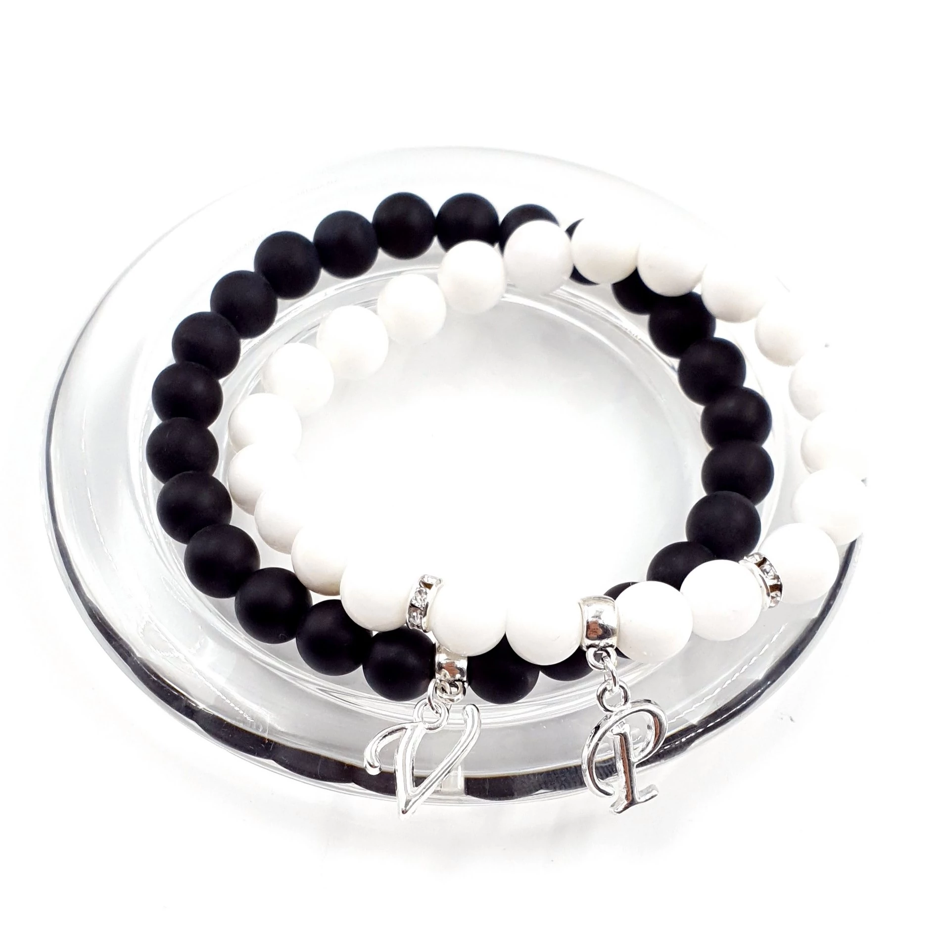 Betű medálos ónix-tejkvarc szerelmi karkötőpár