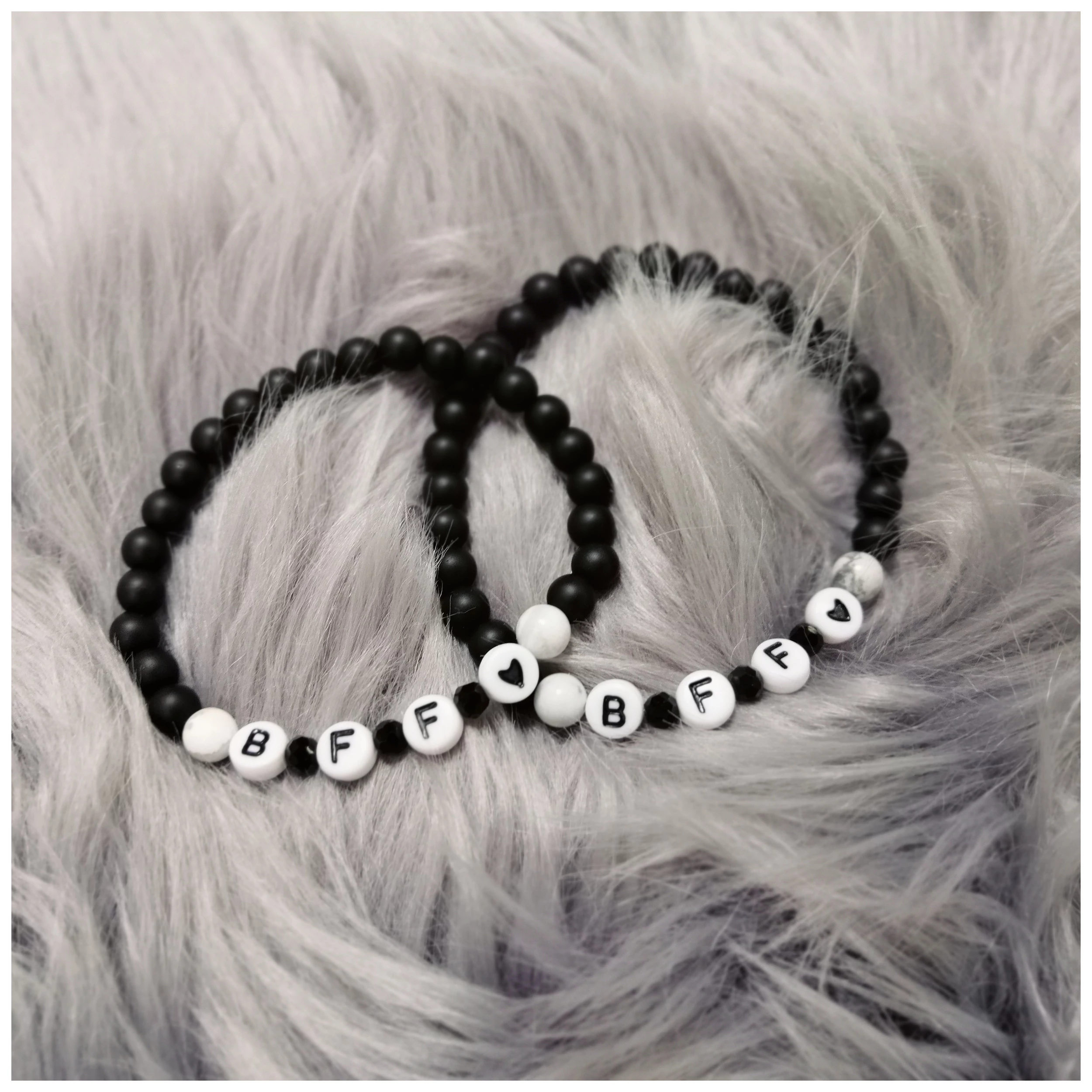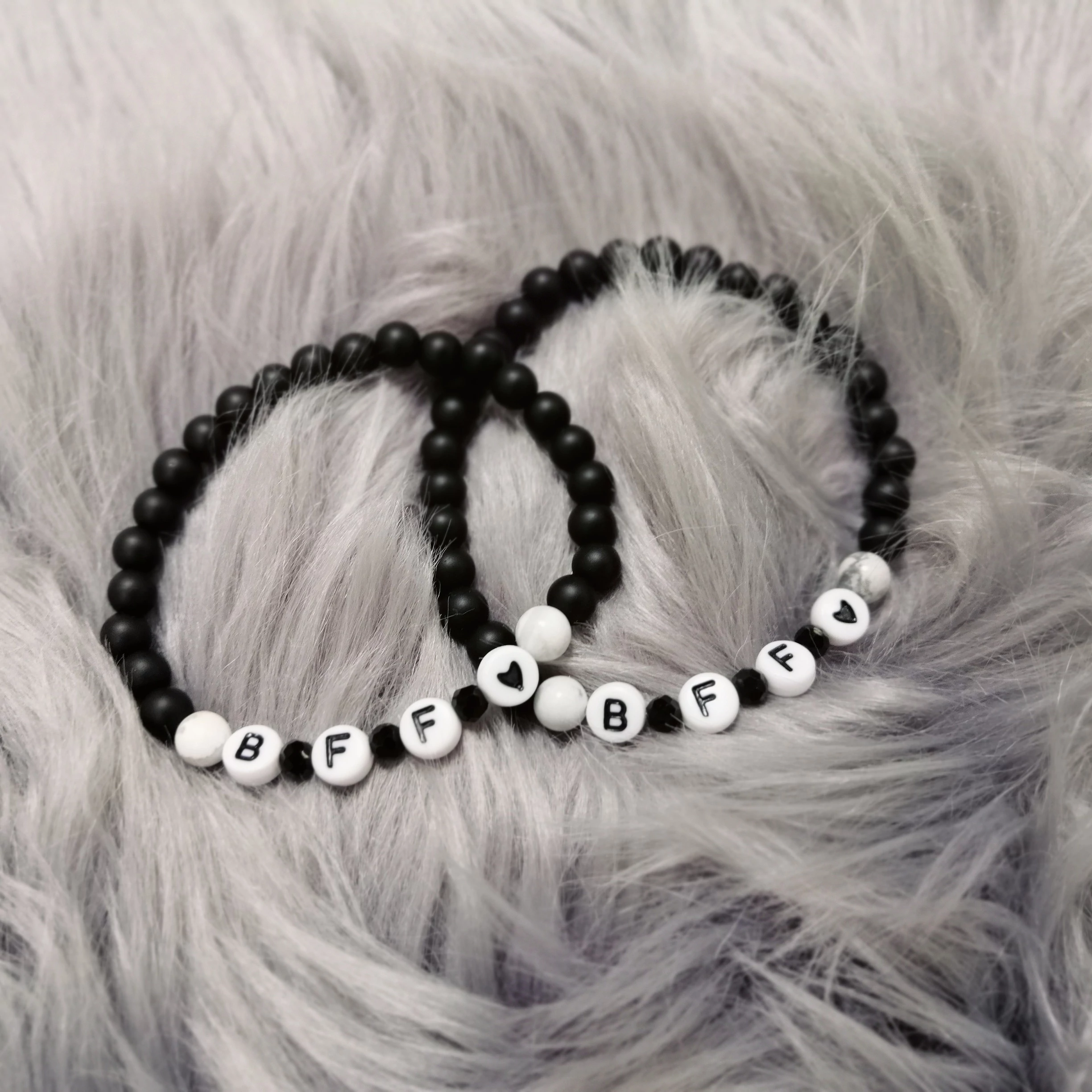 Ez az egyedi karkötőpár, 6 mm fekete ónix ásványokból lett készítve, BFF - "Best Friends Forever" az örök barátság jelképe képpen. Gyönyörű, finom, egyedi darab, ami biztosan sikert arat.