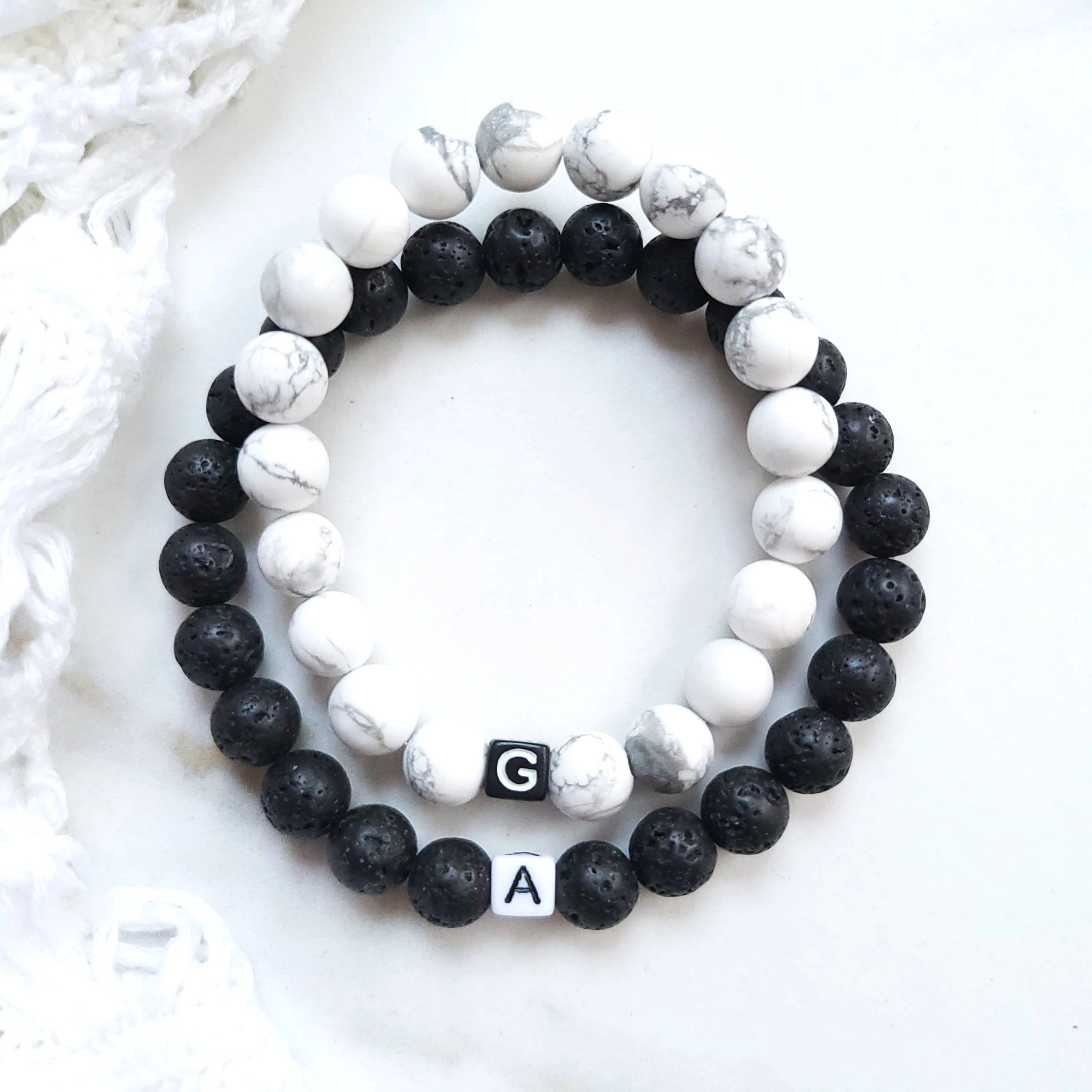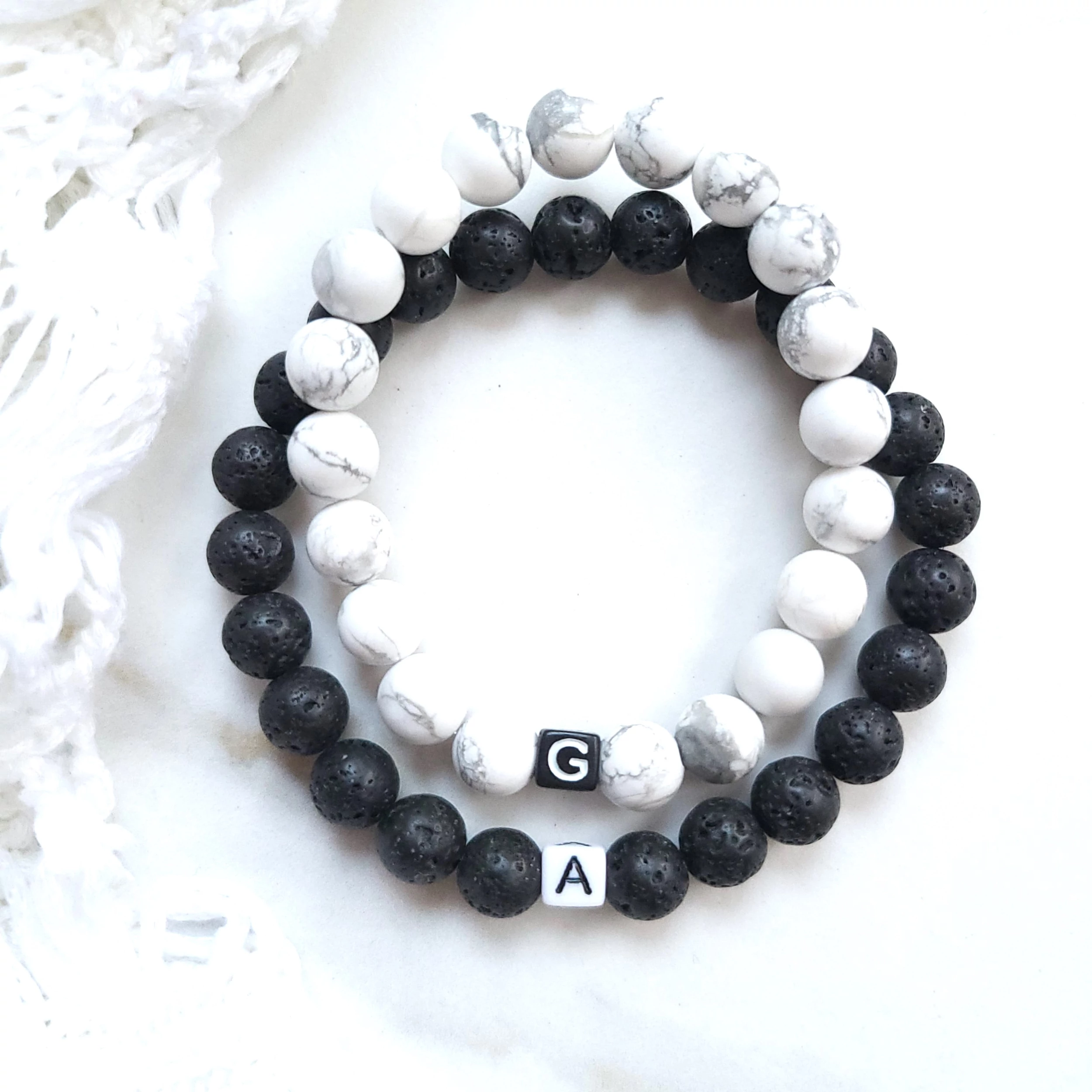Black & White lávakő-howlit szerelmi karkötőpár betűkkel