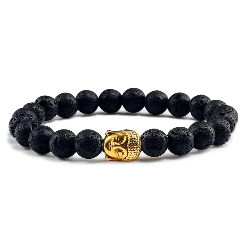 A karkötő lávakő ásványból és arany buddha fejes medál díszítéssel készült.
