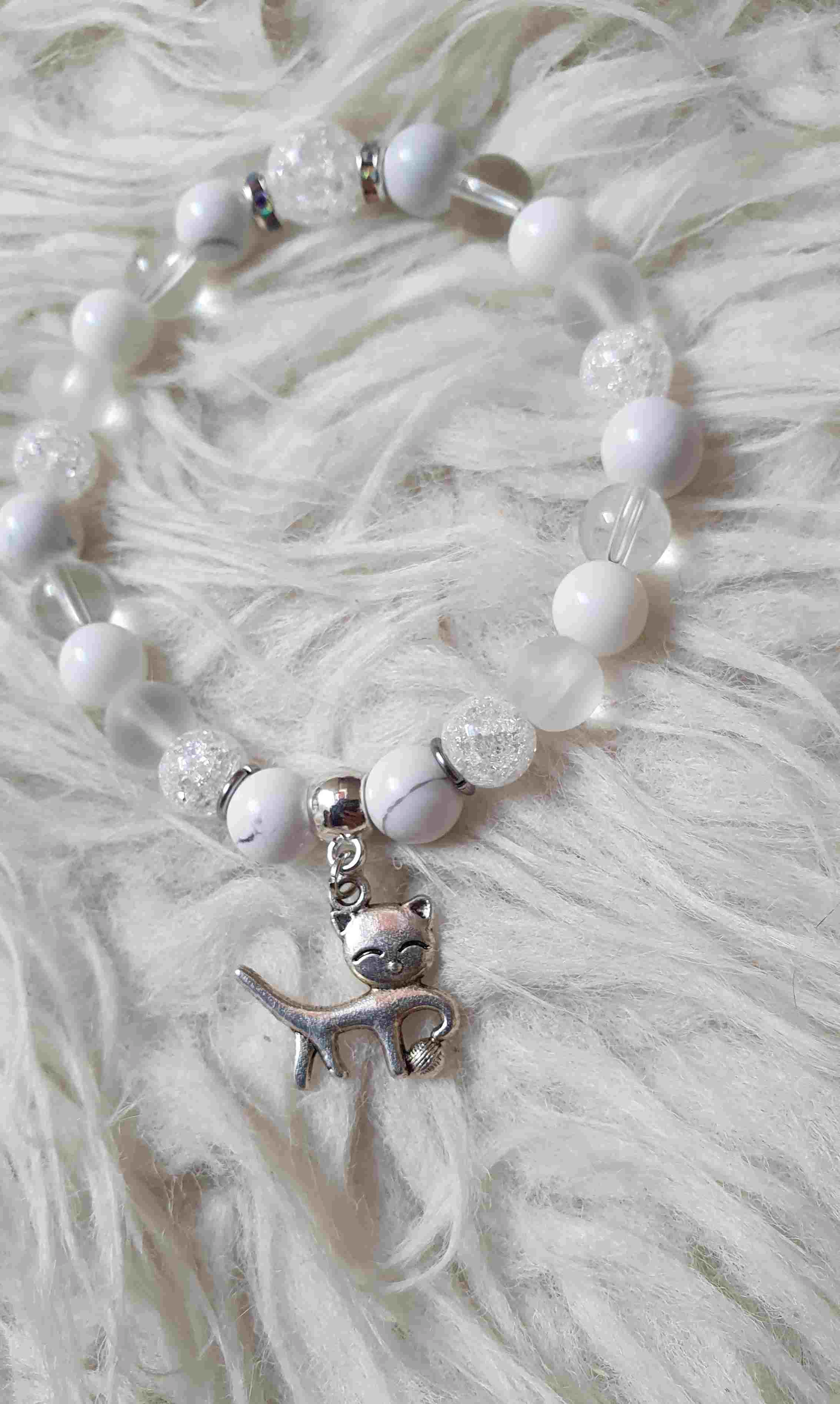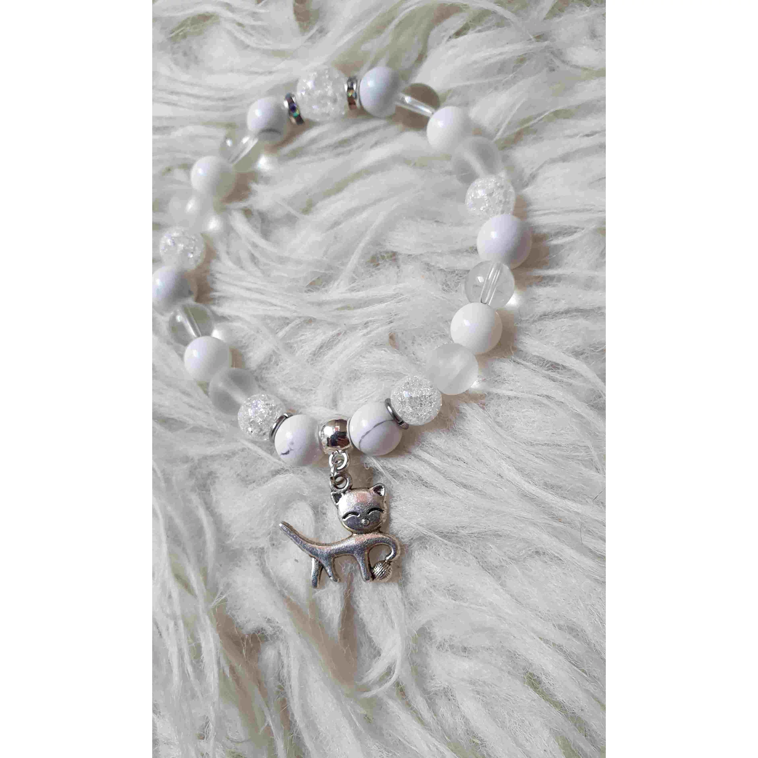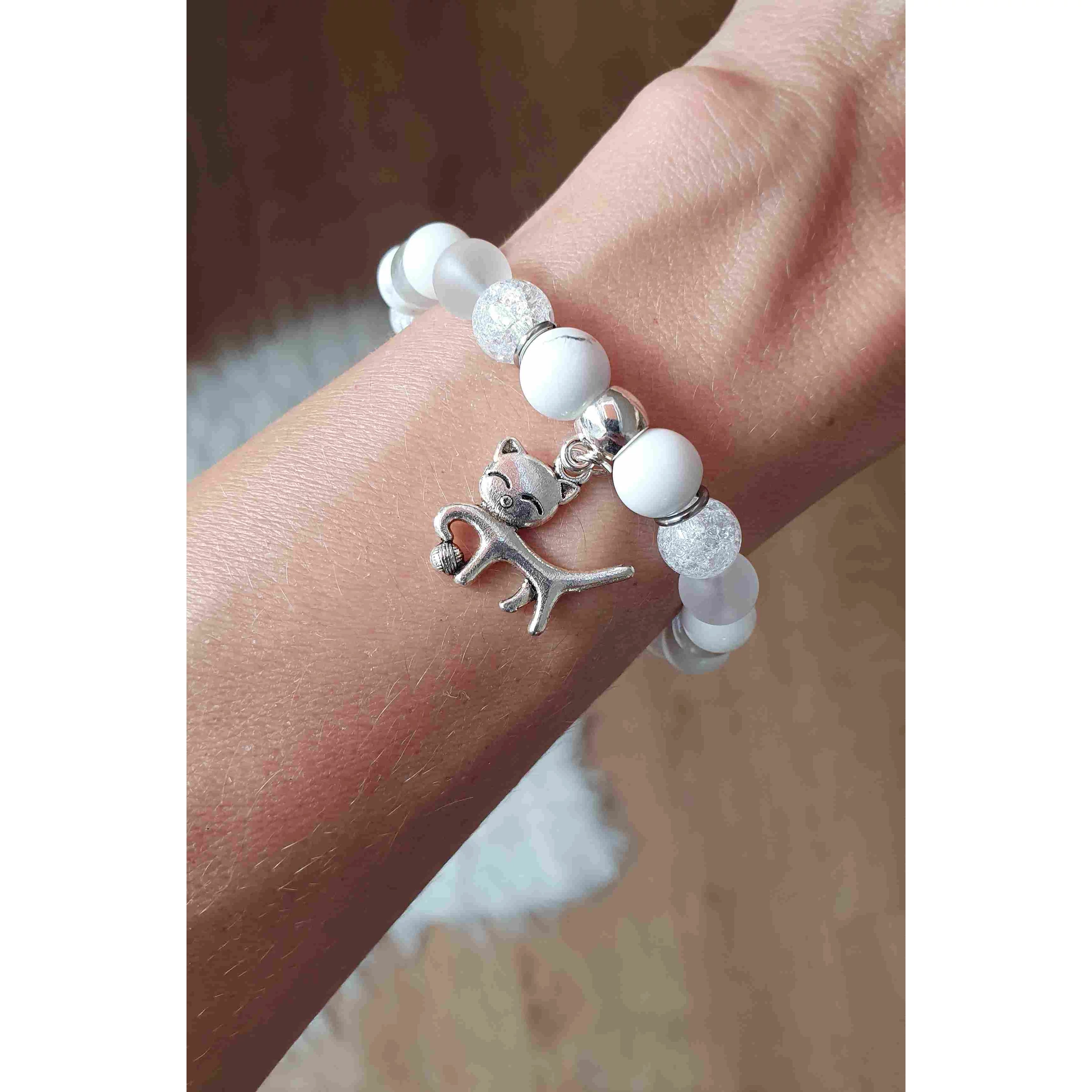 Egyedi tervezésű ásványkarkötő cicás medállal hegyikristály, és tejkvarc ásványokból.