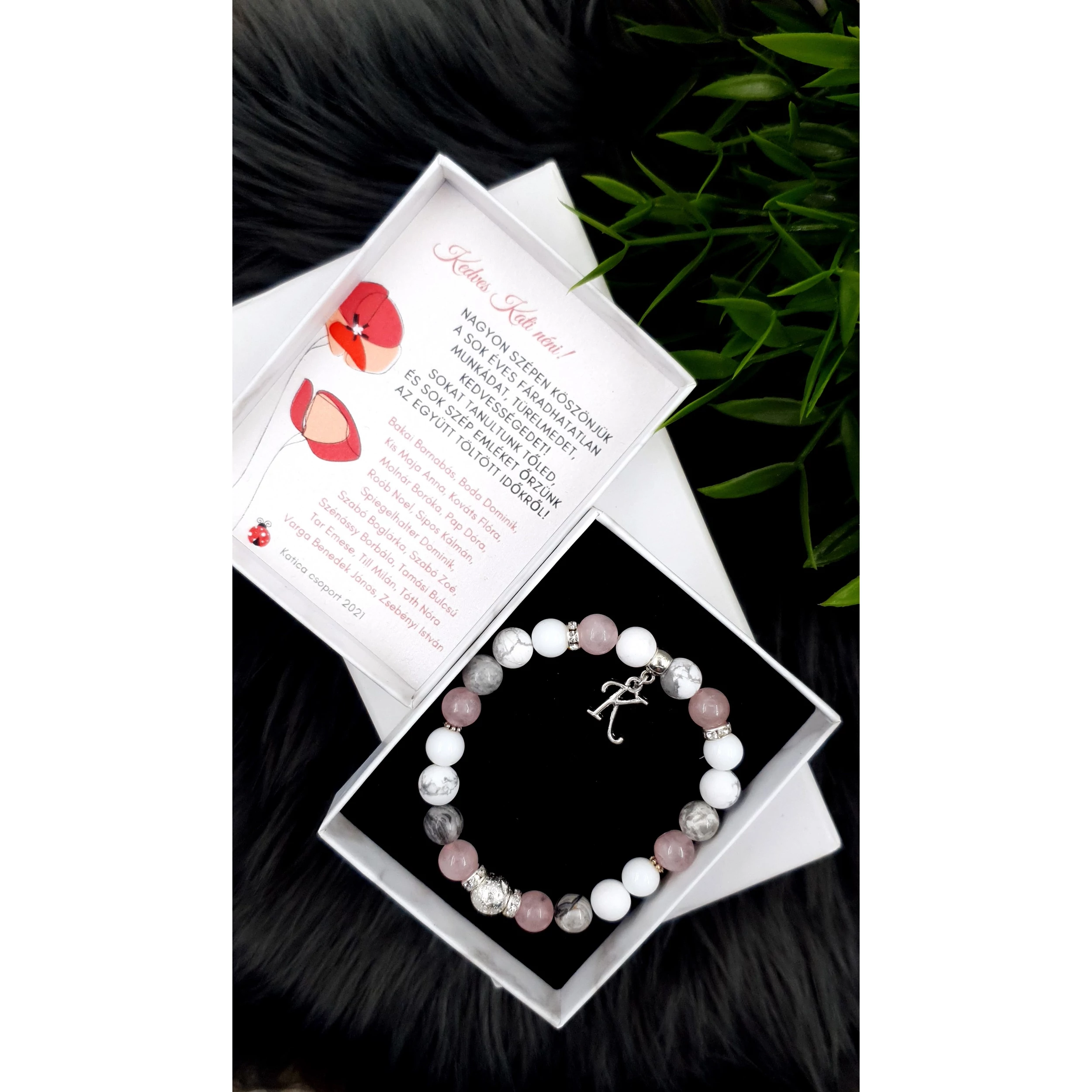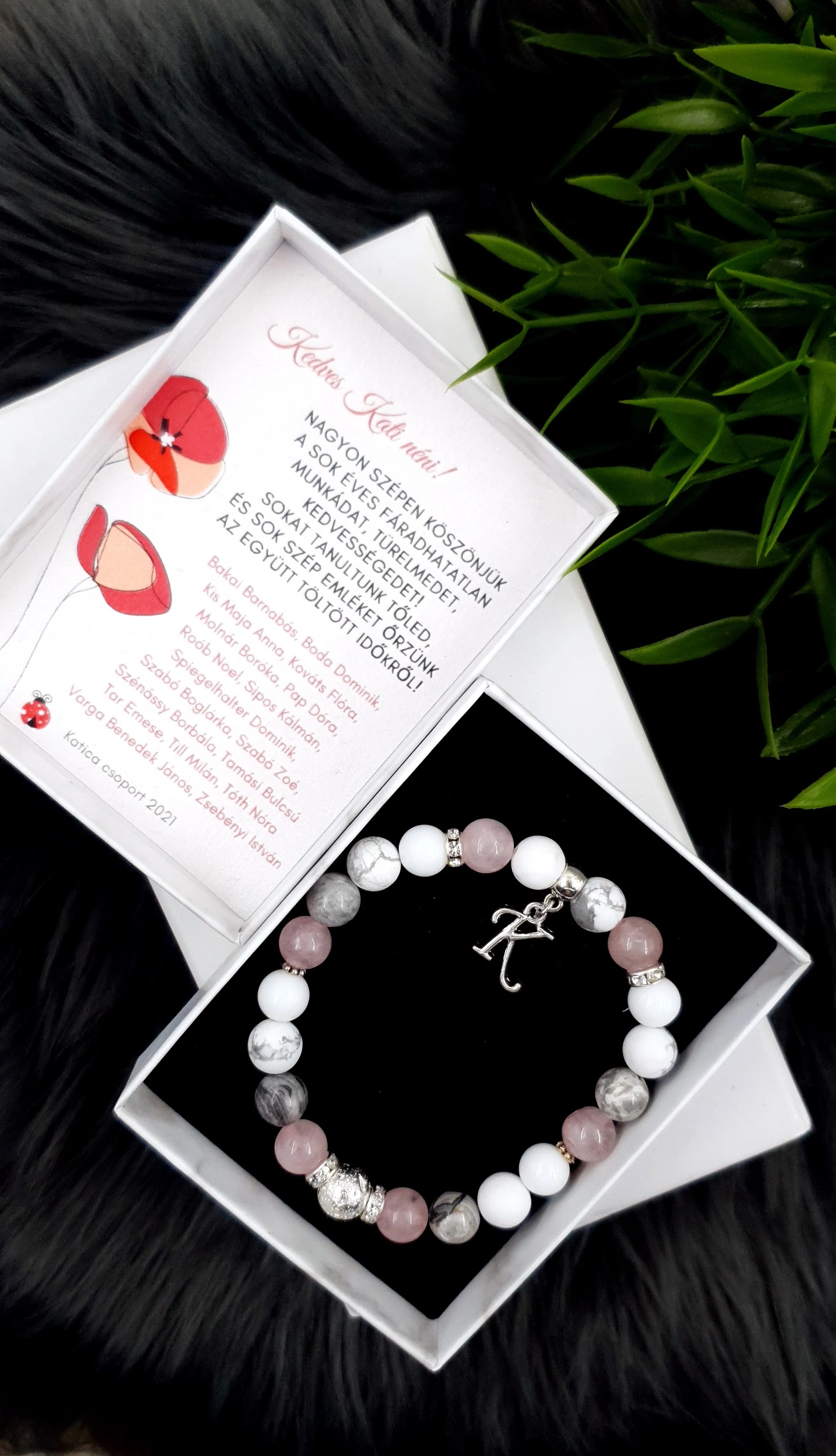 Díszdobozos búcsú ajándék karkötő betűvel, megható ajándékkal kedveskednél szerettednek valami jeles esemény kapcsán, tökéletes választás ez a díszdobozos ásványkarkötő egyedi betűvel és személyre szabott üzenettel. A karkötő 8 mm -es matt és fényes rózsakvarc, howlit és zebrajáspis ásványokból készült, és egy betű charmot tartalmaz. és egy tüll tasak. Az ajándékszett része a karkötő, a díszdoboz, illetve a doboz belsejében található személyes üzenet, Amennyiben változtatni szeretnél az üzeneten vagy szeretnéd megadni az osztálynévsort, ezt a vásárlási folyamatban, a Pénztár/Összegzés menüpontban a "Megjegyzés" rovatban teheted meg, magát az üzenetet kérlek tedd idézőjelben, hogy egyértelmű legyen számunkra, mit szeretnél látni a díszdoboz belsejében!