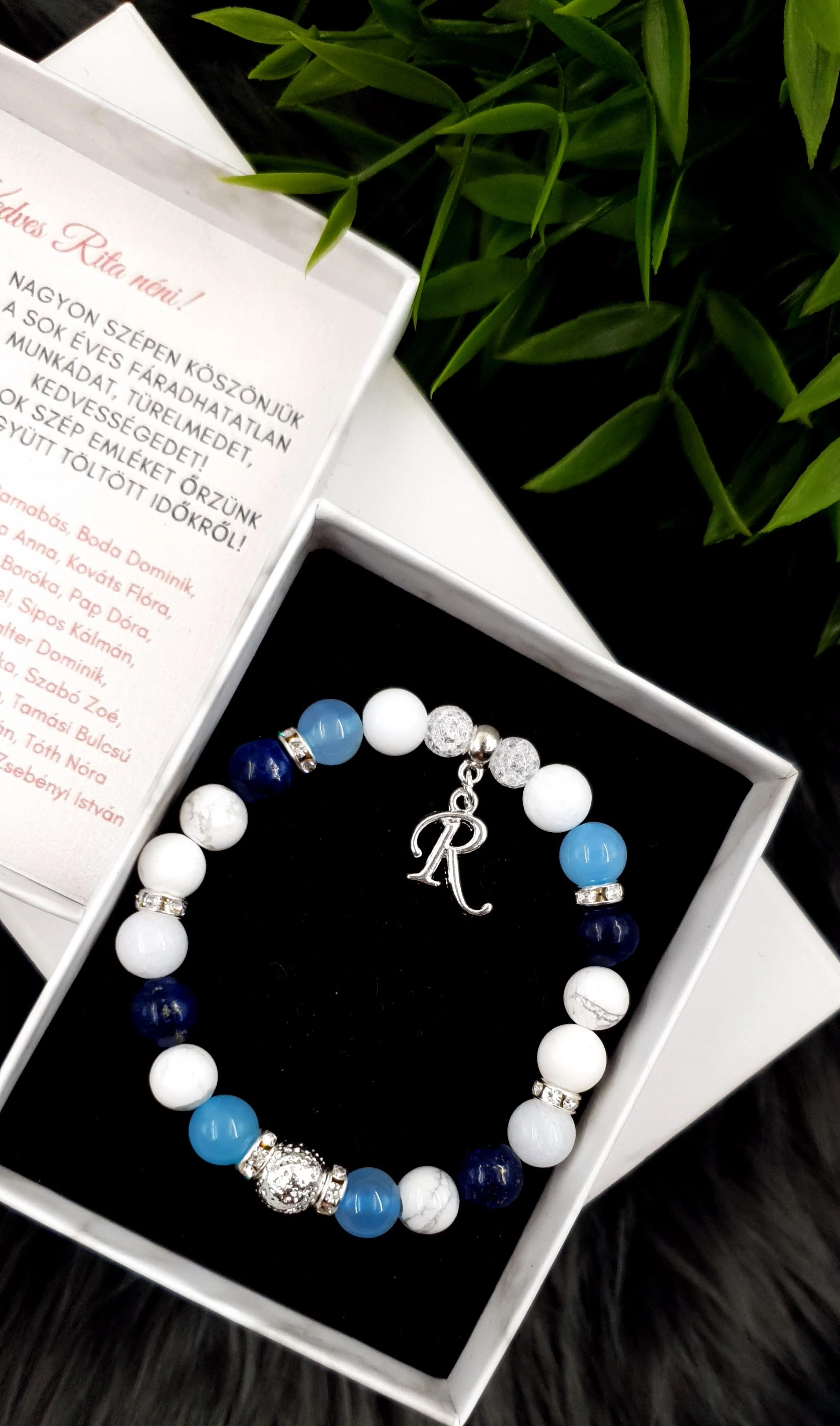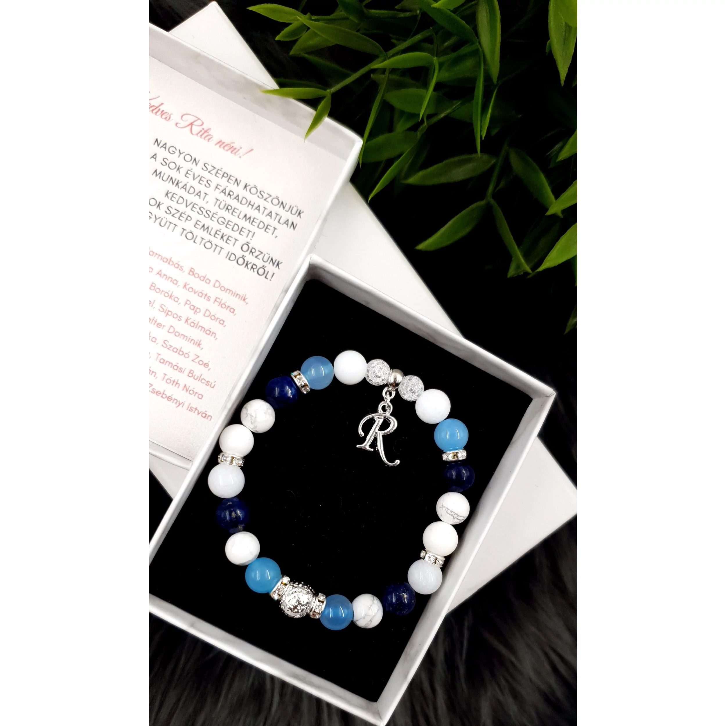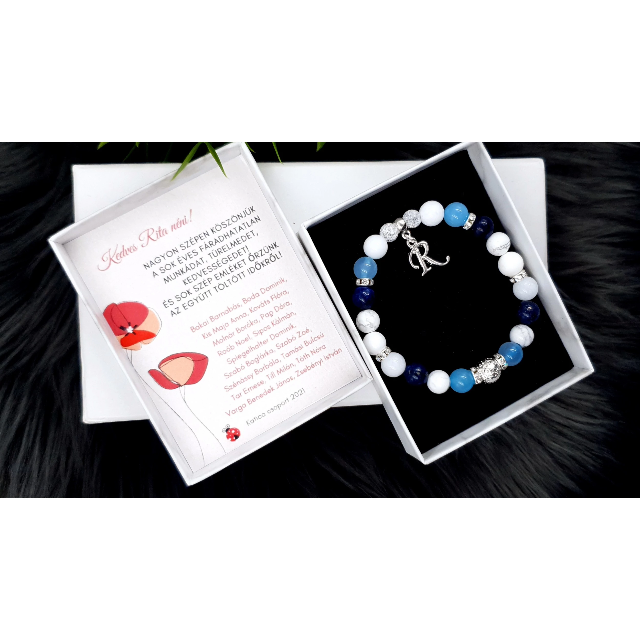 Díszdobozos személyes ajándék karkötő betűvel, megható ajándékkal kedveskednél szerettednek valami jeles esemény kapcsán, tökéletes választás ez a díszdobozos ásványkarkötő egyedi betűvel és személyre szabott üzenettel. Akár egy búcsúzó csoport vagy osztály nevében, akár saját gyermeked búcsú ajándékaként, csodálatos megható ajándék lehet az óvónőtől vagy tanárnőtől/tanártól. A karkötő 8 mm -es kék kvarc, lazurit, howlit ásványokból készült, és egy betű charmot tartalmaz, melyet te magad választhatsz ki. Az ajándékszett része a karkötő, a díszdoboz, illetve a doboz belsejében található személyes üzenet, és egy tüll tasak. Amennyiben változtatni szeretnél az üzeneten vagy szeretnéd megadni az osztálynévsort, ezt a vásárlási folyamatban, a Pénztár/Összegzés menüpontban a "Megjegyzés" rovatban teheted meg, magát az üzenetet kérlek tedd idézőjelben, hogy egyértelmű legyen számunkra, mit szeretnél látni a díszdoboz belsejében!