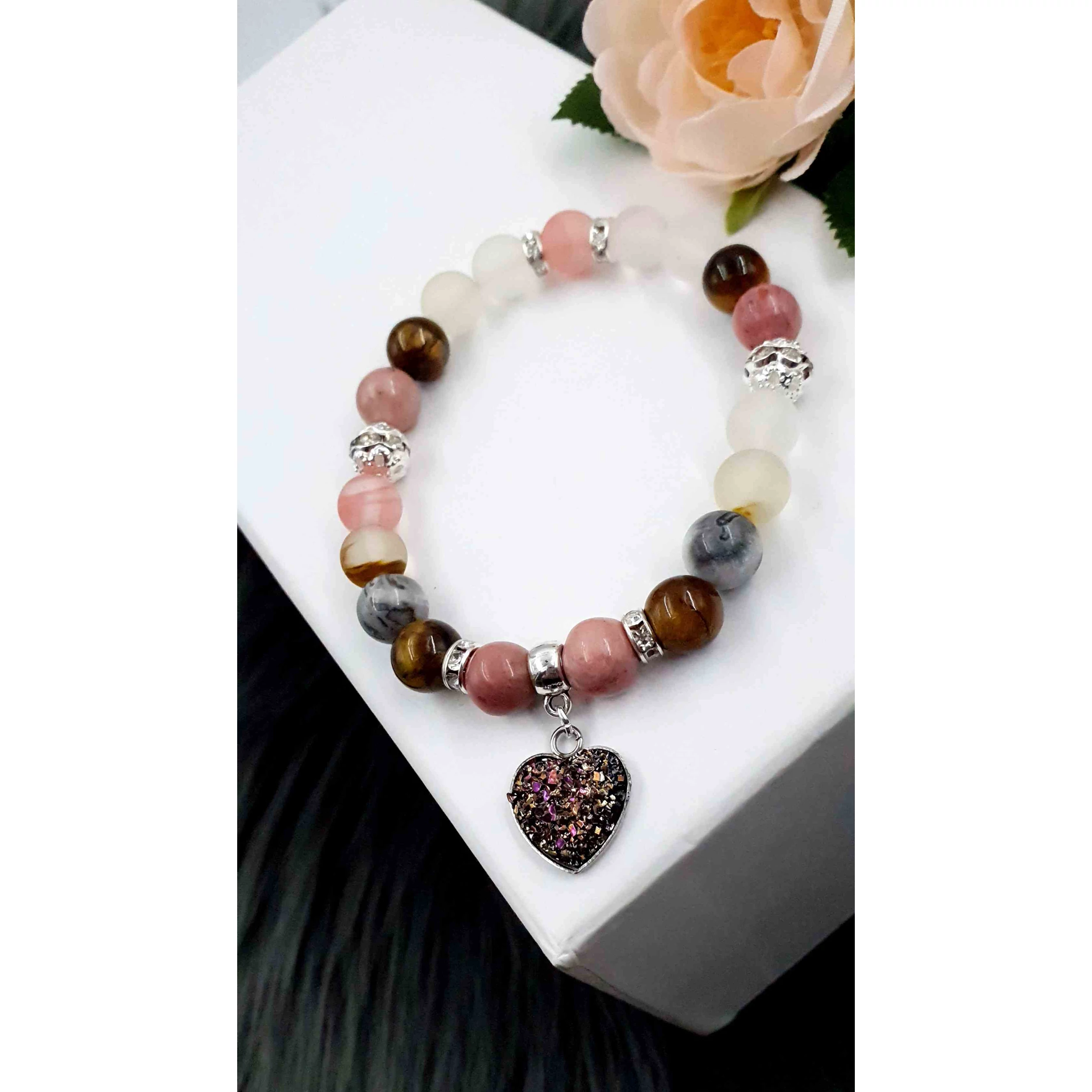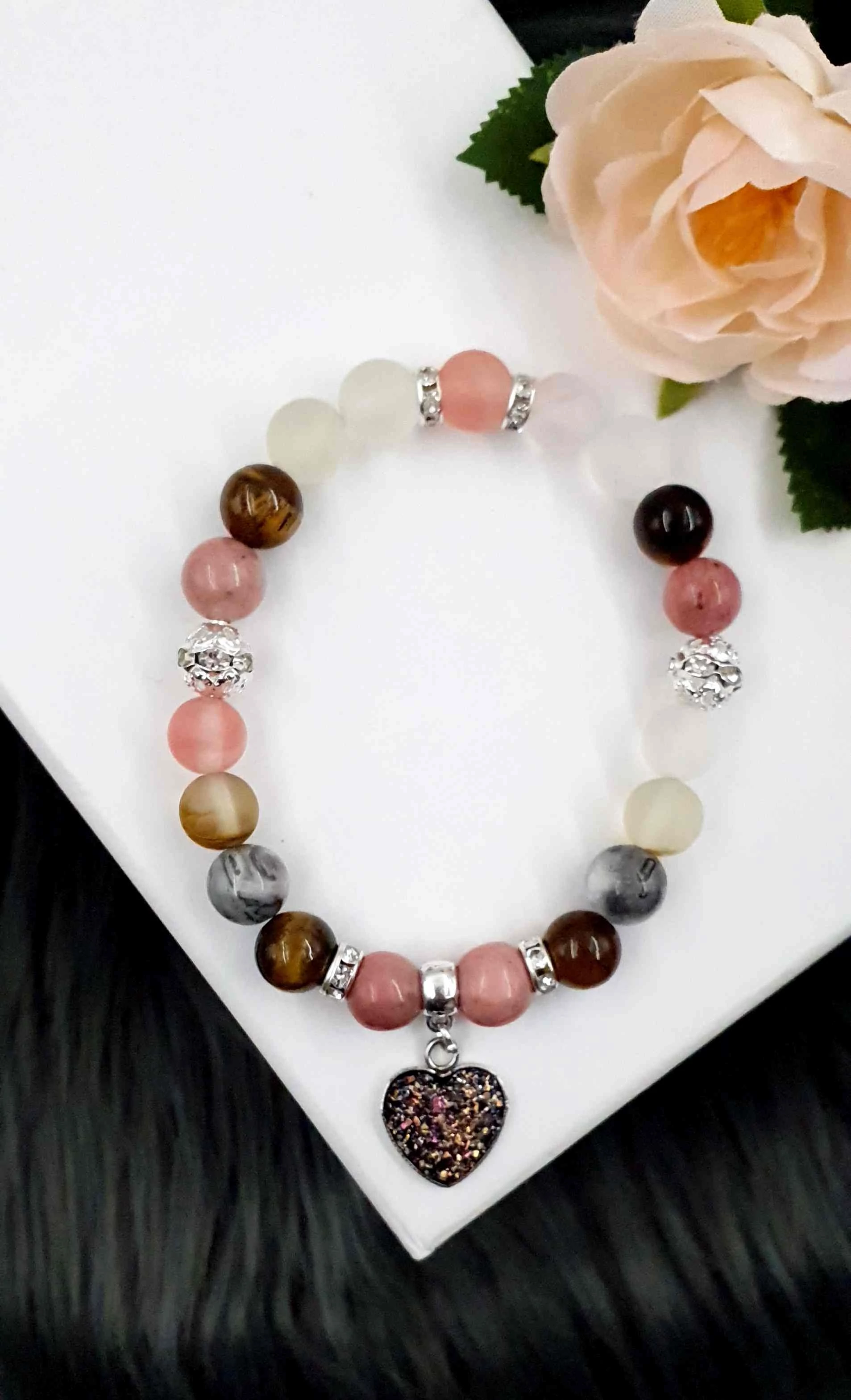 Álomszép Yvonne Design Druzy Collection egyik gyönyörű darabja, mely pasztell színben pompázó szett. A karkötő hegyikristály, rózsakvarc, tigrisszem, zebrajáspis, és rózsaopál ásványokból készült.