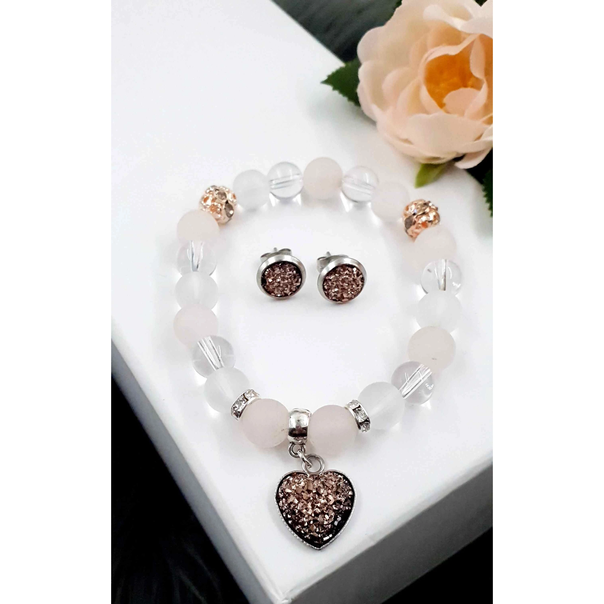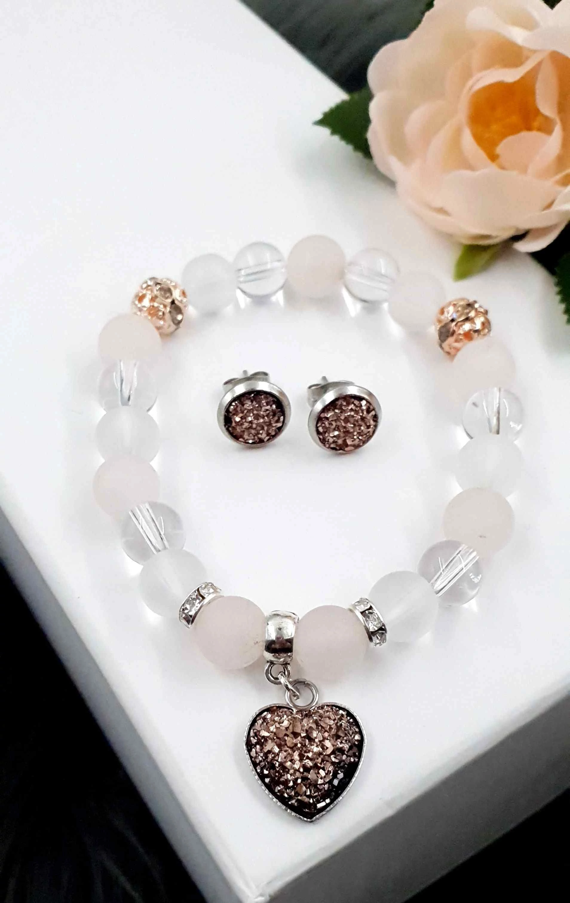 A szett része 8mm-es matt achát ásványgyögyökből készült karkötő druzy szívecske medállal, és egy pár gyönyörű csillogó fülbevalóval.