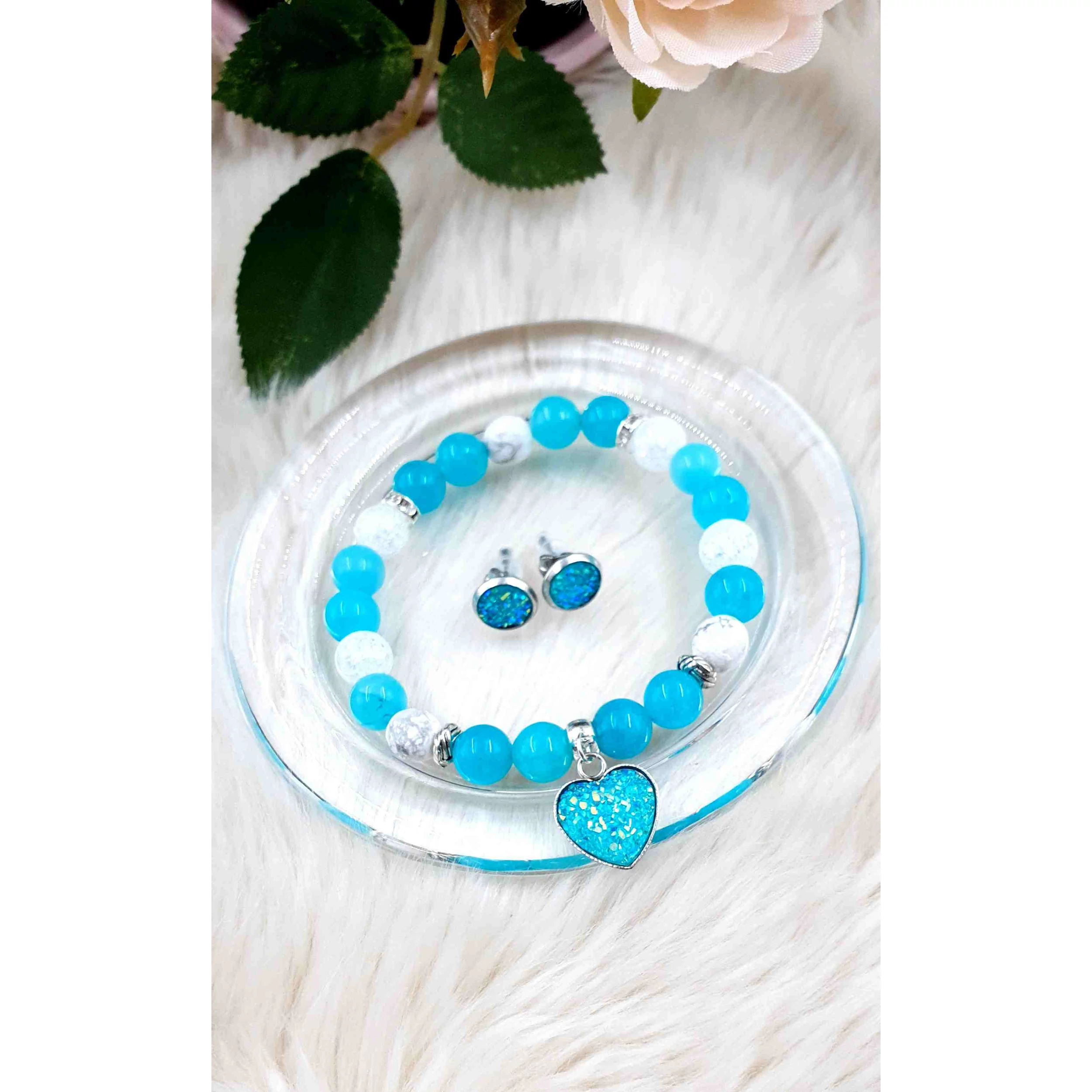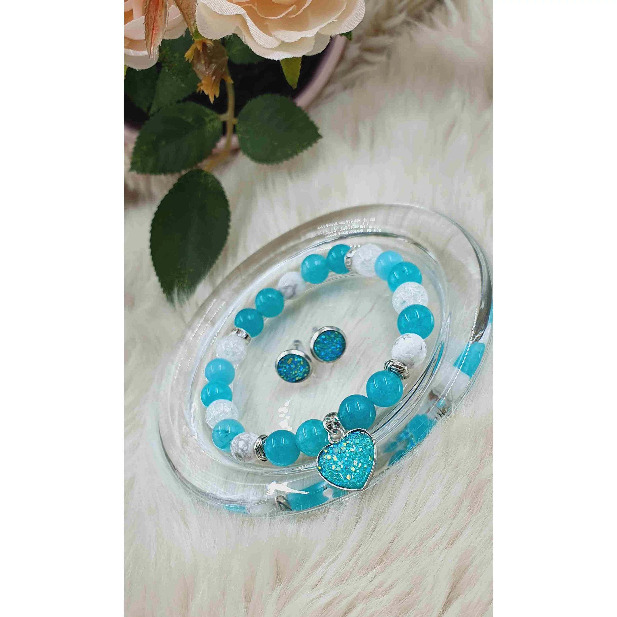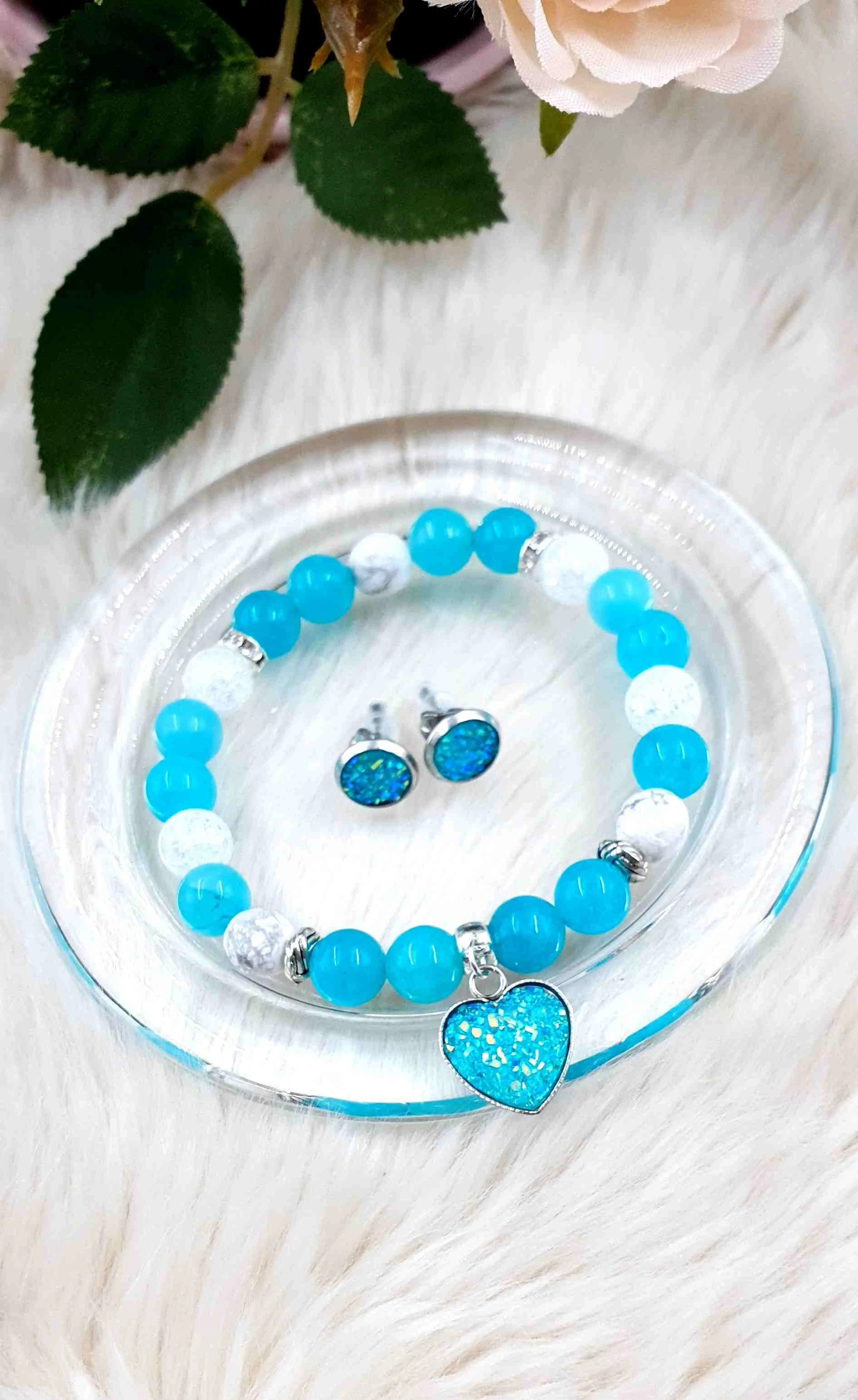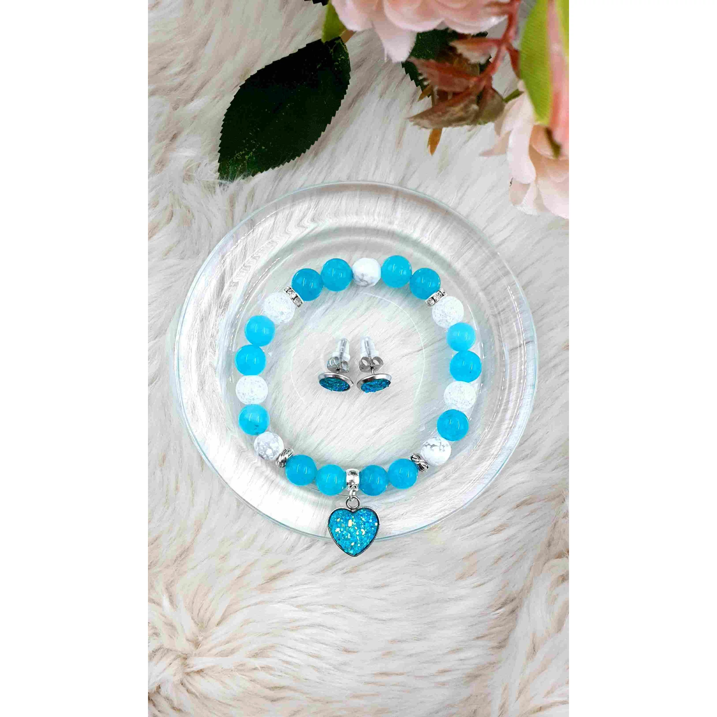 A szett része 8mm-es kék kvarc és hegyikristály ásványgyögyökből készült karkötő druzy szívecske medállal, és egy pár csillogó álomszép fülbevalóval.