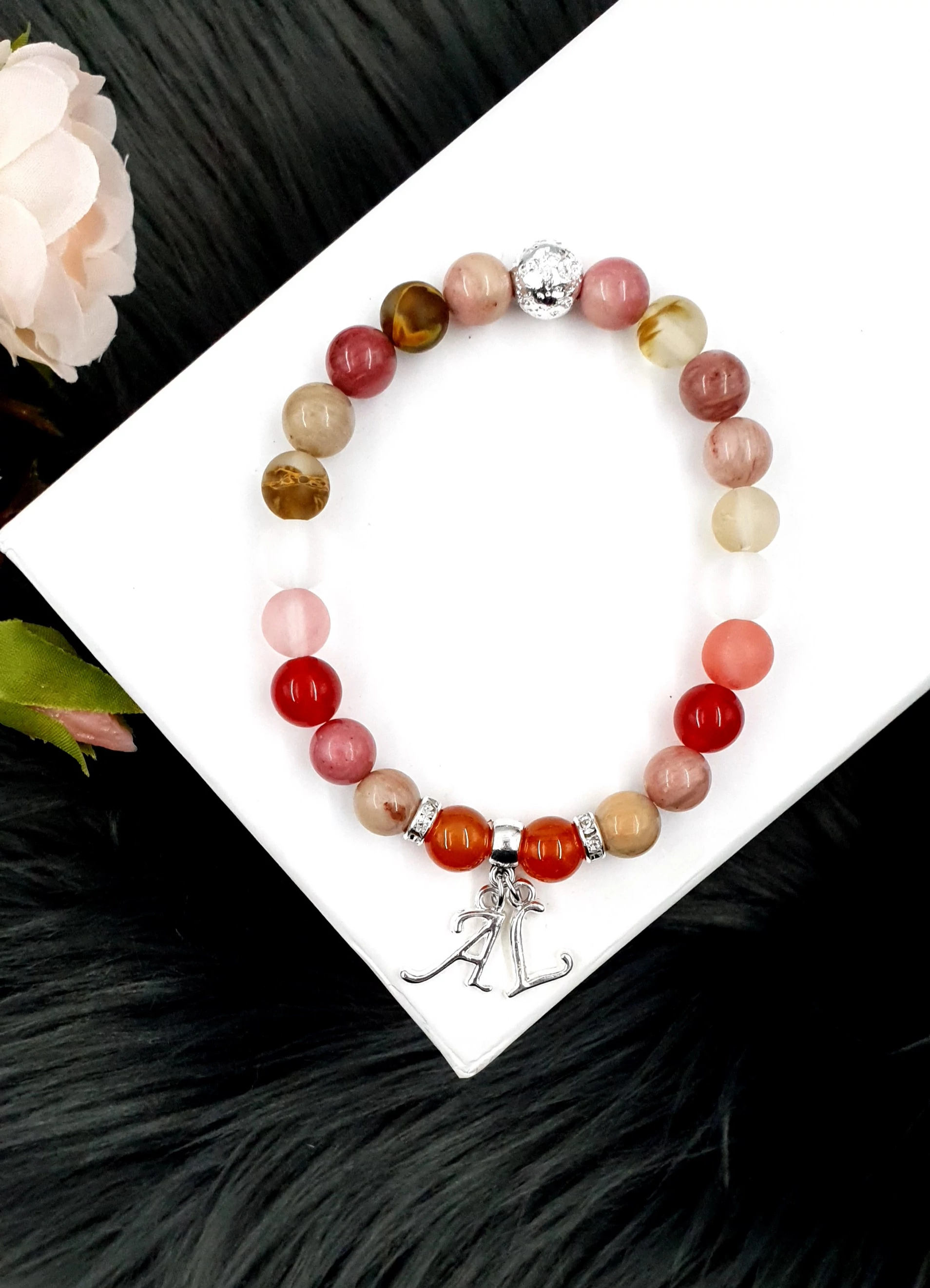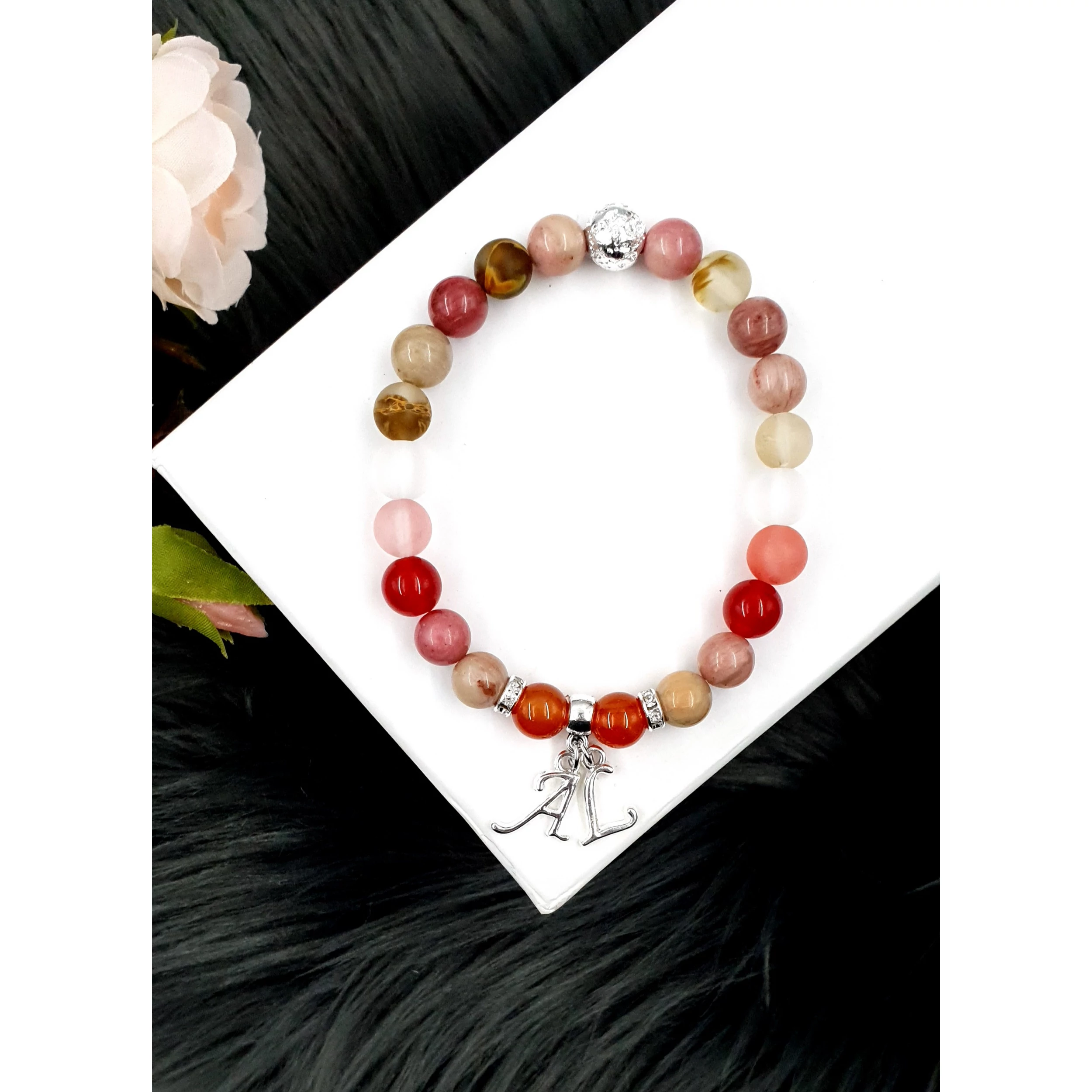 Dupla betű medálos rózsaopál ásványkarkötő