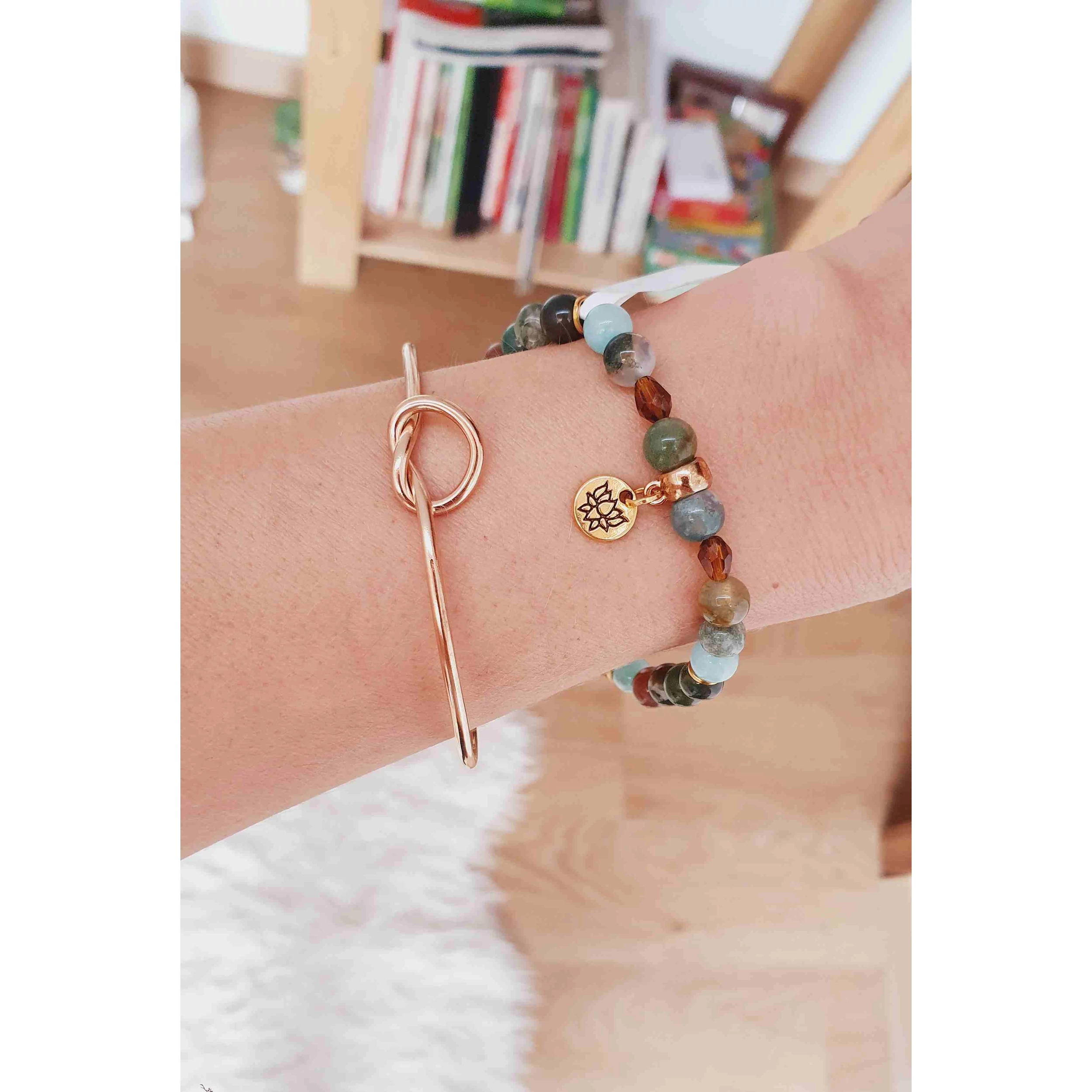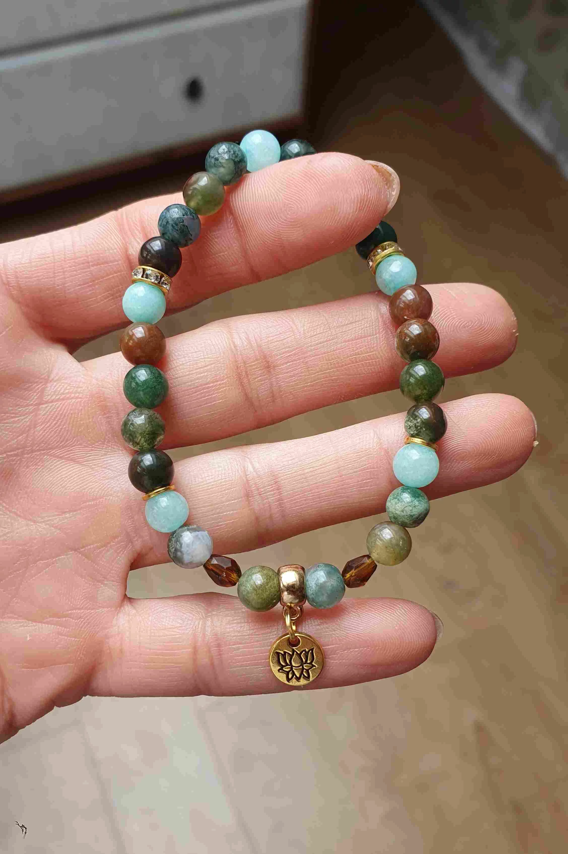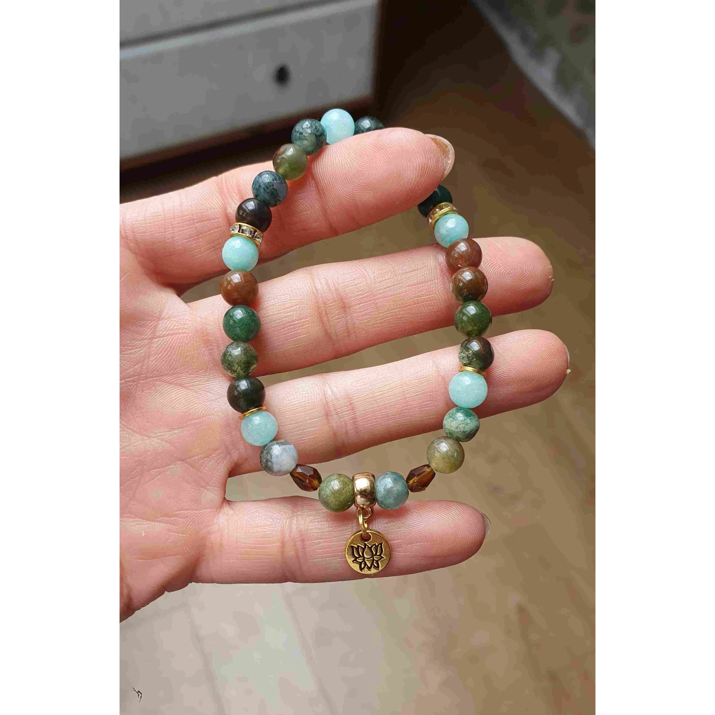 Estée Lune indiachát ásványkarkötő. Kedves barátnőmnek ihletett ásványkarkötő arany lótusz medállal, hogy a szerencse kísérje útján! Egyedi tervezésű indiachát és kékkvarc ásványokból készült karkötő, lótusz medállal díszítve, 6 mm-es apró gyöngyökből.