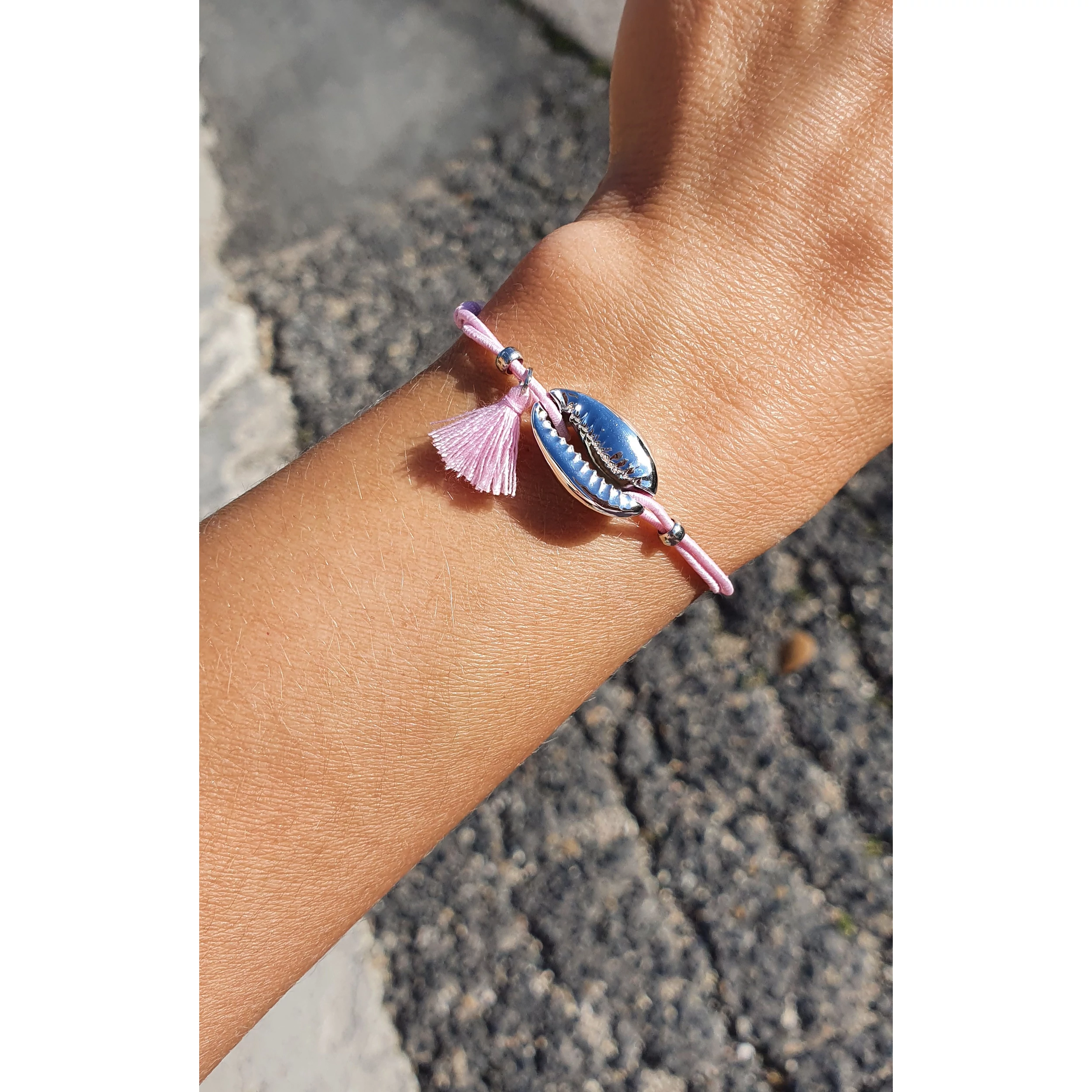 Ezüst színű kagylós zsinór karkötő "rózsaszín"