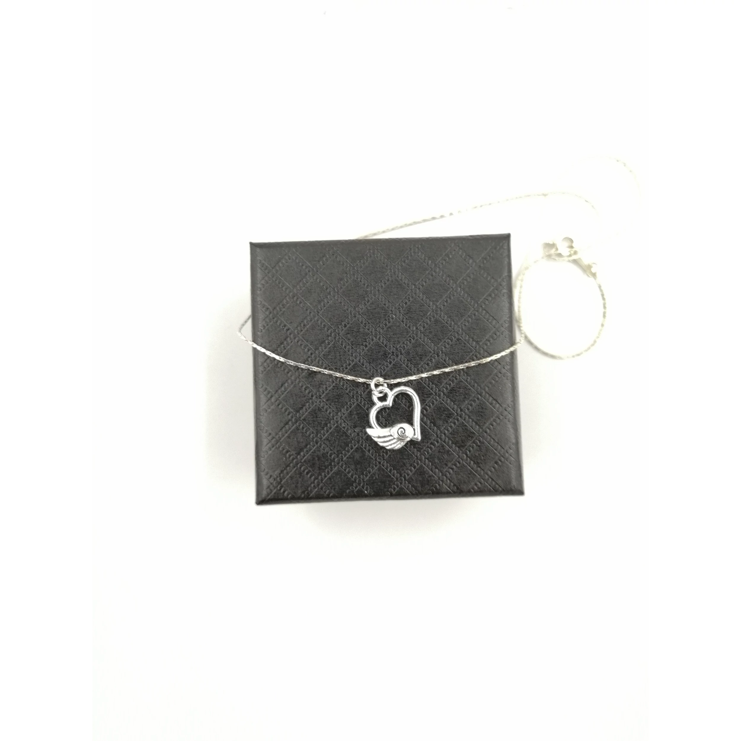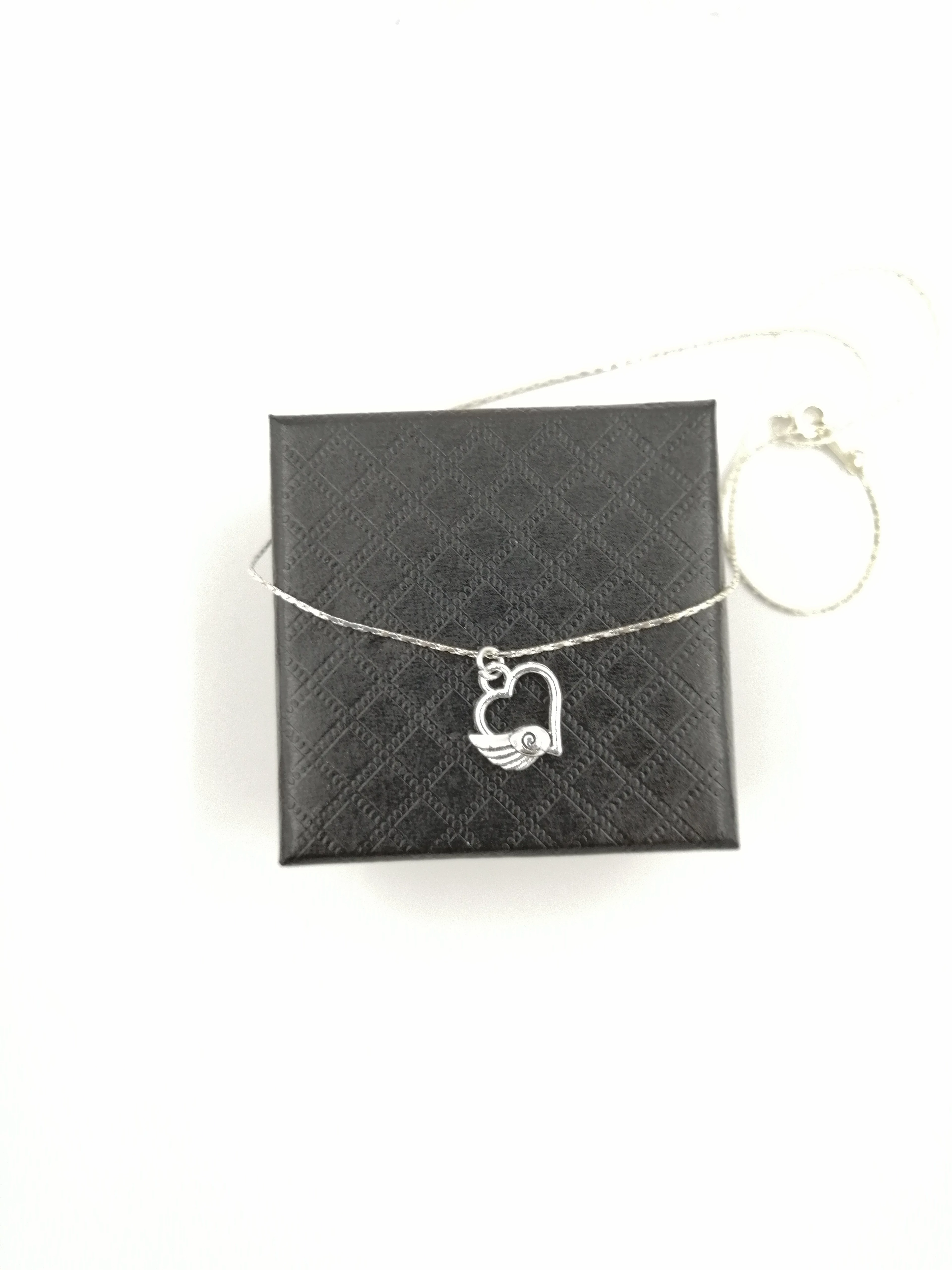 Ezüstözött finom vékony nyaklánc szárnyaló szívecske medállal. Ajándék fekete plüssbársony díszdoboz jár a termékhez.