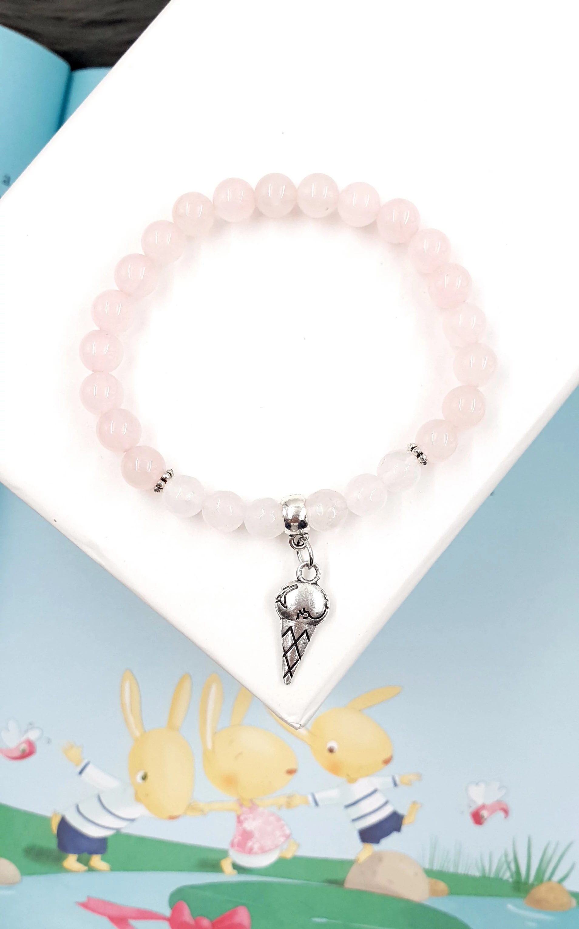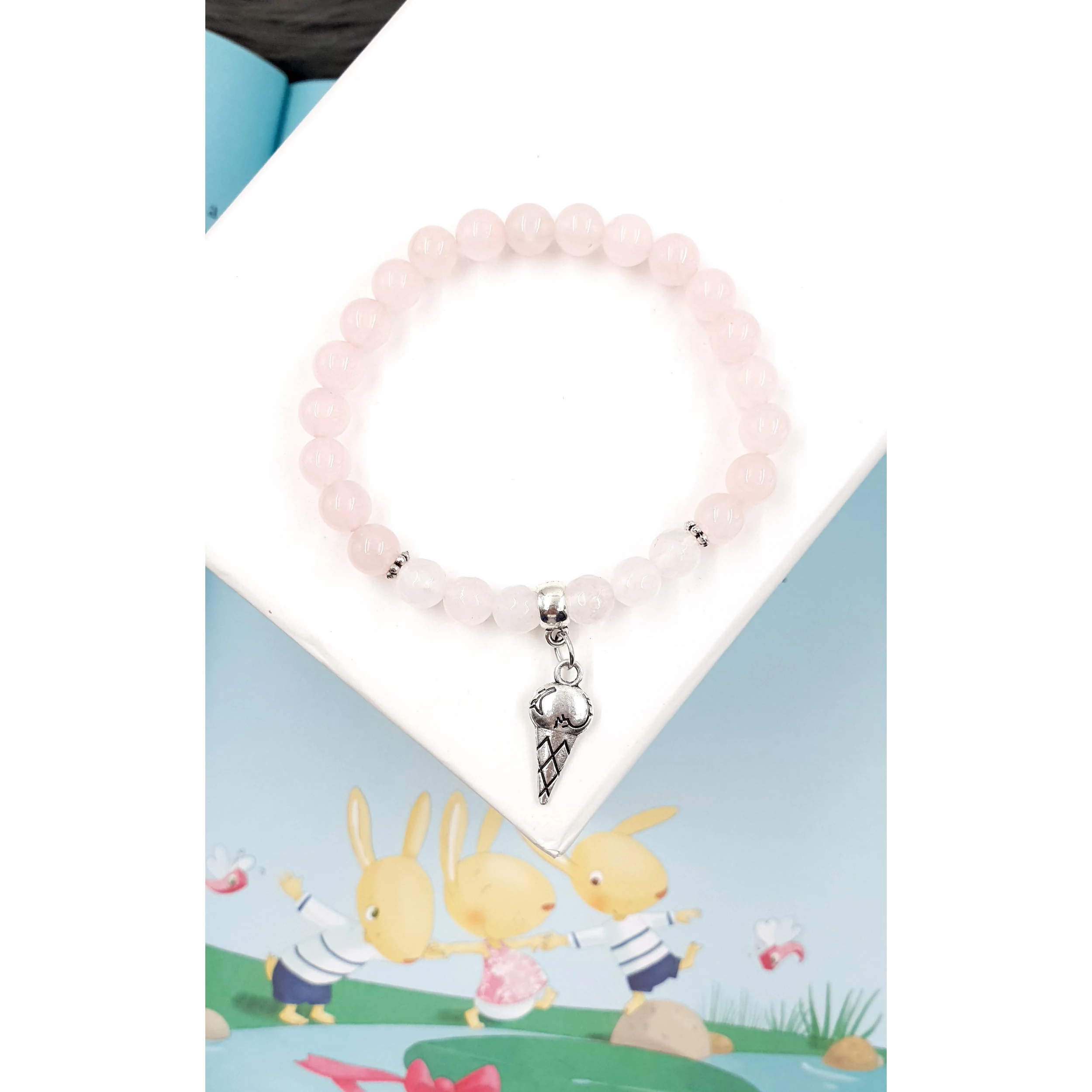 Fagyi medálos rózsakvarc karkötő. Nagyon kifinomult, apró, 6mm gyöngyöket tartalmazó lányka ásványkarkötő.