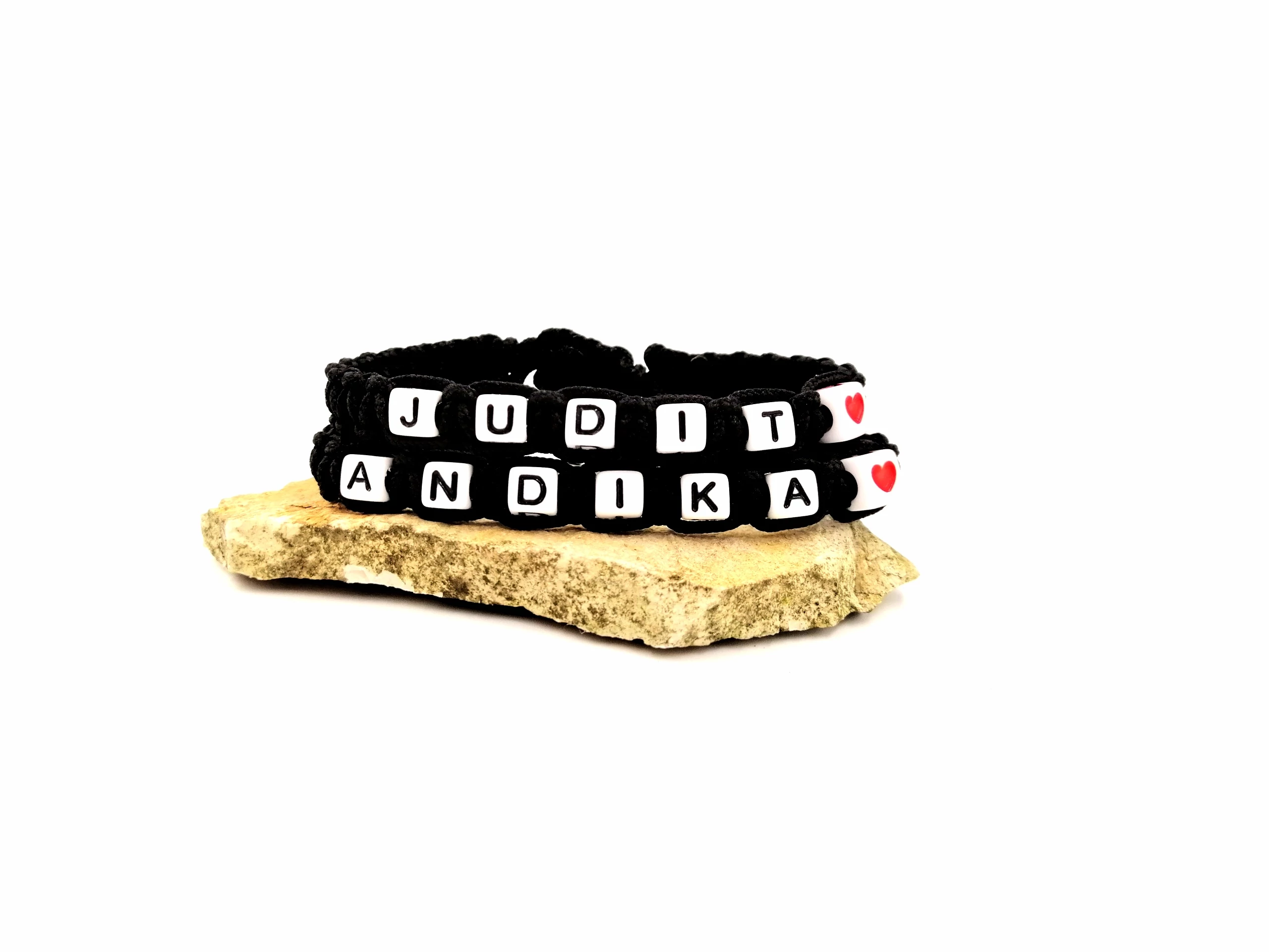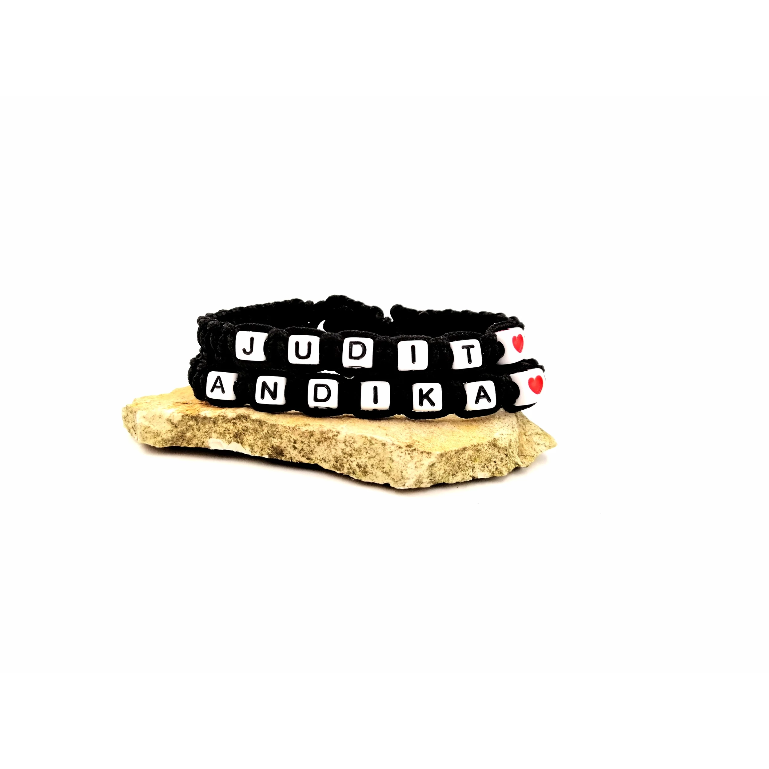 Fehér betűs névvel ellátott karkötőpár szívecskével