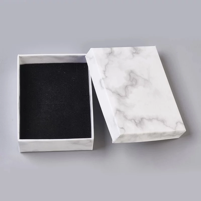 Fehér márványos mintás ajándékdoboz, belsejében fekete plüss párnával.