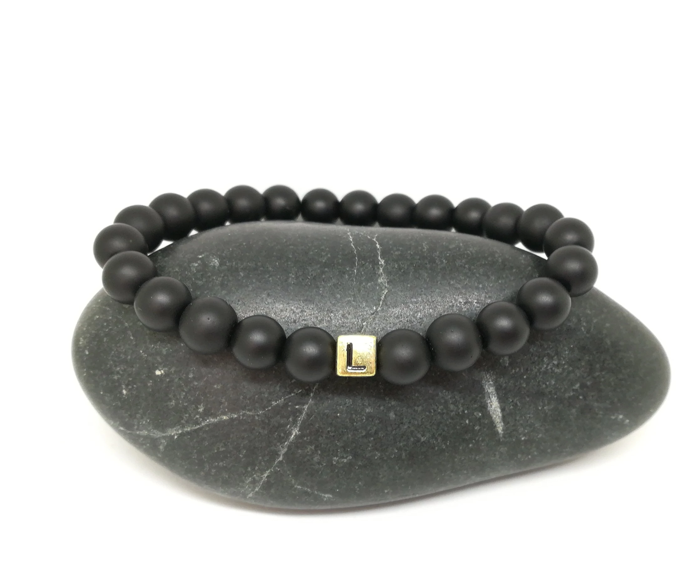 Ez egy gyönyörű egyedi tervezésű 8 mm átmérőjű gyöngyökből készült fekete ónix karkötő, egy betűvel.
