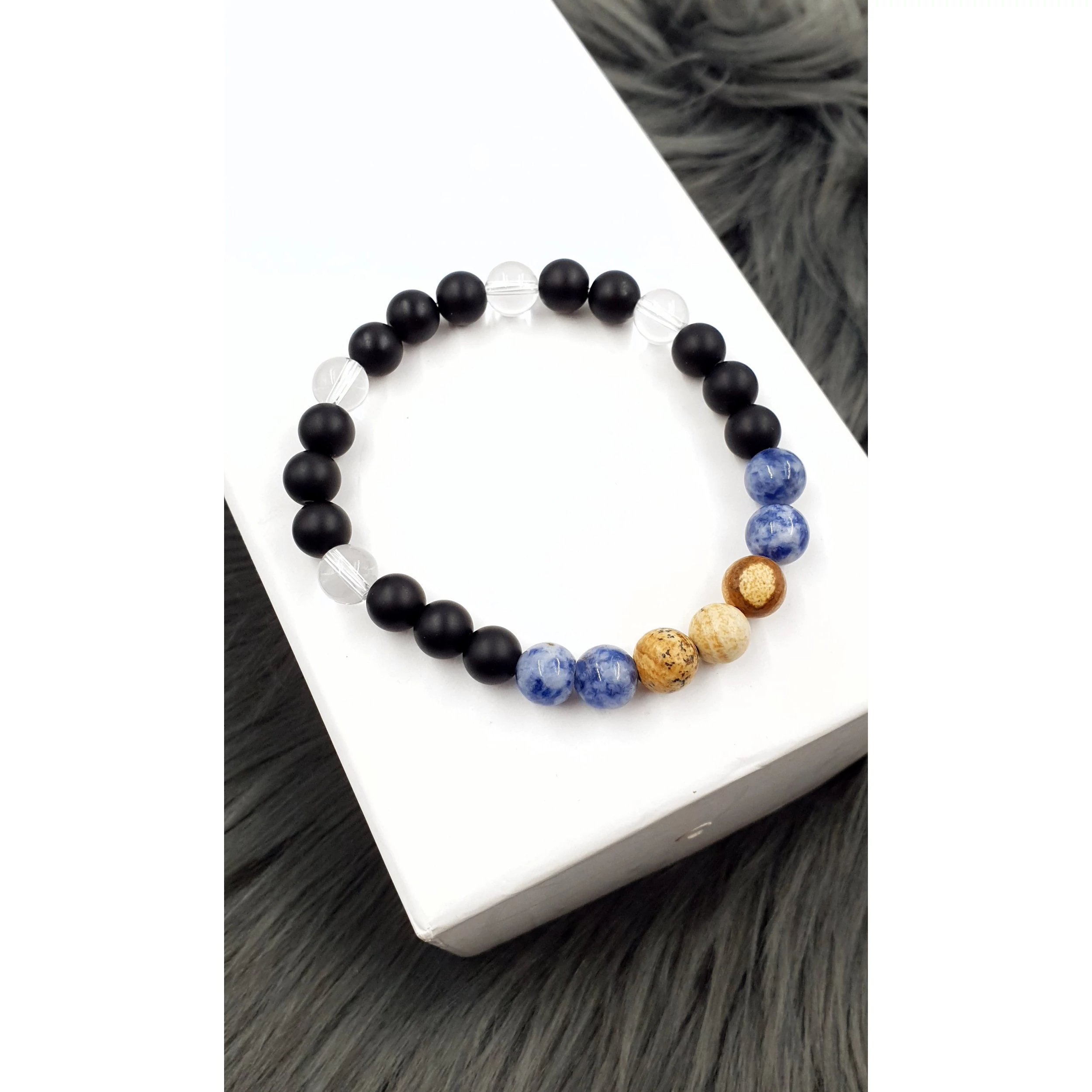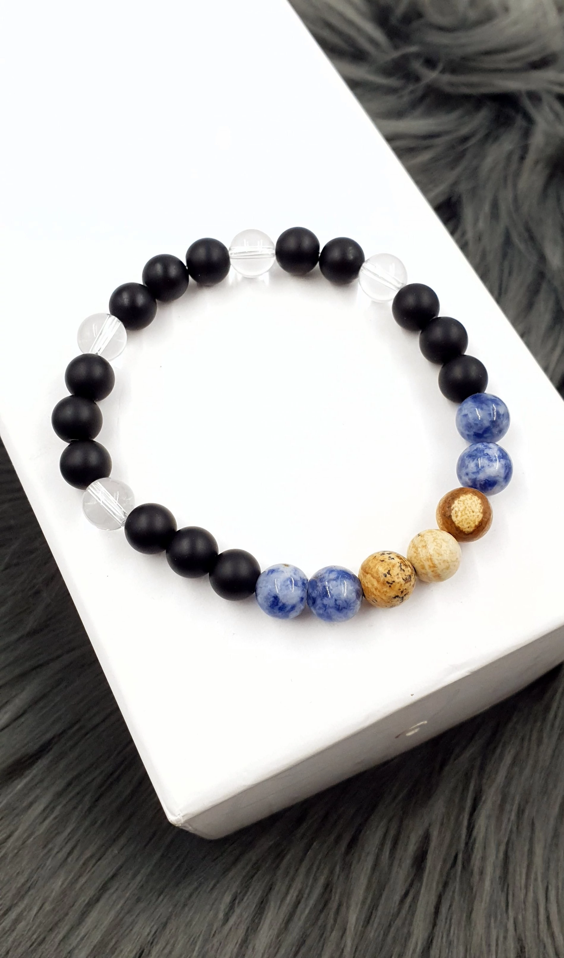 Gyönyörű egyedi férfi karkötő, mely fekete ónix, hegyikristály, szodalit és képjáspis ásványokból lett készítve. Ezen ásványok kombinációjának védő és erősítő hatása van.