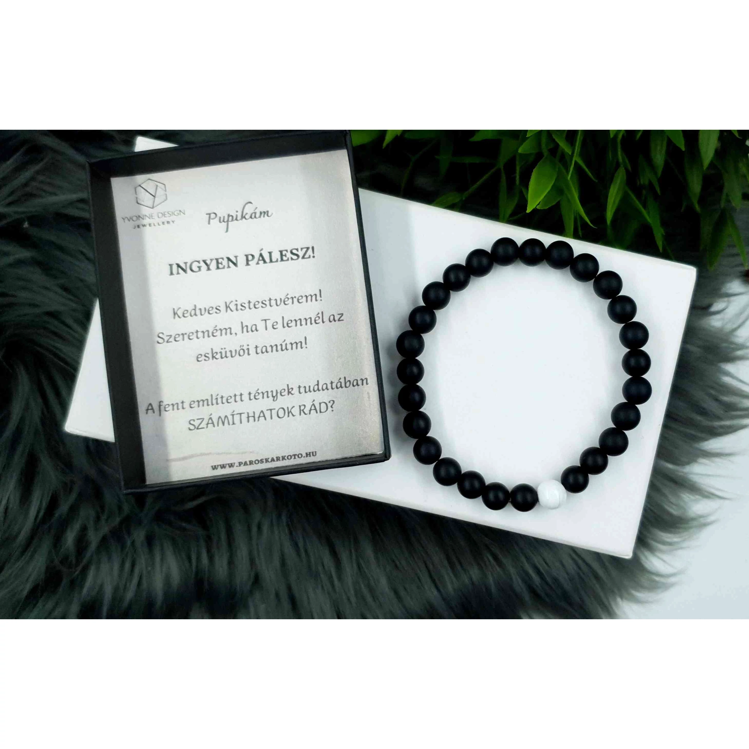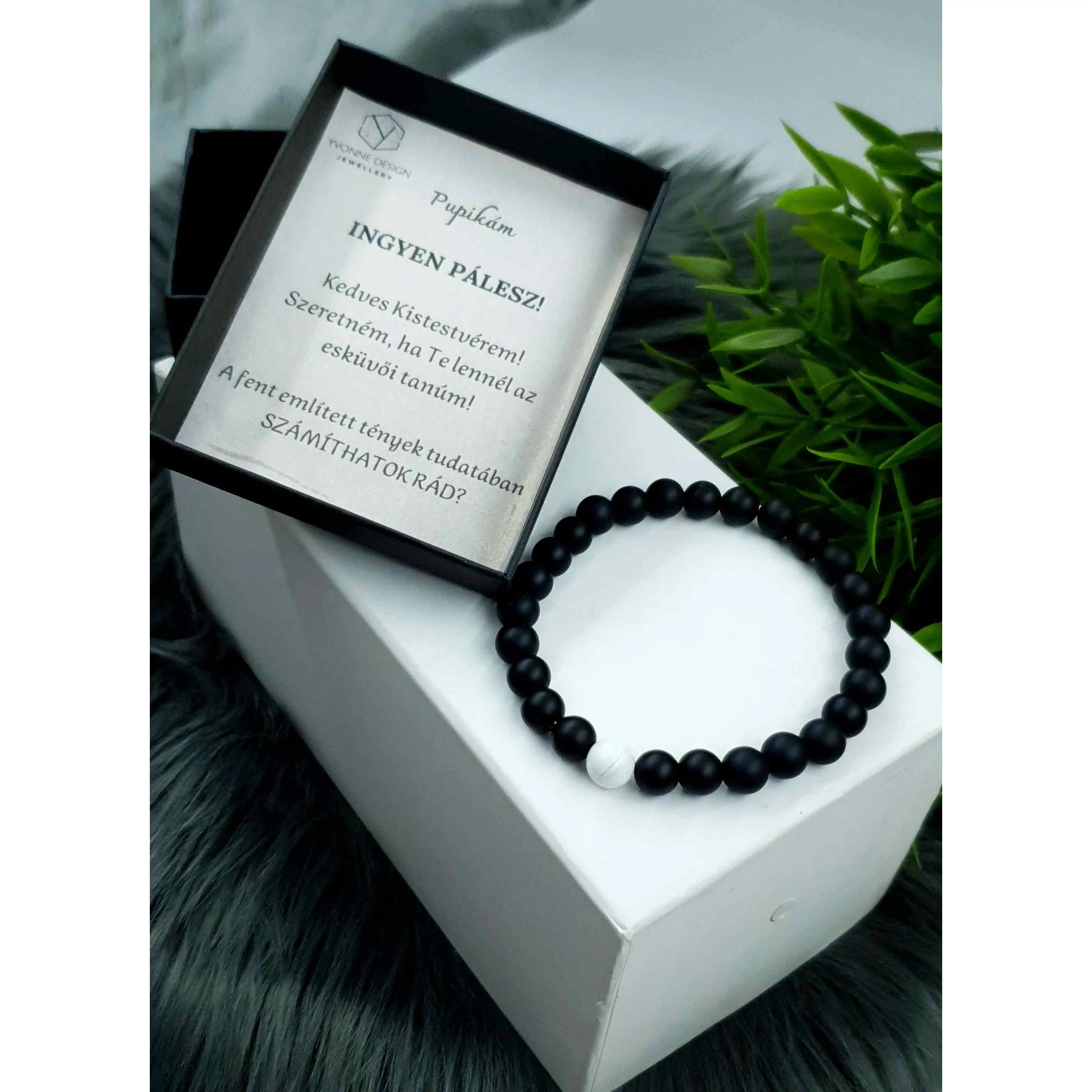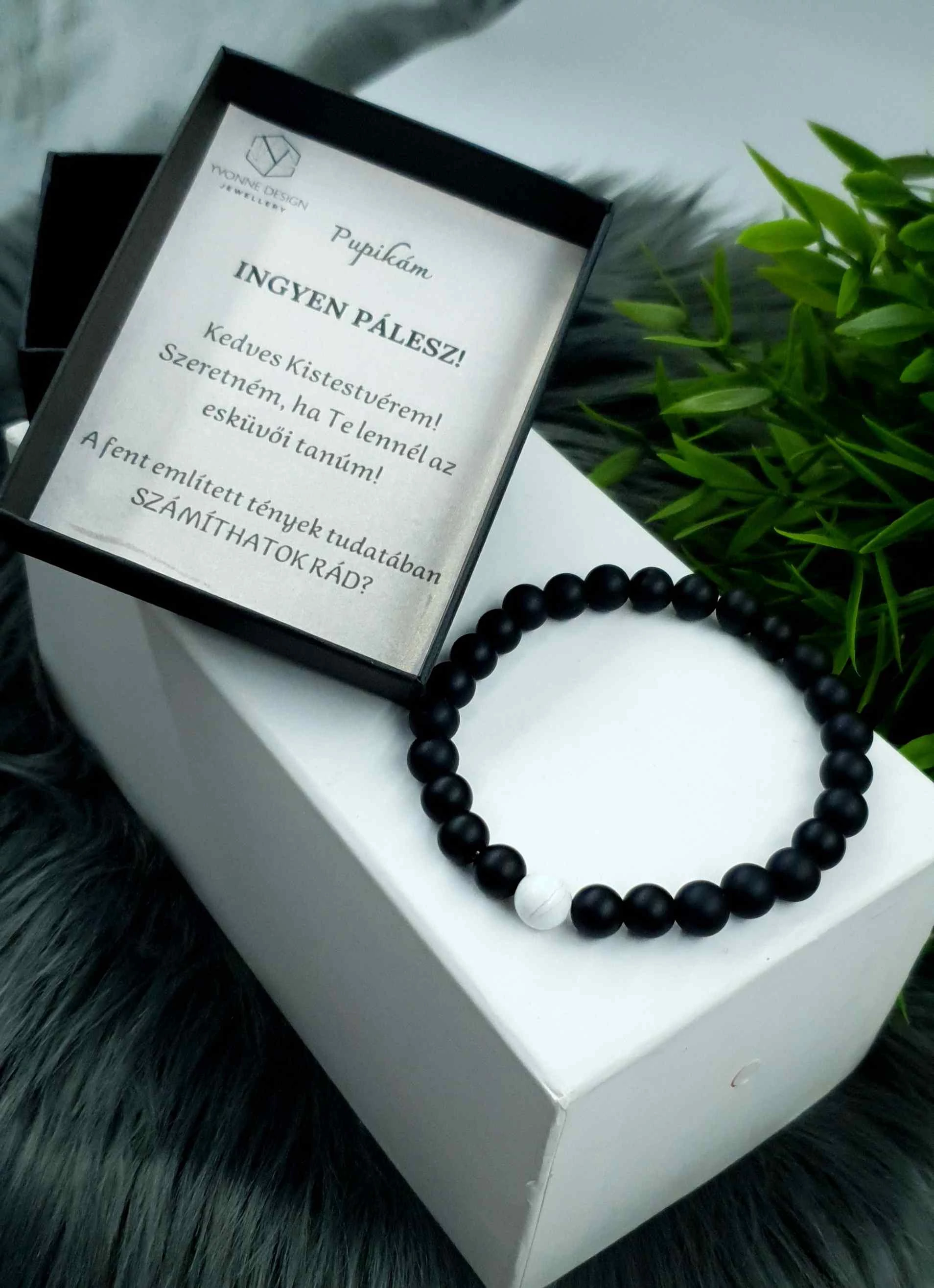 Tanúfelkérő ajándék. Ha szeretnéd felejthetetlenné tenni a pillanatot, amikor felkéred az esküvői tanúdat, vagy ha egy igazán szívhez szóló, megható ajándékkal kedveskednél a leendő tanúdnak, tökéletes választás ez a díszdobozos  ásványkarkötő egyedi betűvel és  személyre szabott üzenettel. A karkötő 8 mm -es matt ónixból és howlit ásványokból készült. Az ajándékszett része a karkötő, a díszdoboz, illetve a doboz belsejében található személyes üzenet, Amennyiben szeretnél változtatni  a megadott szövegen, idézőjelben add meg nekünk, hogy egyértelmű legyen számunkra, mit szeretnél látni a díszdoboz belsejében!