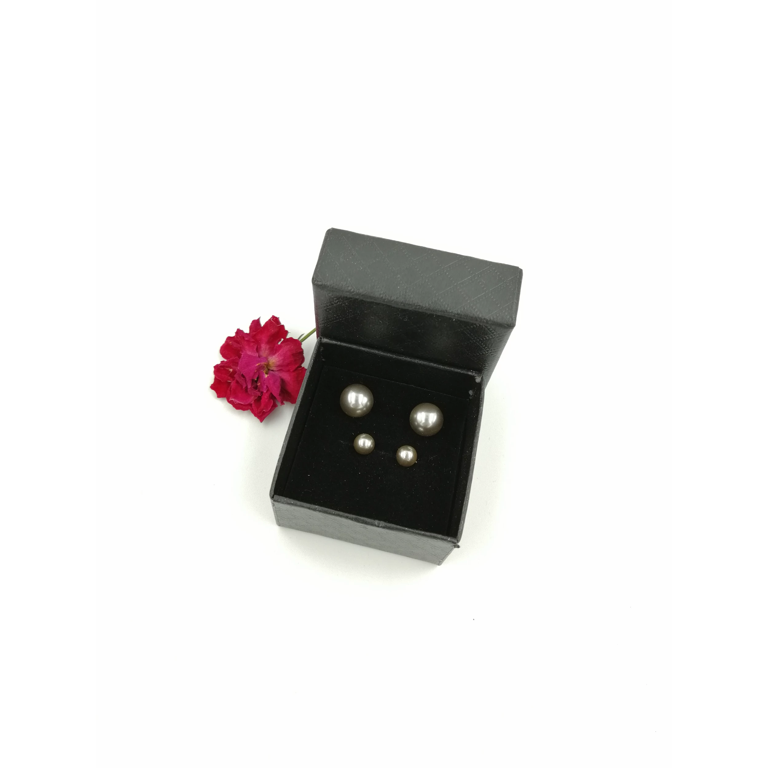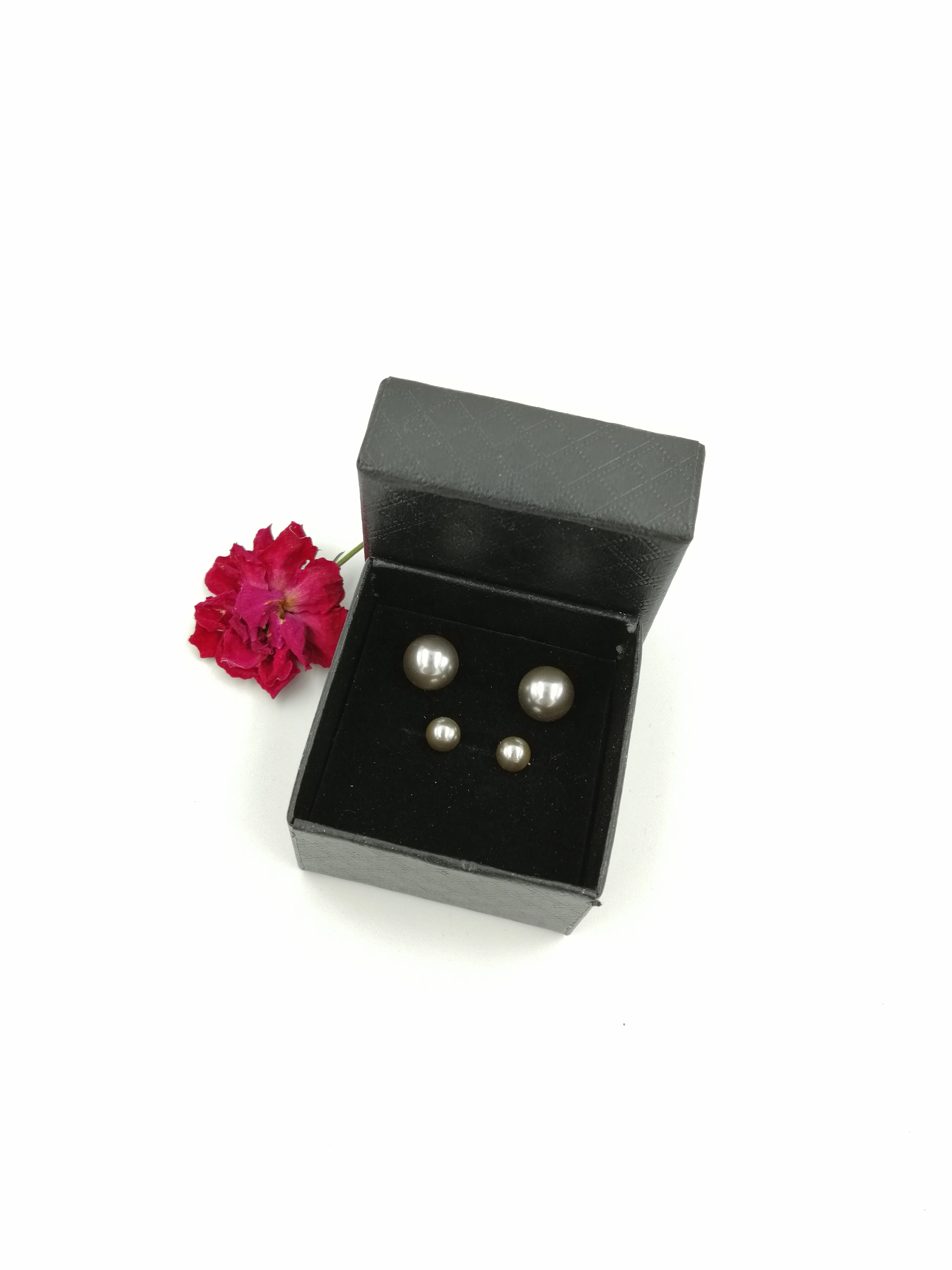 Bedugós bizsu  2 párt tartalmazó fülbevalószett, díszdobozban. Az egyik fülbevalópár 10 mm átmérőjű grafitos gyöngyház szín bedugós fülbevaló, a másik pár 6 mm átmérőjű  grafitos gyöngyház szín fülbevalópár. A bedugós fülbevalók hátul szilikon gumitappanccsal és ezüst fülbevalózáróval záródnak. A fülbevalókat a képen látható ajándék díszdobozban küldjük ki a vevőnek :)