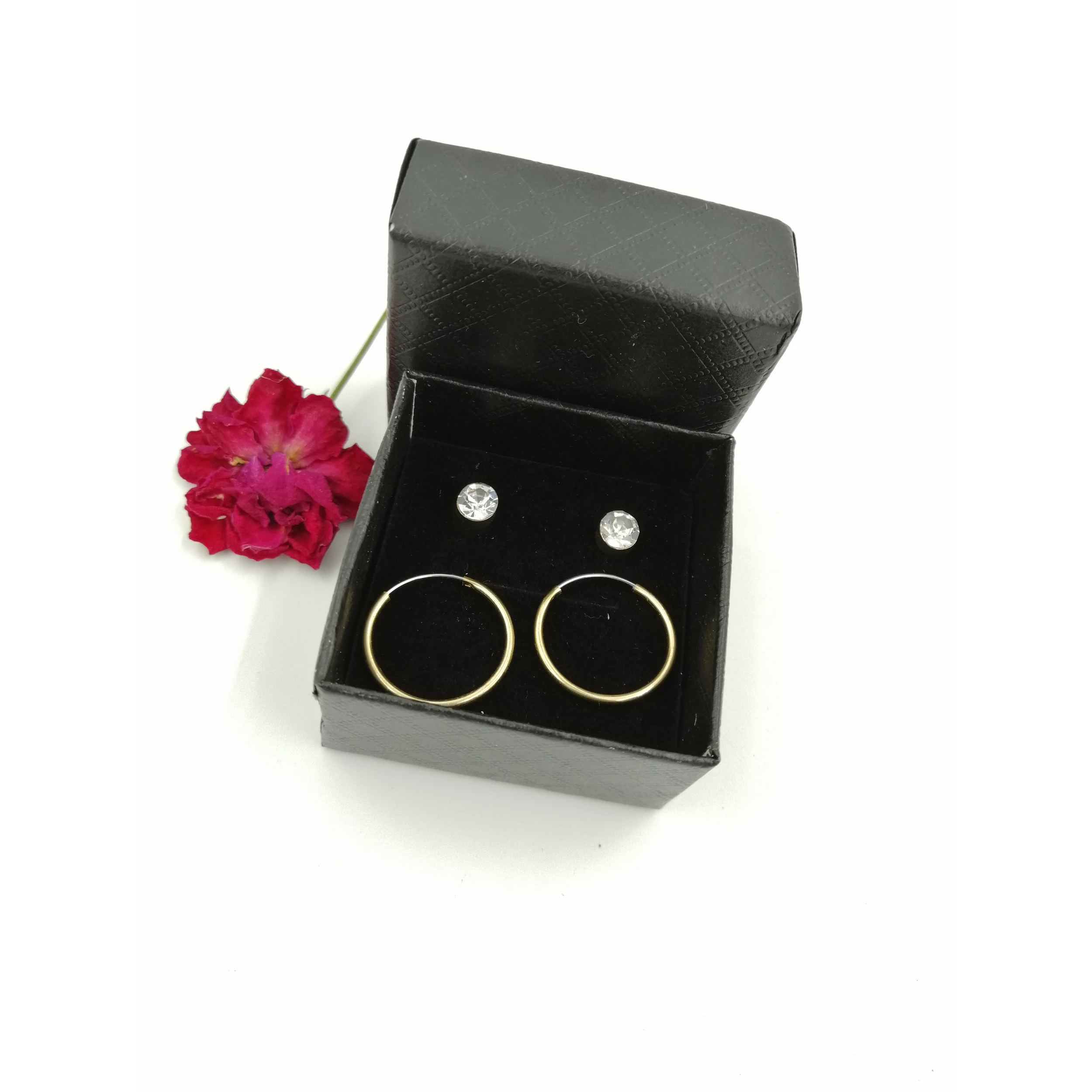 A fülbevalószett 1 pár bedugós strasszköves fülbevalópárt tartalmaz, illetve 1 pár 1 cm átmérőjű karika fülbevalópárt. A fülbevalókat a képen látható ajándék díszdobozban küldjük ki a vevőnk :)