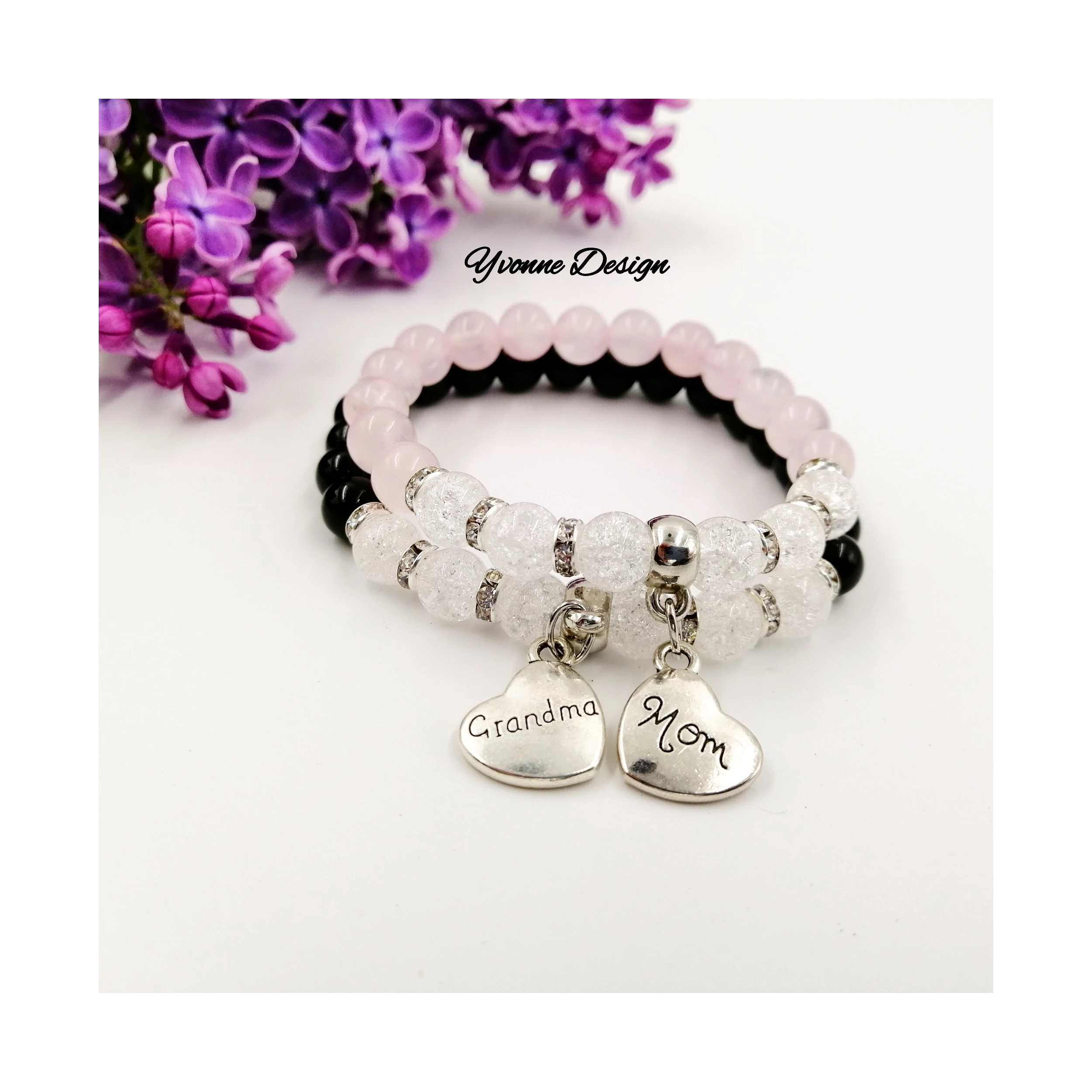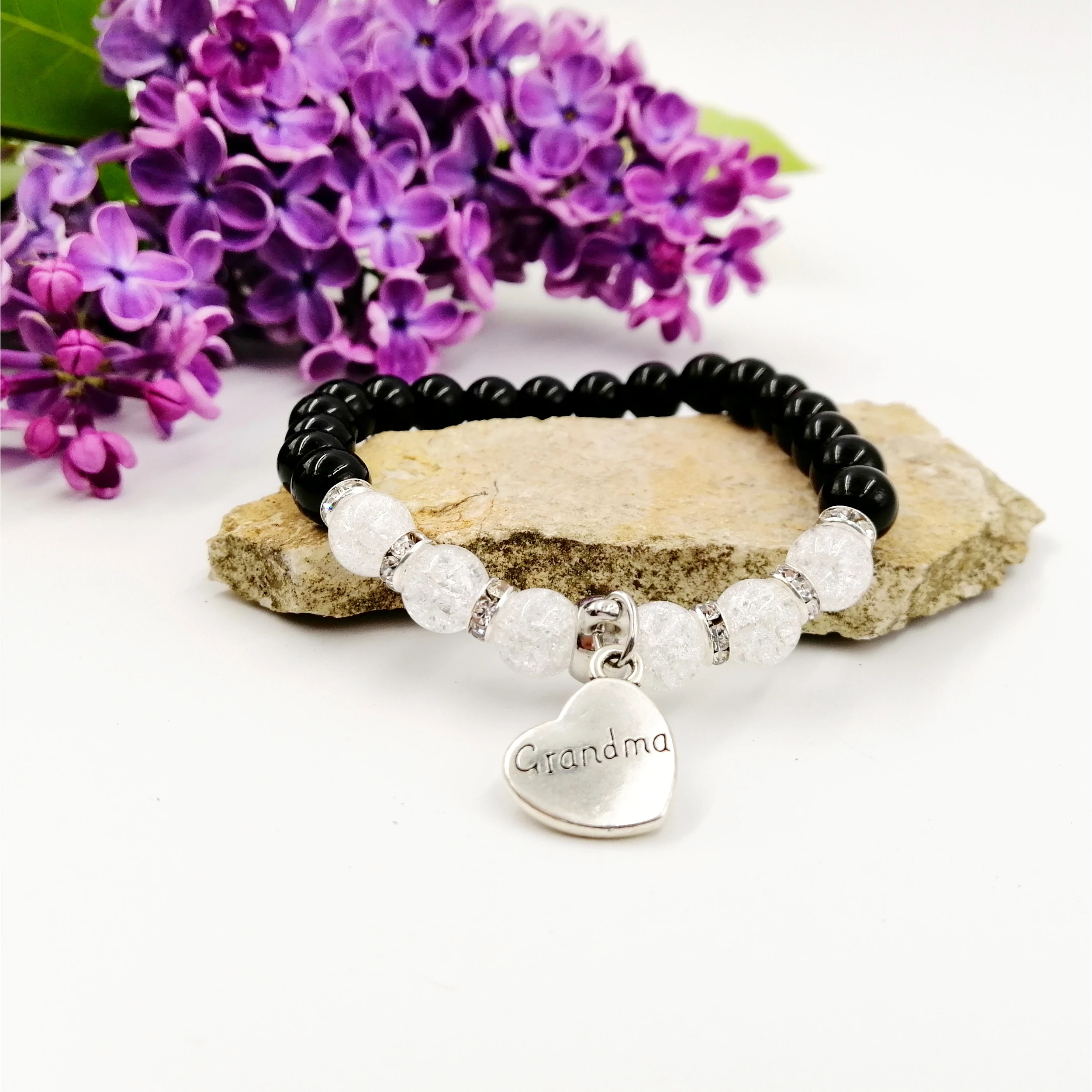 Gyönyörű egyedi tervezésű ónix és hegyikristály ásványokból készült "Grandma" (Nagymama) feliratos karkötő.