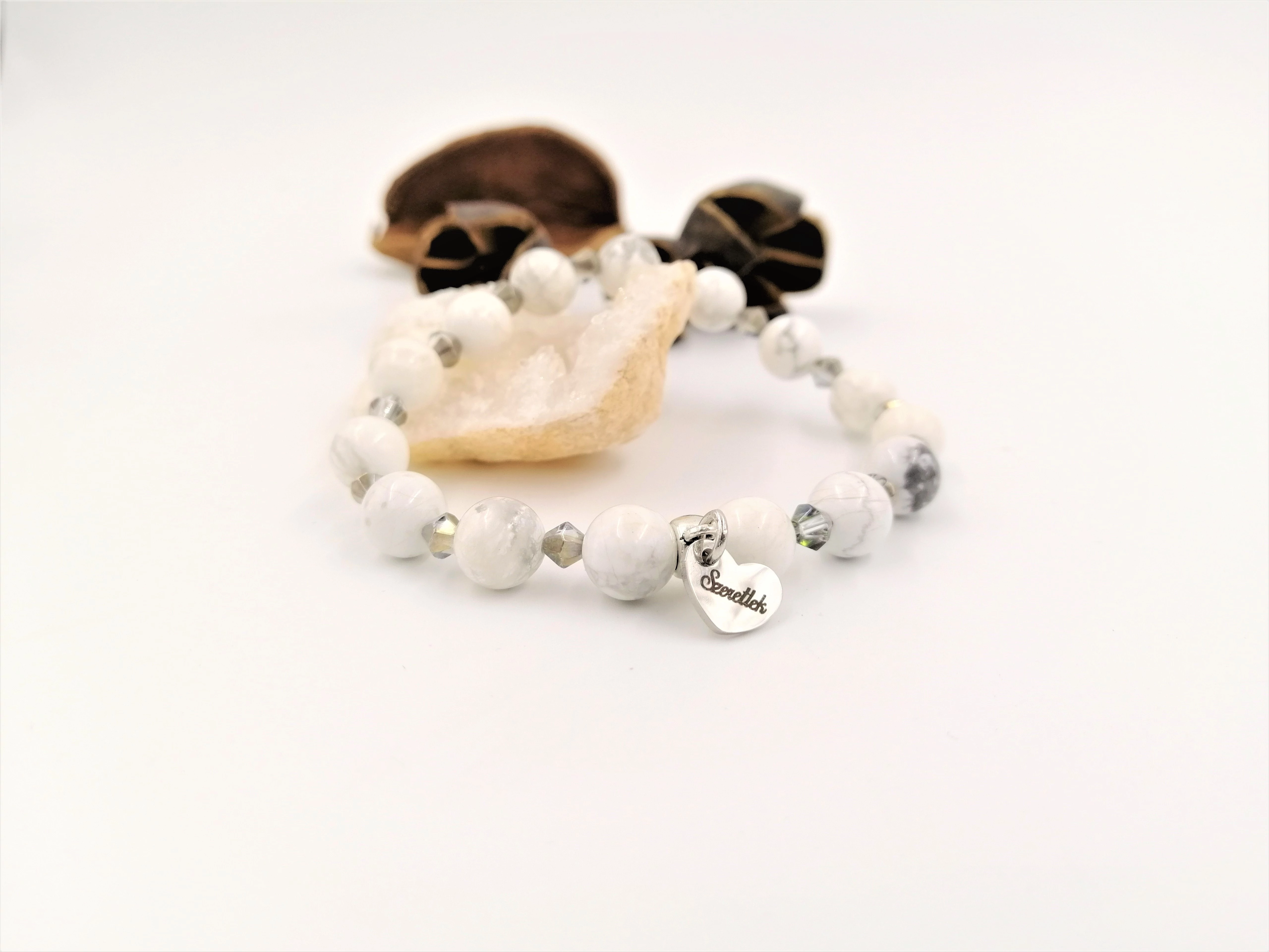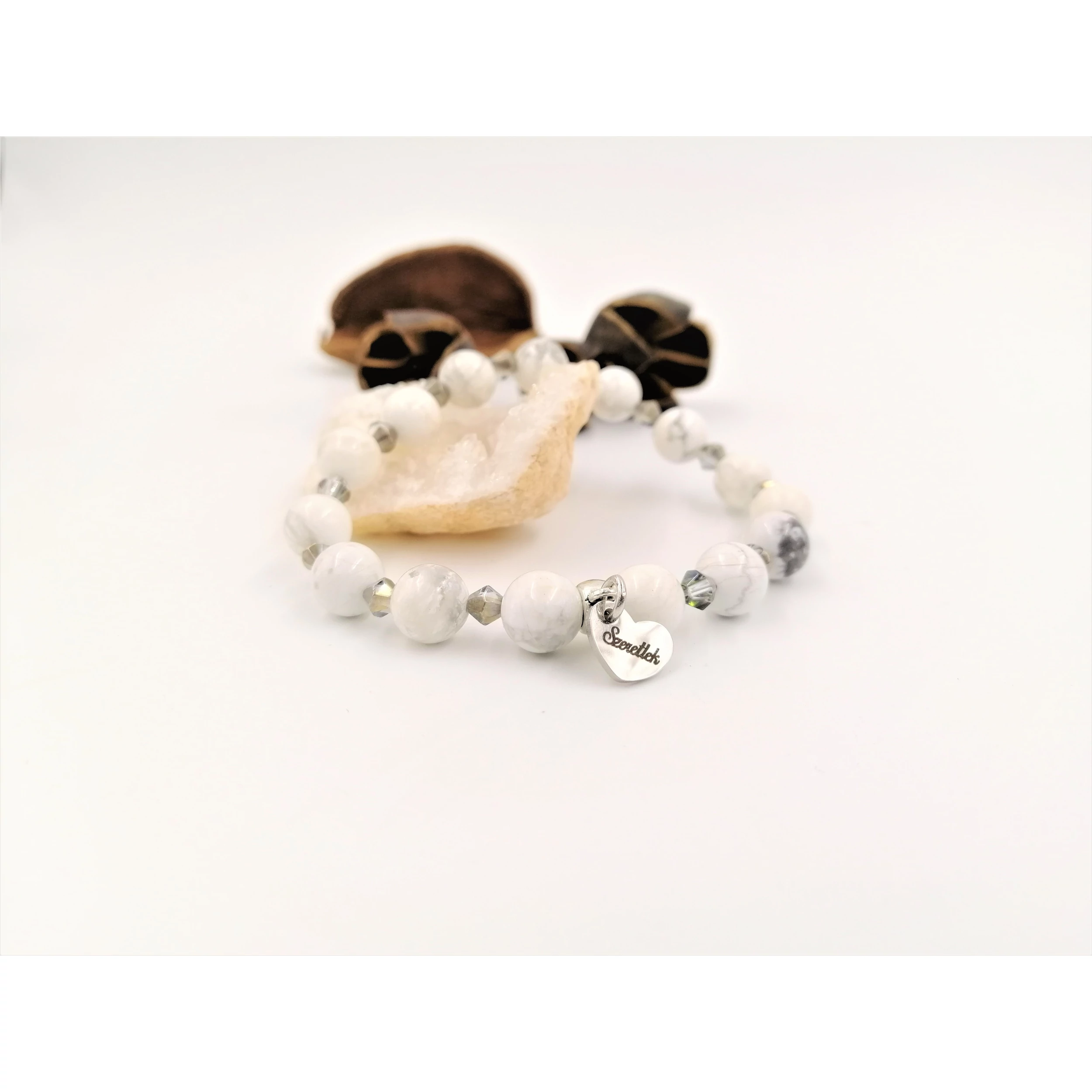 Gyönyörű egyedi tervezésű robbantott hegyikristály és ónix ásványokból készült, gravírozott "Szeretlek"  medálkás karkötő.