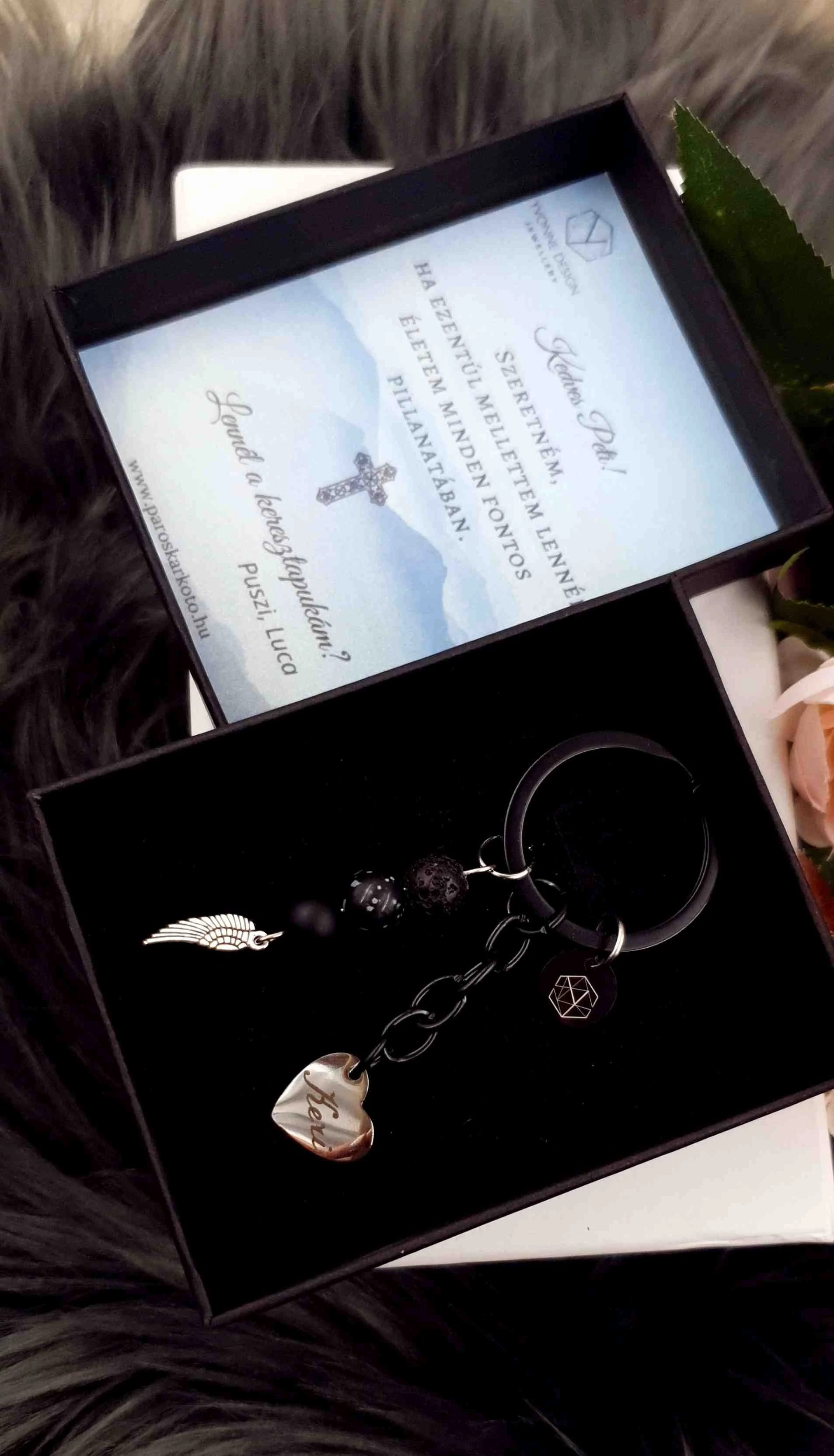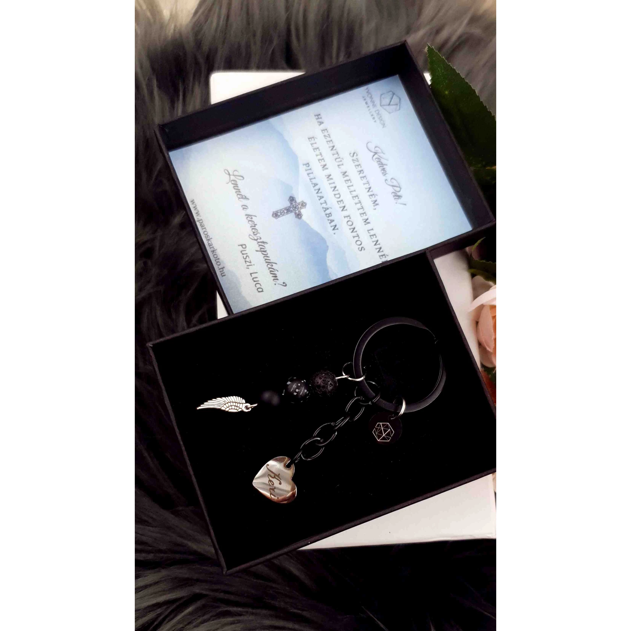 Keresztszülő felkérő díszdobozos  kulcstartó  személyre szabottan egyedi üzenettel. A kulcstartó 8 mm -es  ásványokból lettek készítve, és tartalmaz egy védelmező angyalszárny medált, és egy "Keri" feliratos szívecskét, mindezt fekete kulcstartó alappal és díszítéssel.