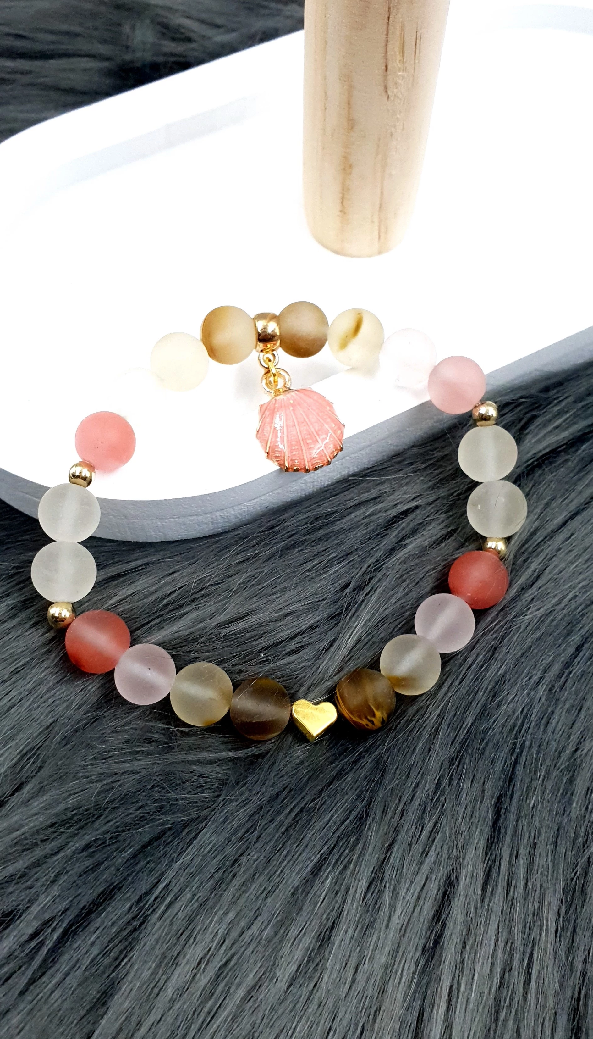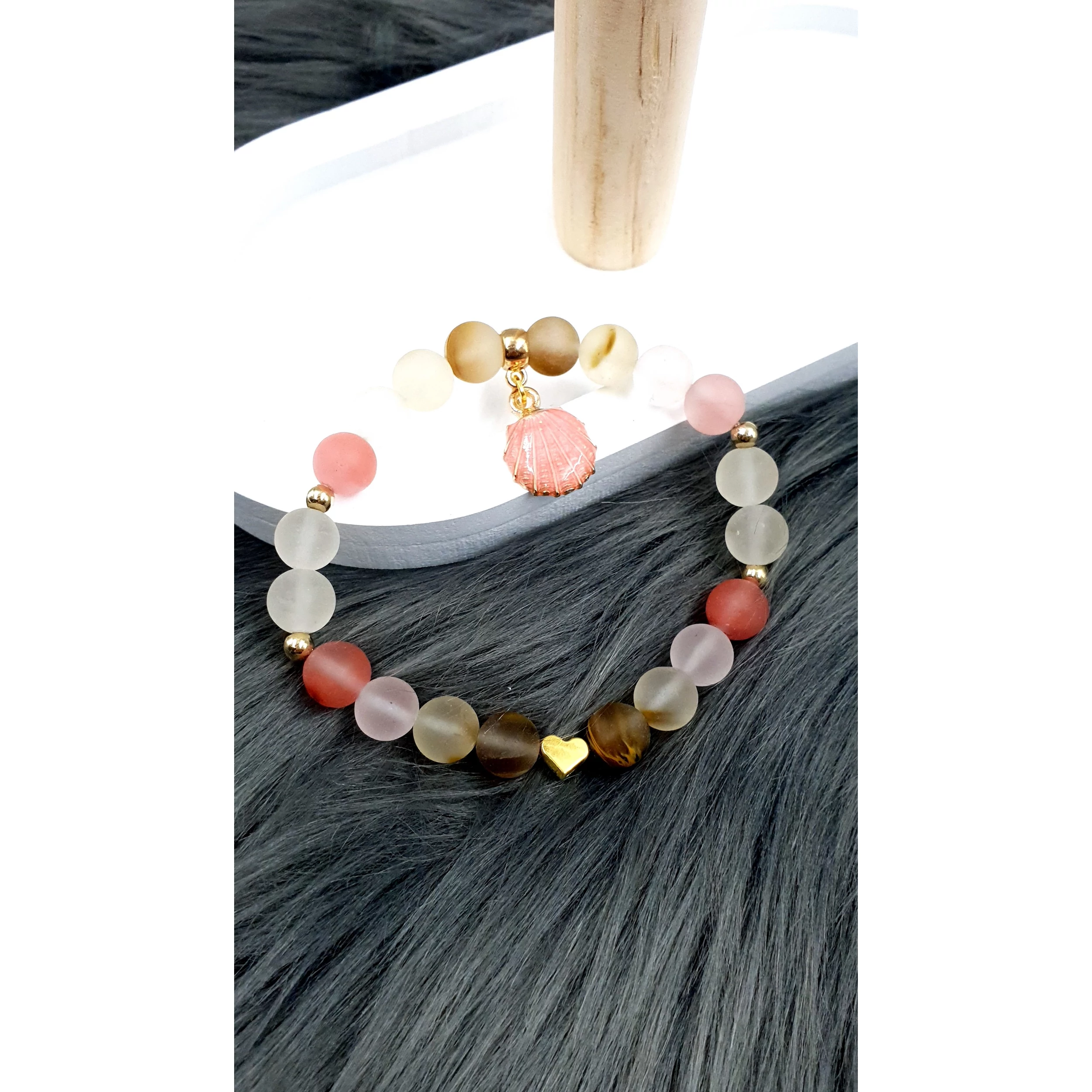 Gyönyörű csiszolt, 8mm átmérőjű Rózsaopál kagyló medálos ásványkarkötő, arany díszítéssel.
