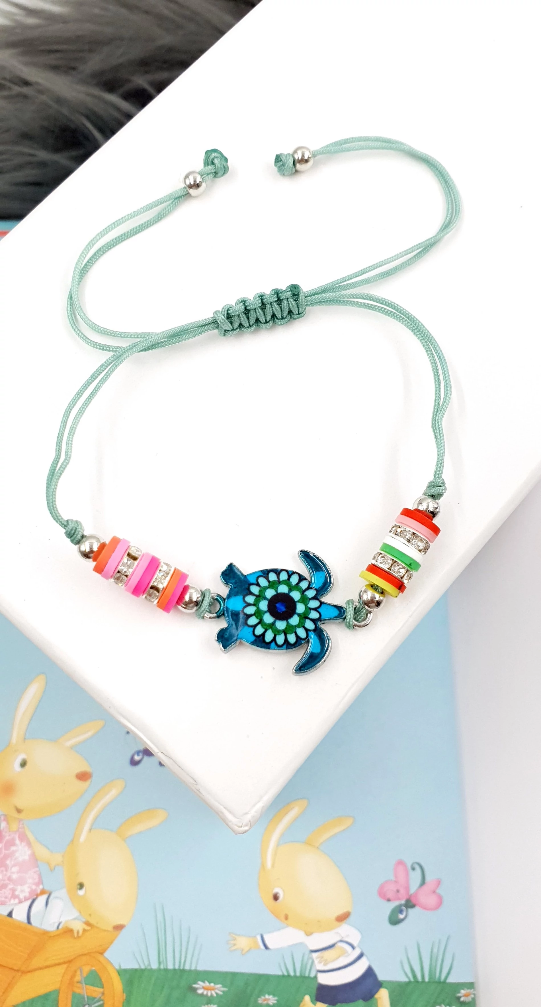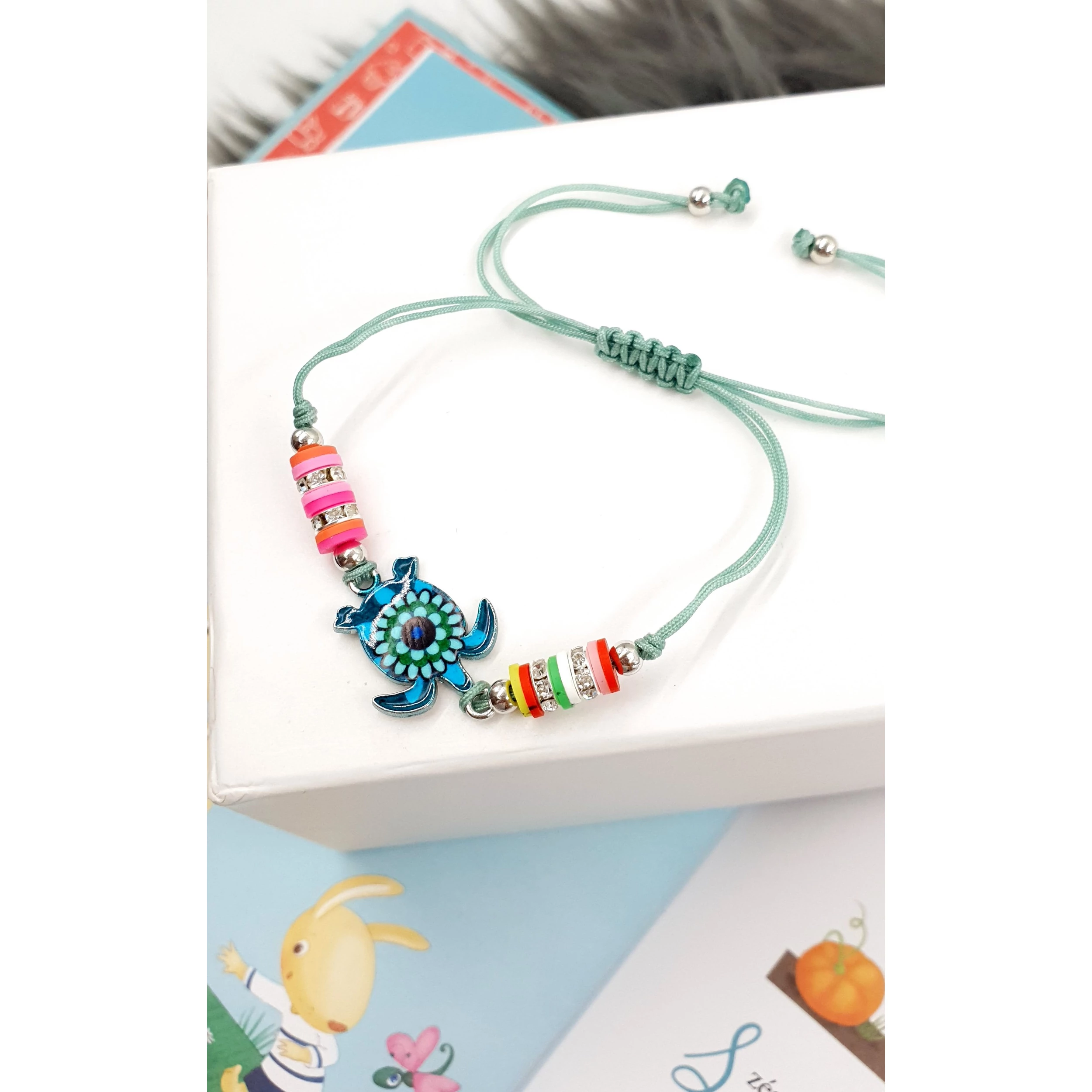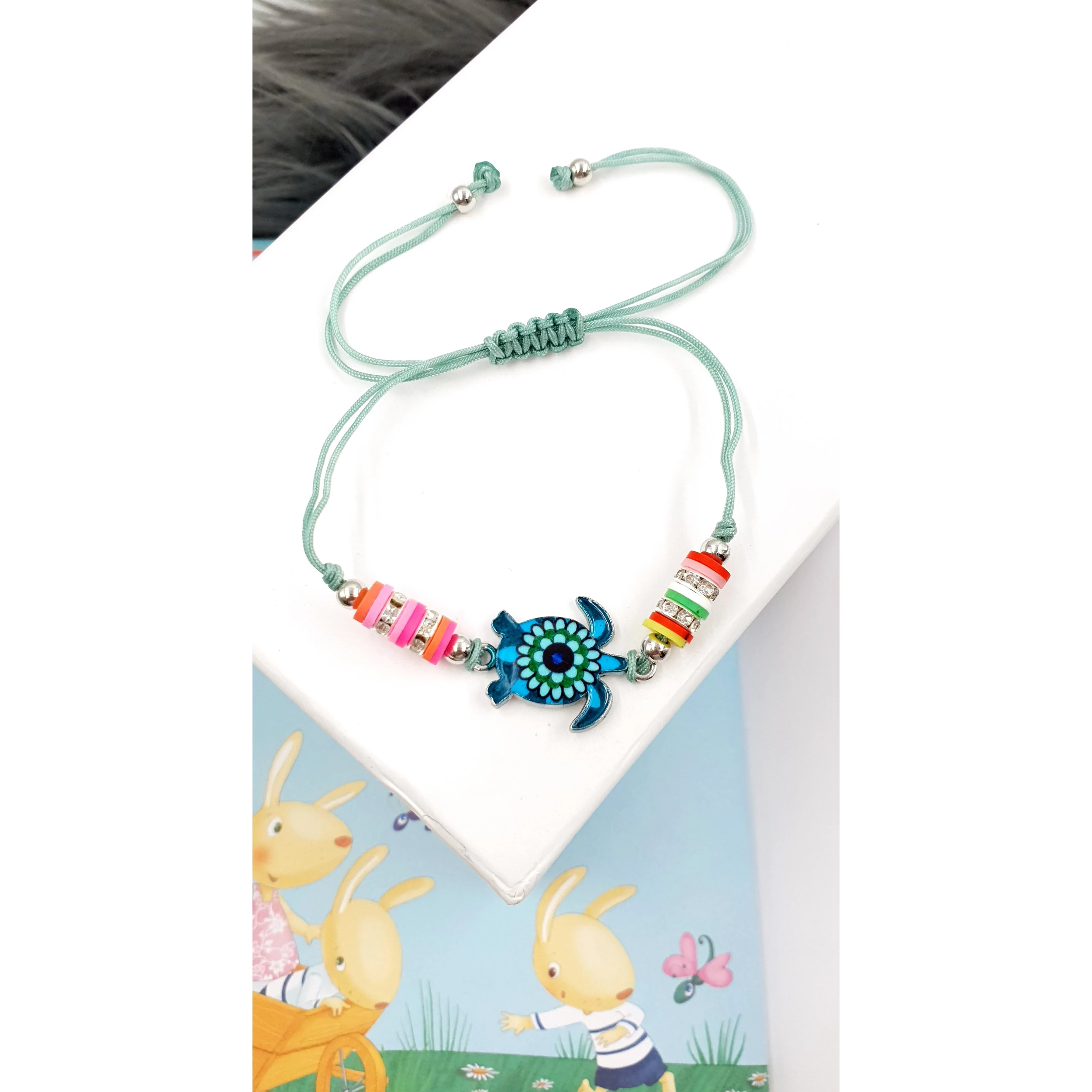 Gyönyörű teknős medálos gyerek zsinór karkötő, a mérete a behúzószárakkal állítható.