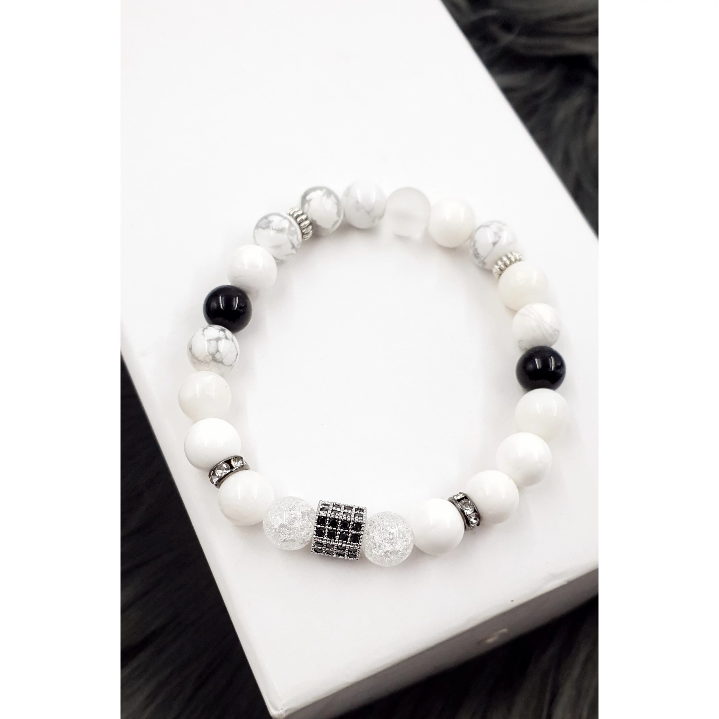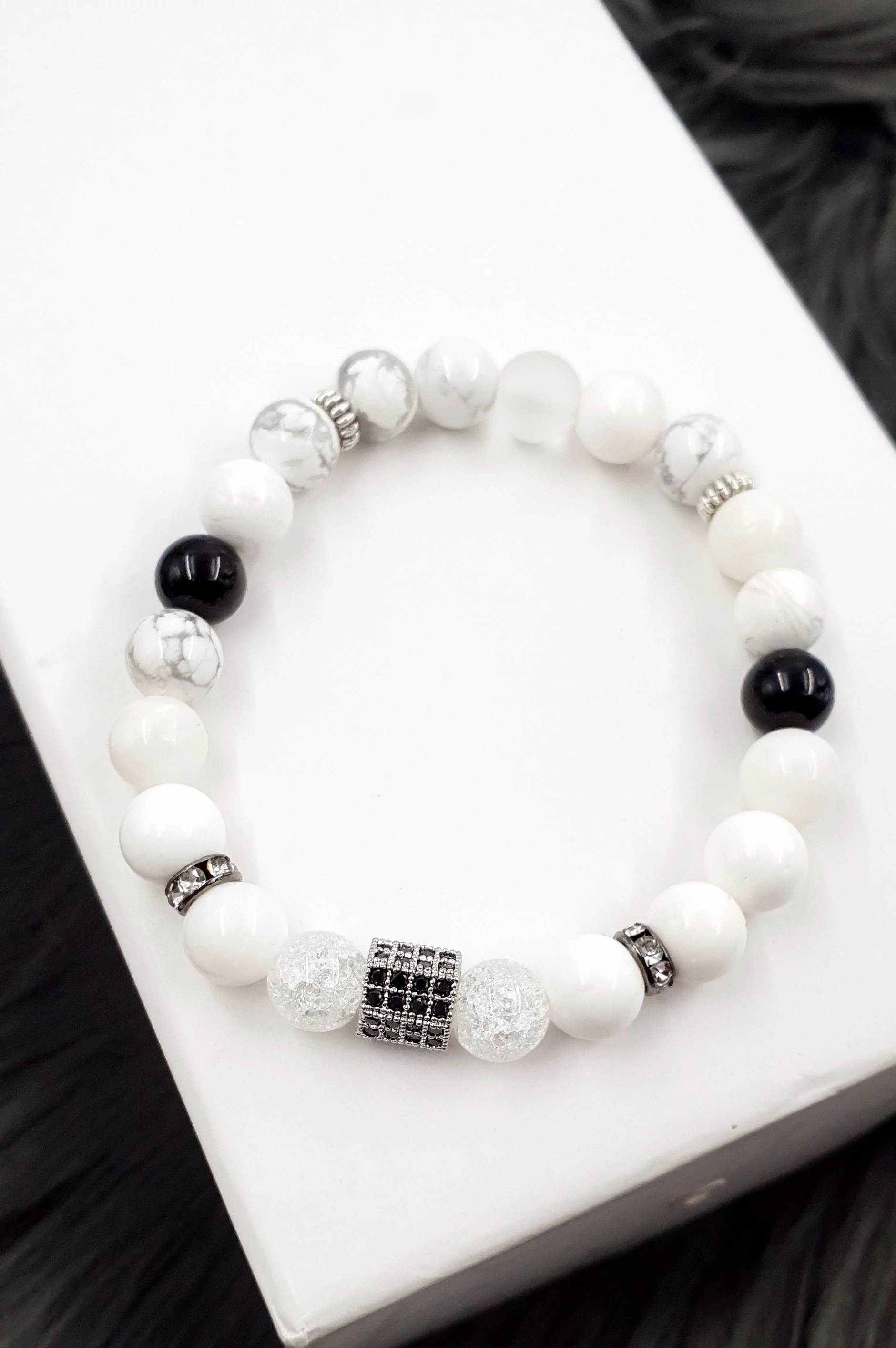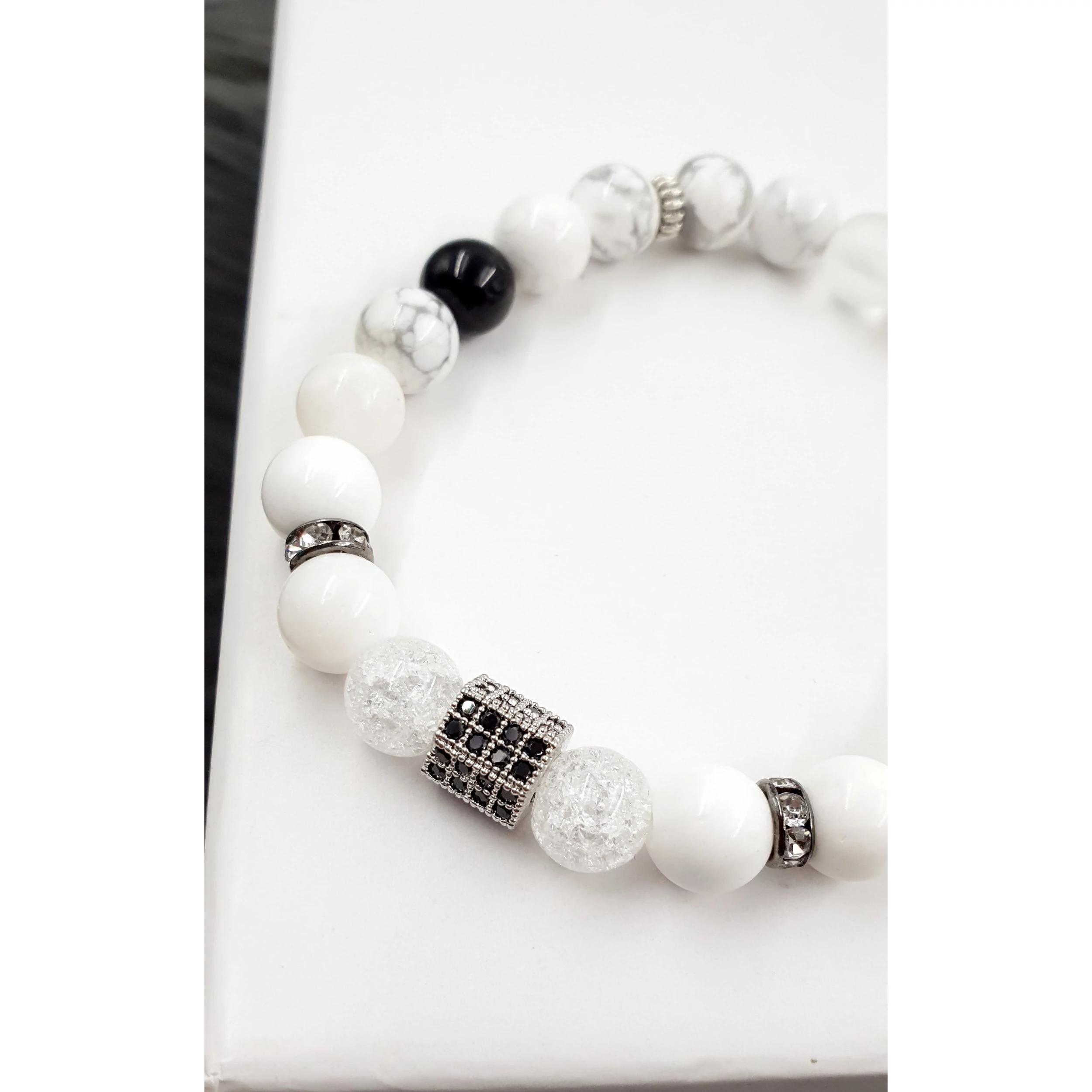 Gyönyörű Yvonne Design LUXURY ásványkarkötő, howlit, tejkvarc és matt és roppantott hegyikristály ásványokból illetve matt fekete ónix ásványból kéászítve.