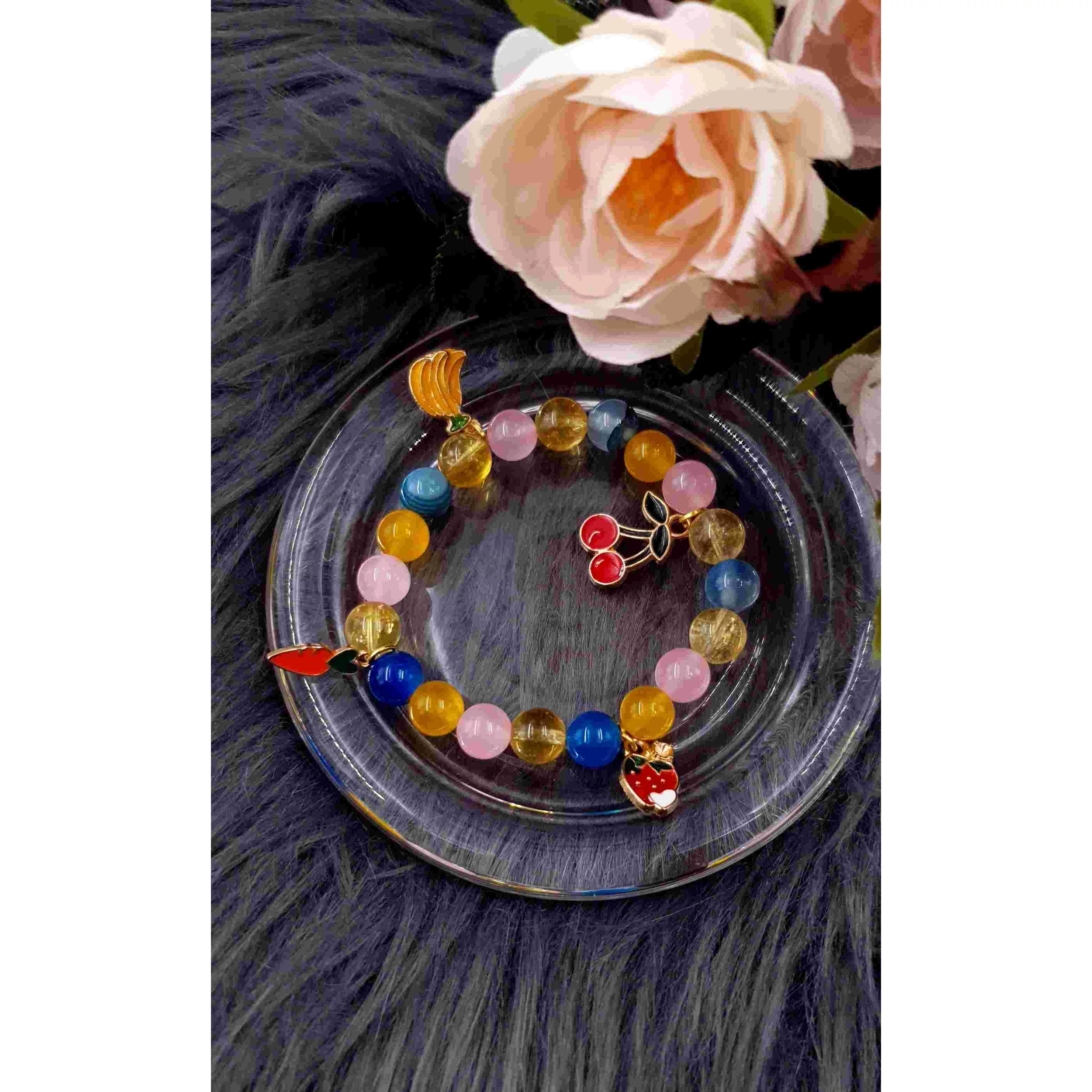 Gyümölcsös gyerek charmkarkötő, mely 8 mm-es rózsakvarc, achát és citrin ásványokból készült, aranyszín gyümölcs medálokkal.