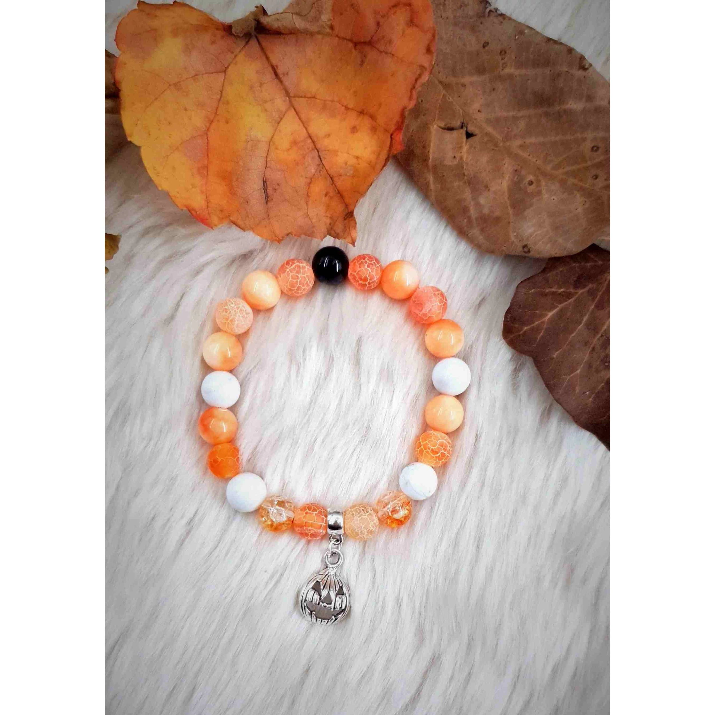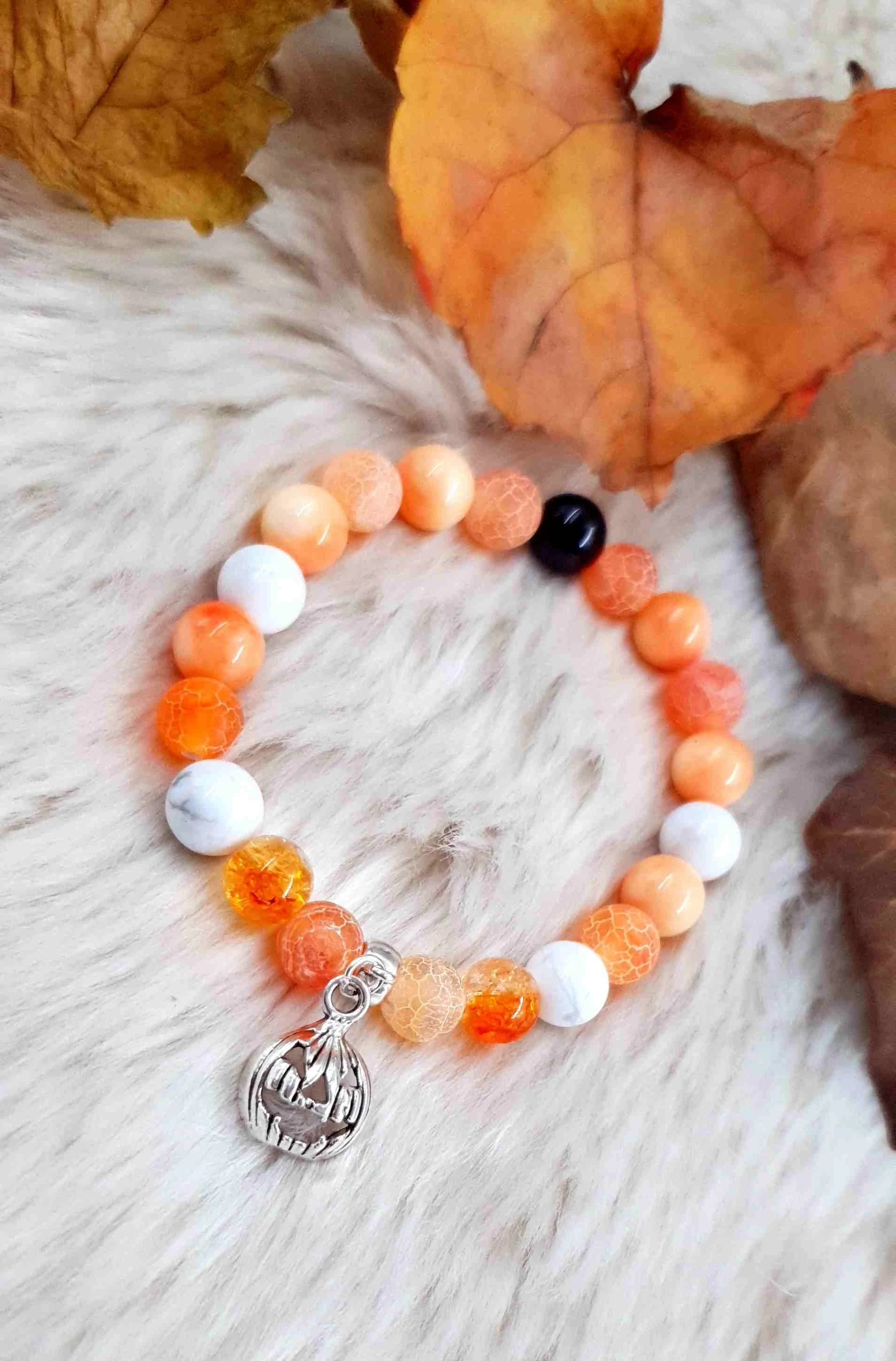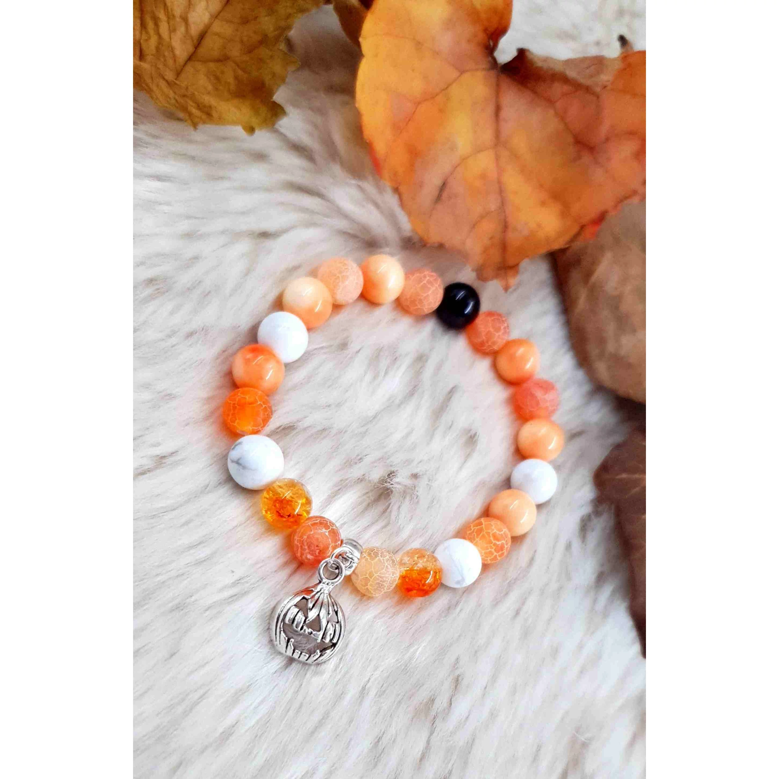 Egyedi tervezésű narancs achát ásványokból készült őszi hangulatú ásványkarkötő halloween tök medállal.