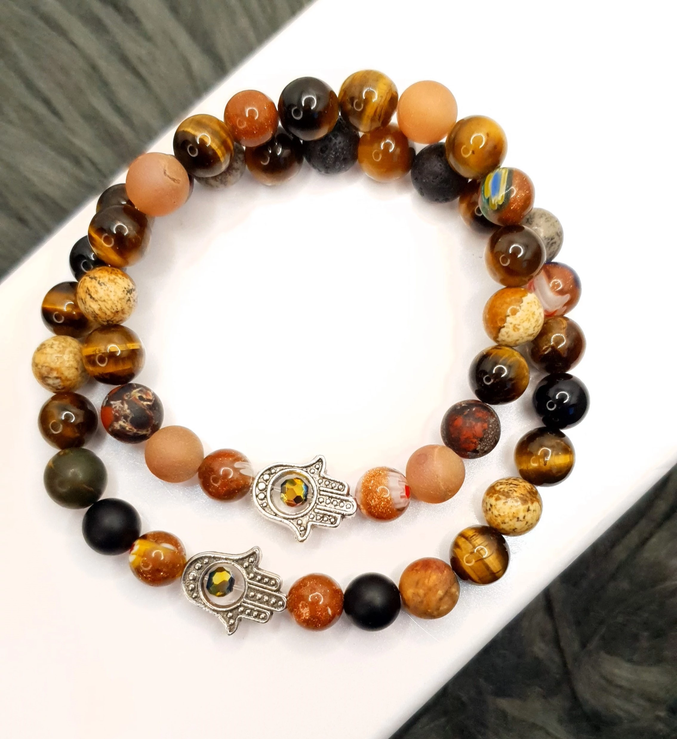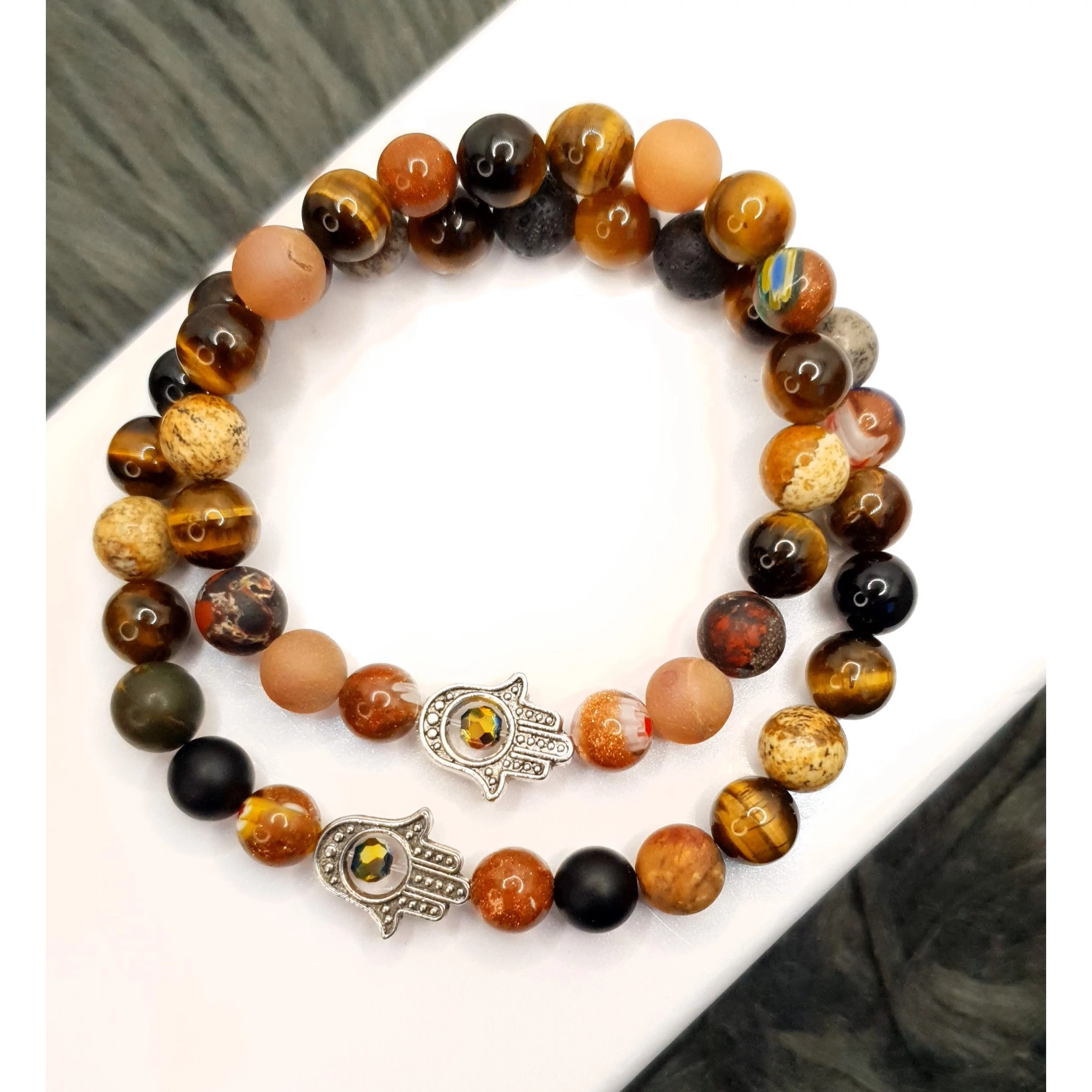 Gyönyörű, egyedi tervezésű, a föld színeit tartalmazó jáspis ásványokból készült karkötőpár, hamzsakéz medálokkal. A karkötőpár az összetartozást szimbolizálja a szerelmesek között!