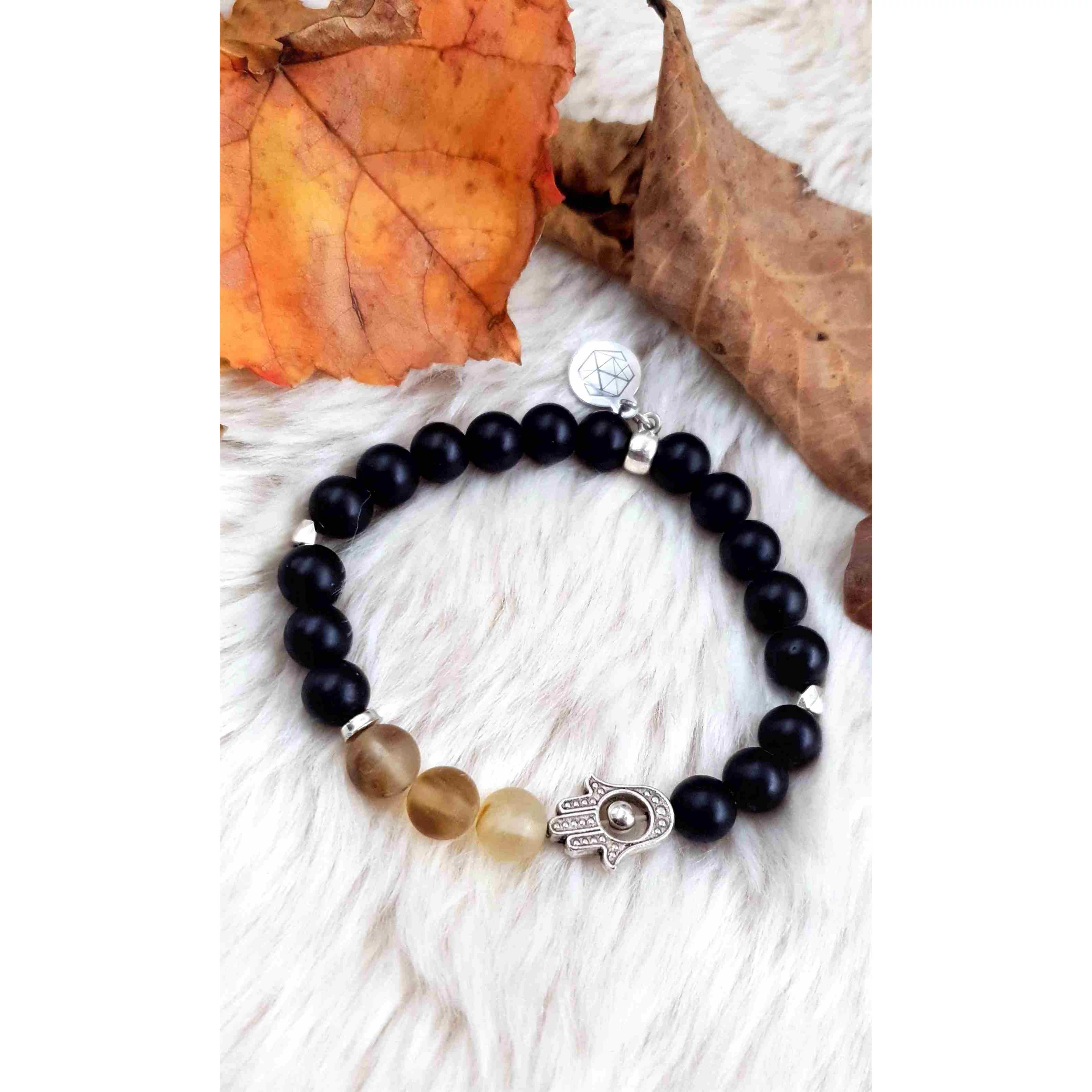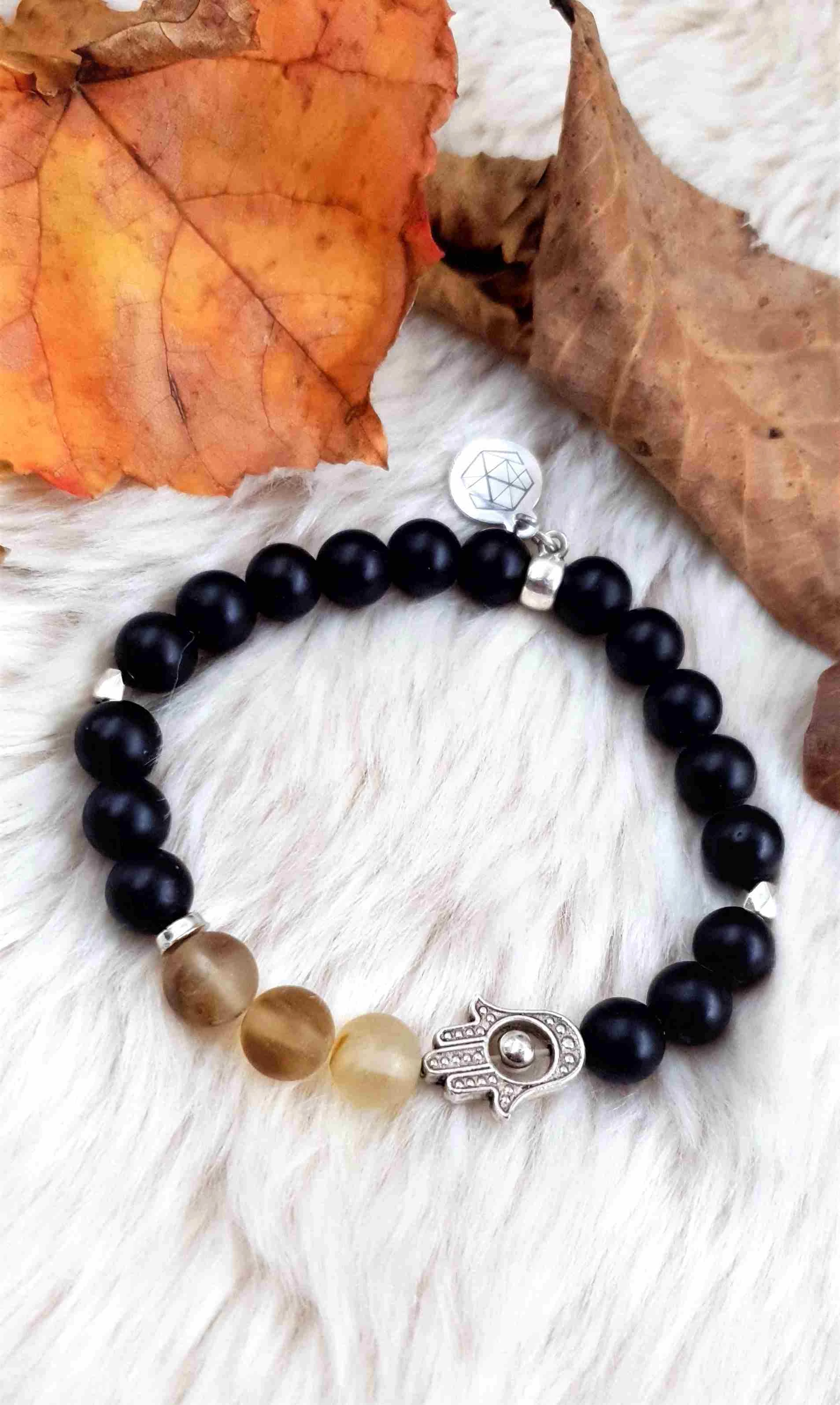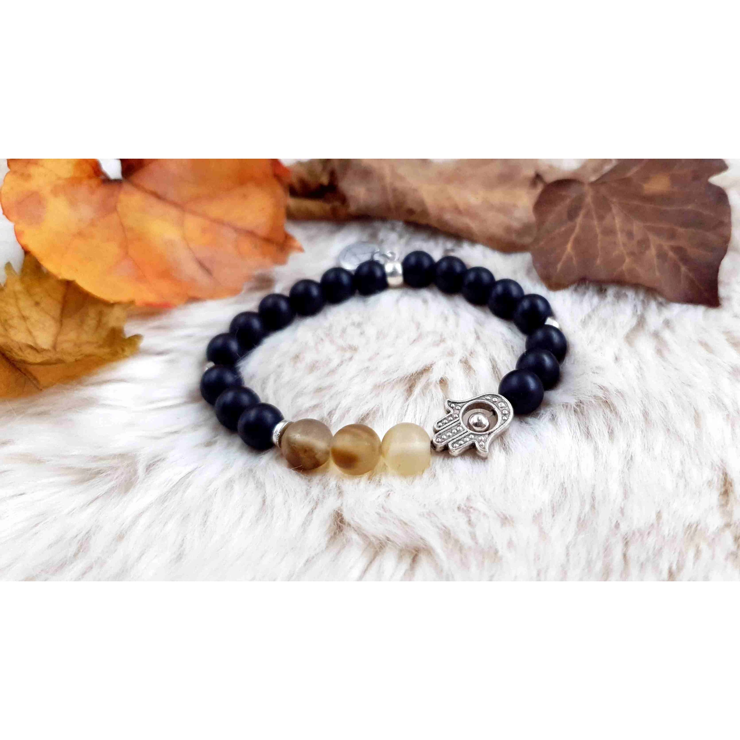 Egyedi tervezésű Yvonne Design hamzsakéz ásványkarkötő ónix és rózsaopál ásványokból, ezüstszín díszítéssel.
