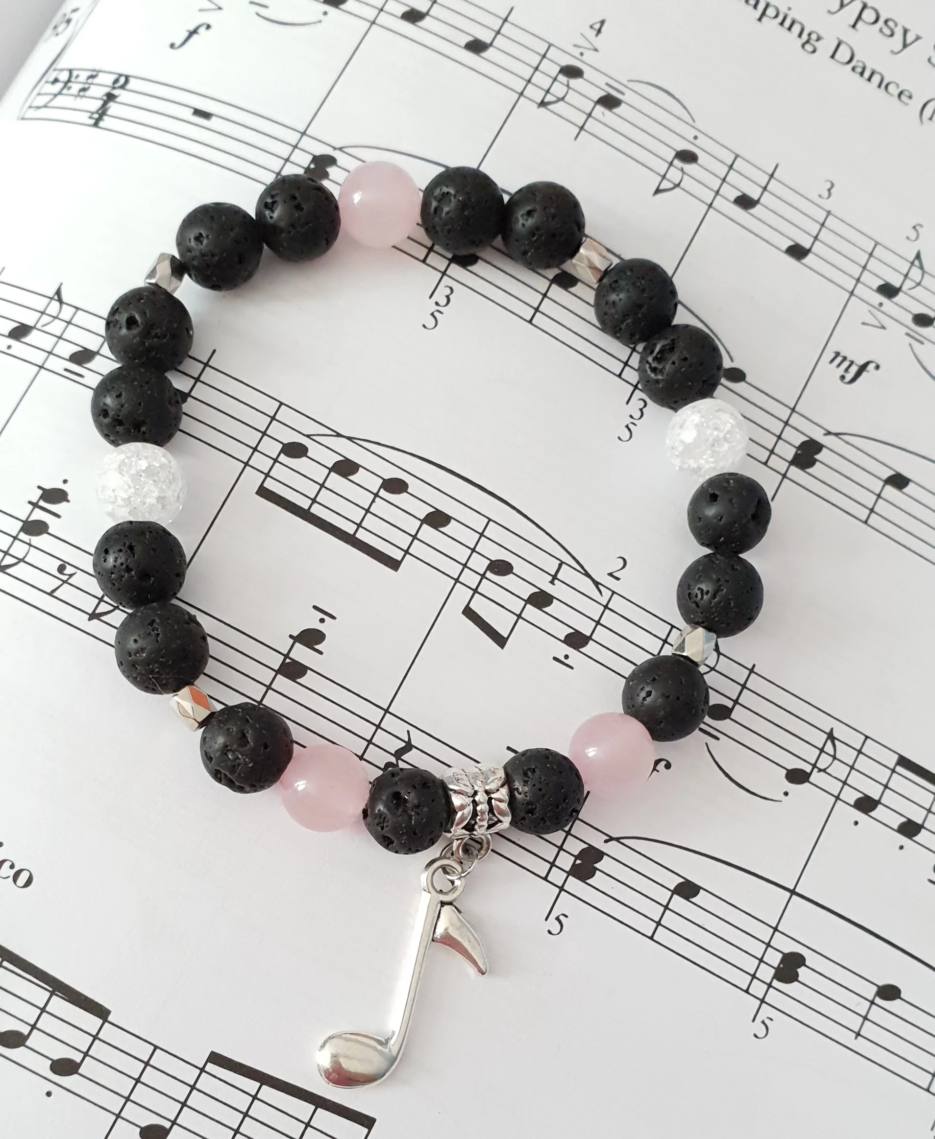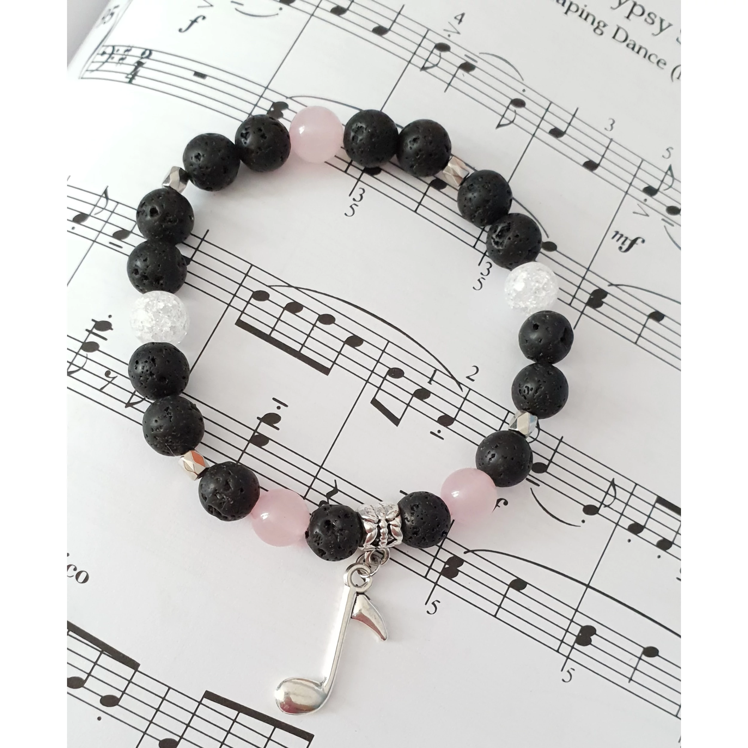 Gyönyörű csiszolt, 8mm átmérőjű Hangjegy medálos lávakő rózsakvarc ásványkarkötő.
