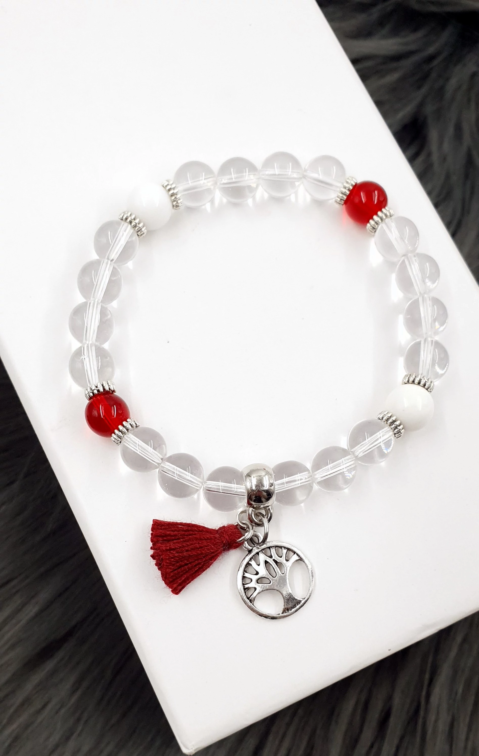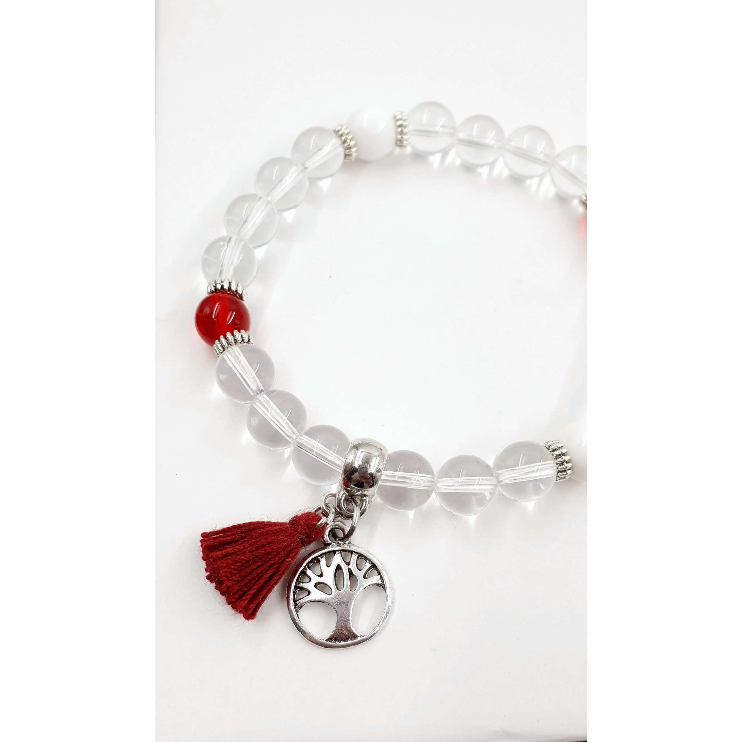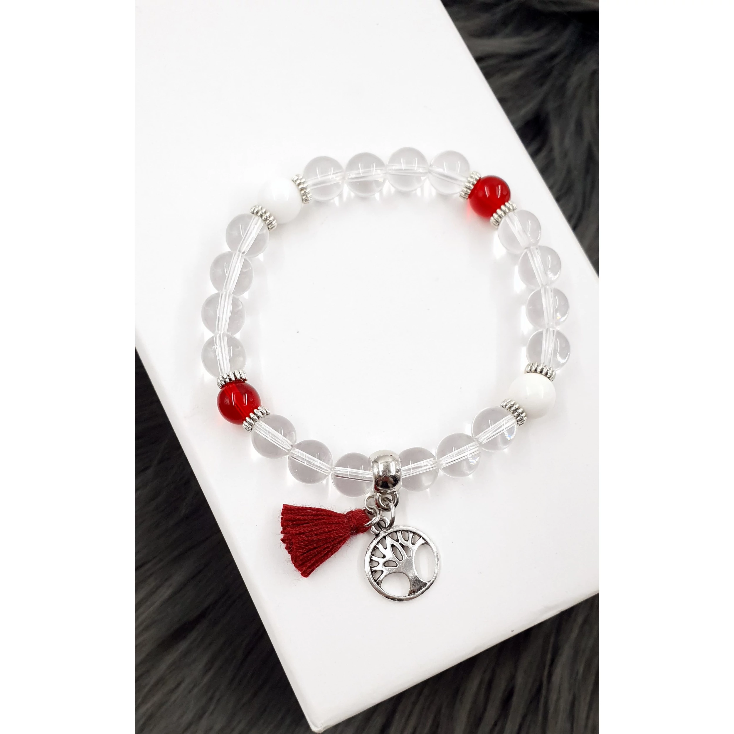 Gyönyörű csiszolt, 8mm-es Hegyikristály ásványokból készült karkötő, életfa medállal és egy bojttal díszítve.